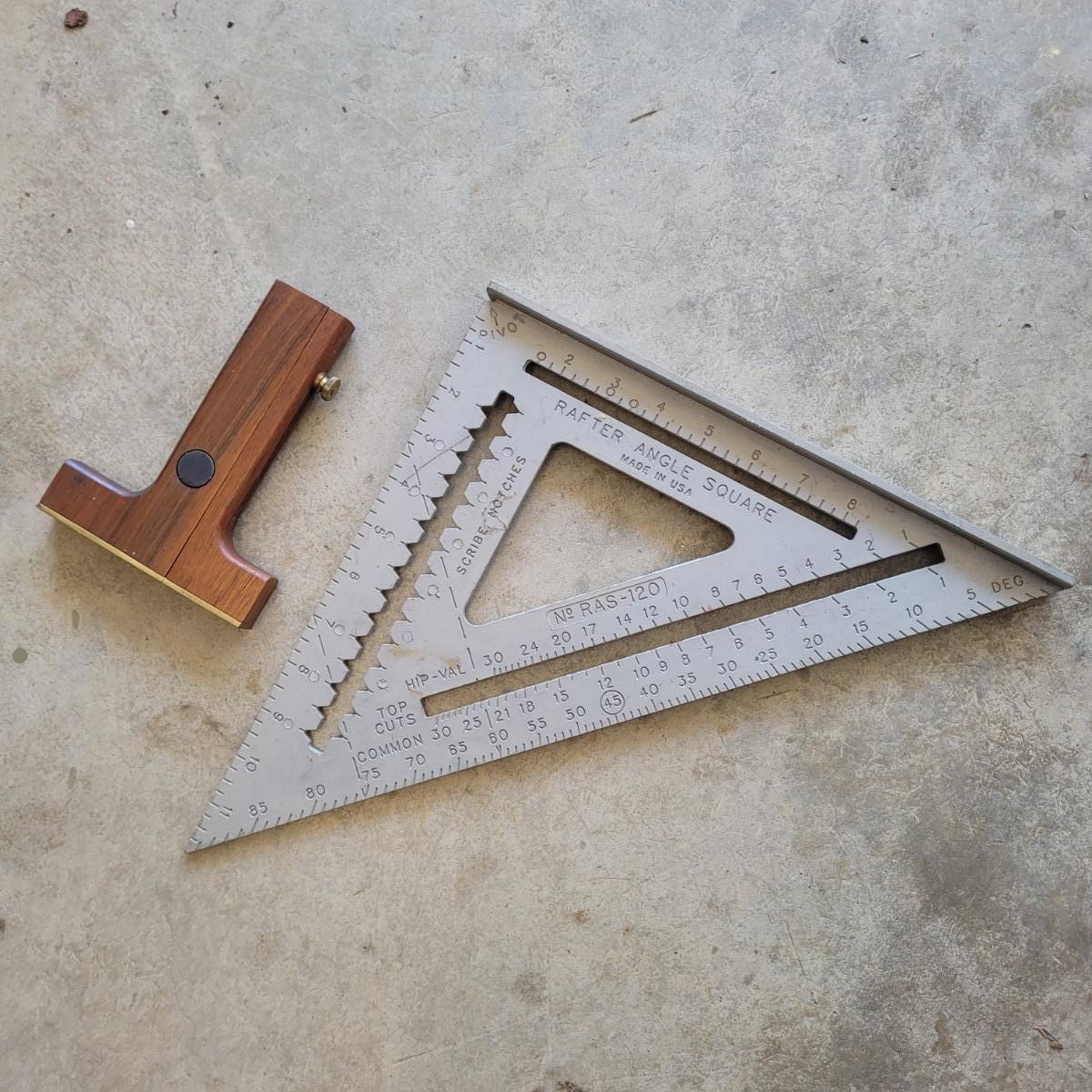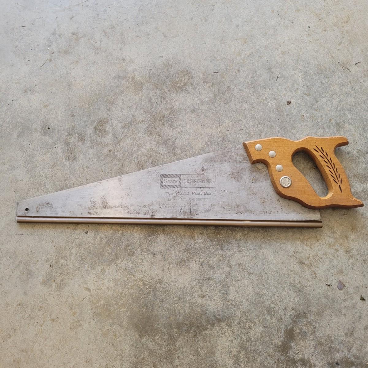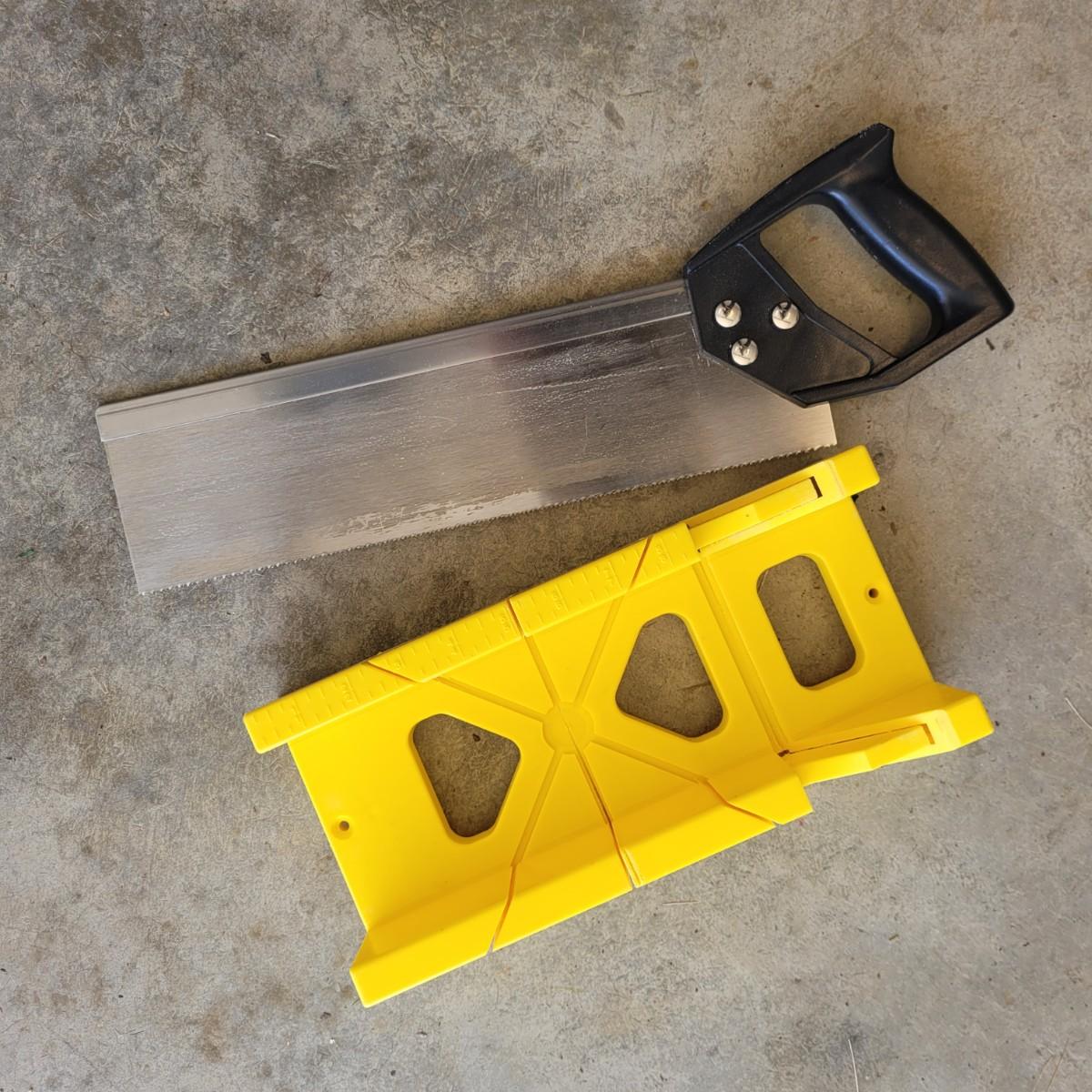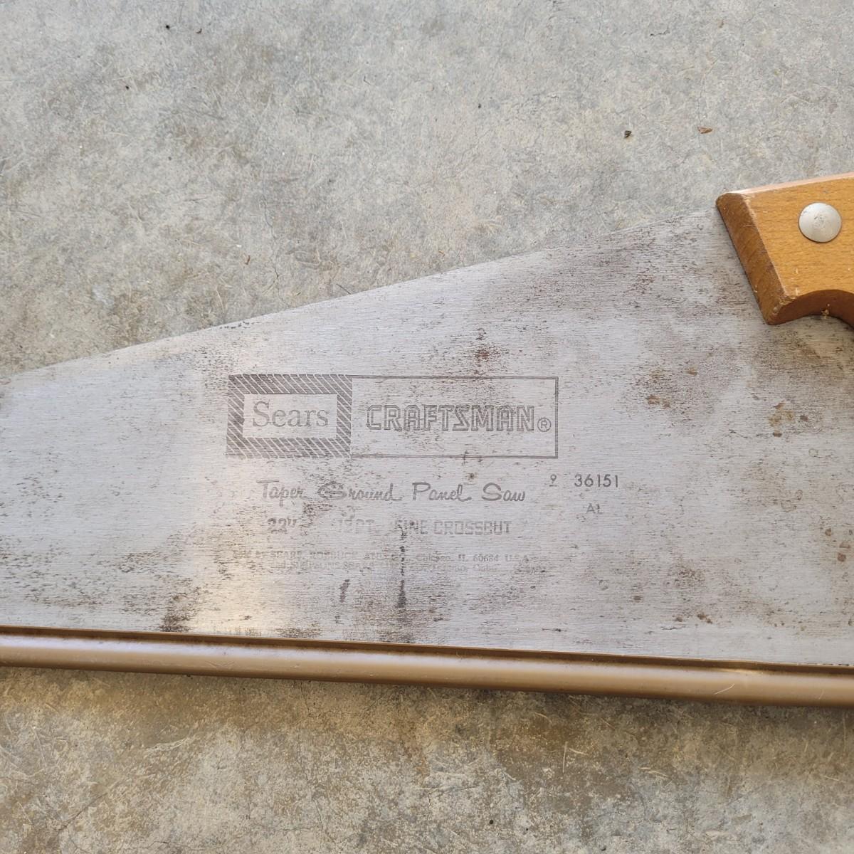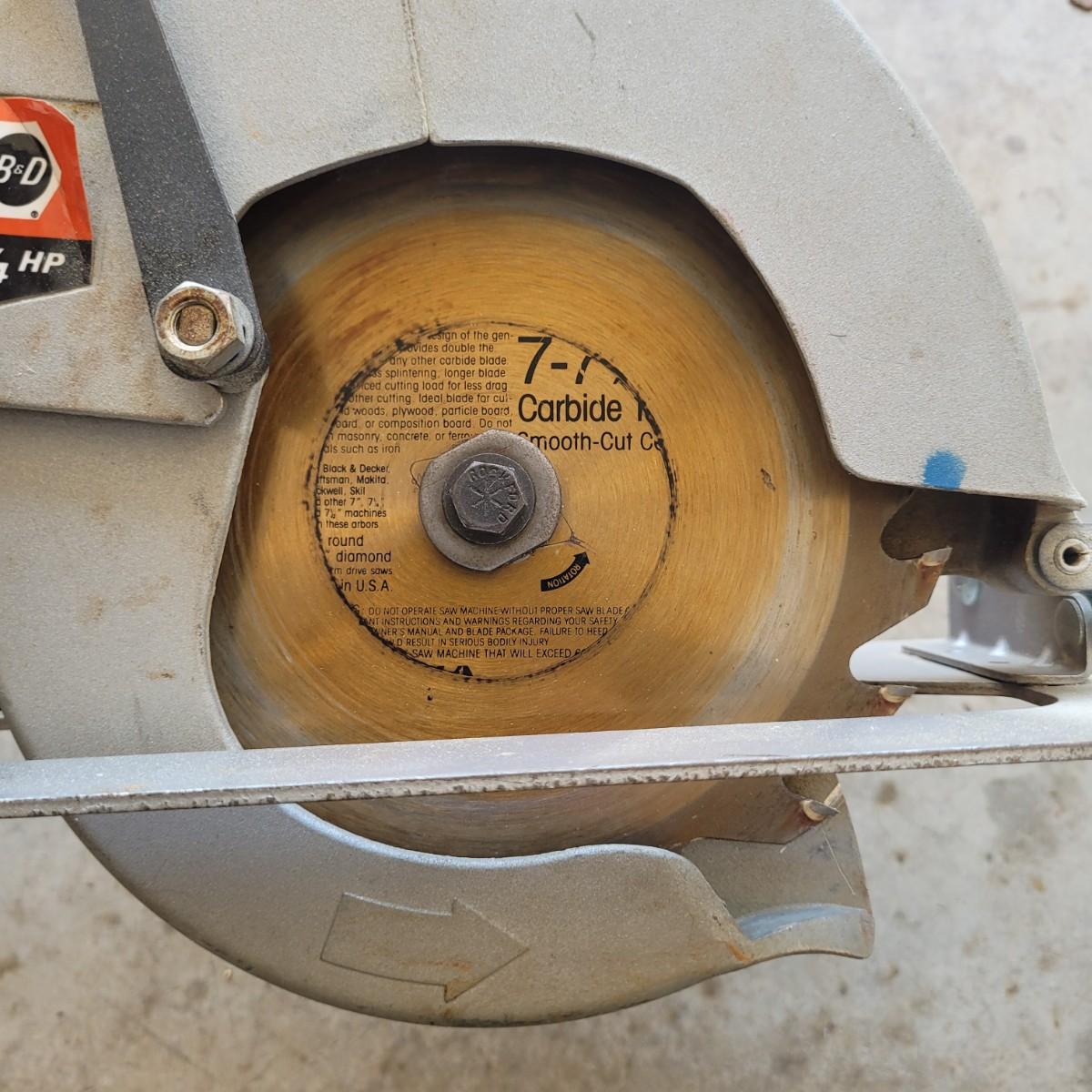 This lot includes multiple saws and wood Cutting tools. Included in this lot: a corded Black and Decker brand circular saw, four hand saws, a metal square tool, and a 12" mitre box for angled cuts. The power saw is 7-1/4" and turns on when plugged in. Three of the hand saws appear to be for wood, while one is for metal. The metal square is labeled as a rafter angle square. The mitre box includes box, but has been opened and used.