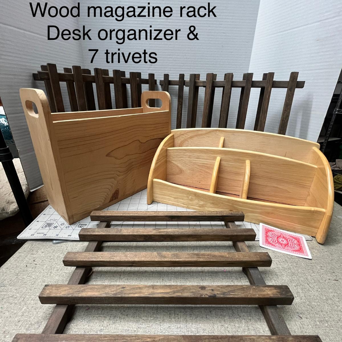 Wood Desk Organizer, Magazine Rack, and 7 Slatted Trivets
