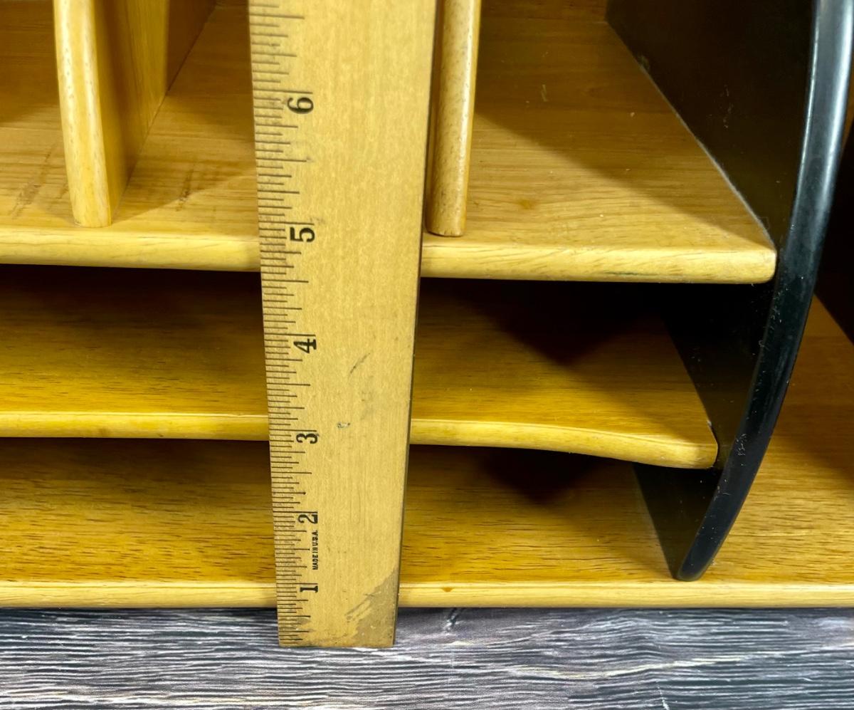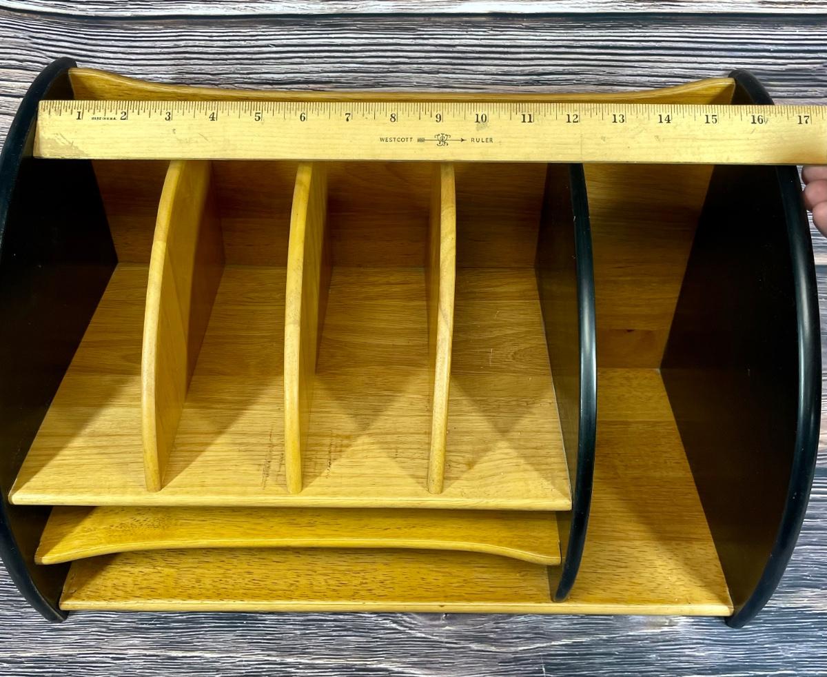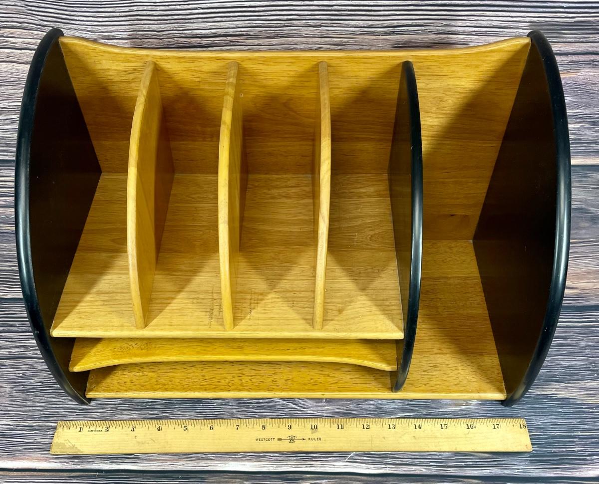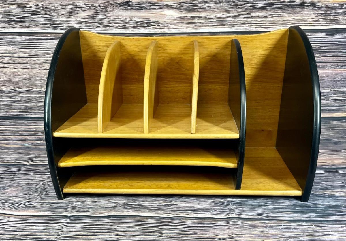 Wooden multi-compartment desktop organizer. Can be used to sort and organize bills, mail, printer paper and other small items. Made in China by Pomerania, measures approx 17” across, 11” tall and 8.5” deep.