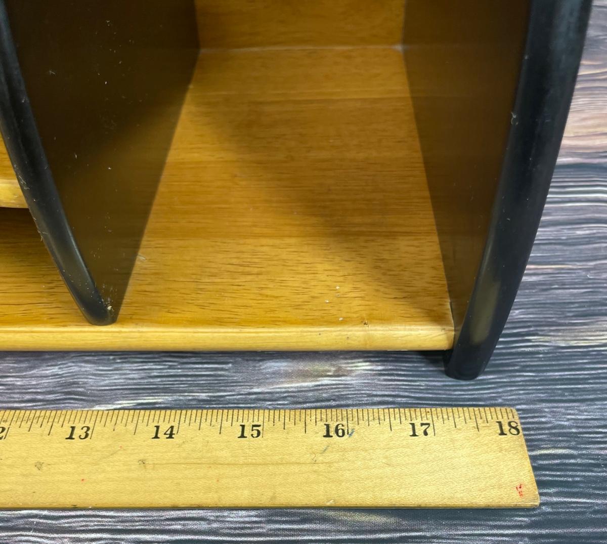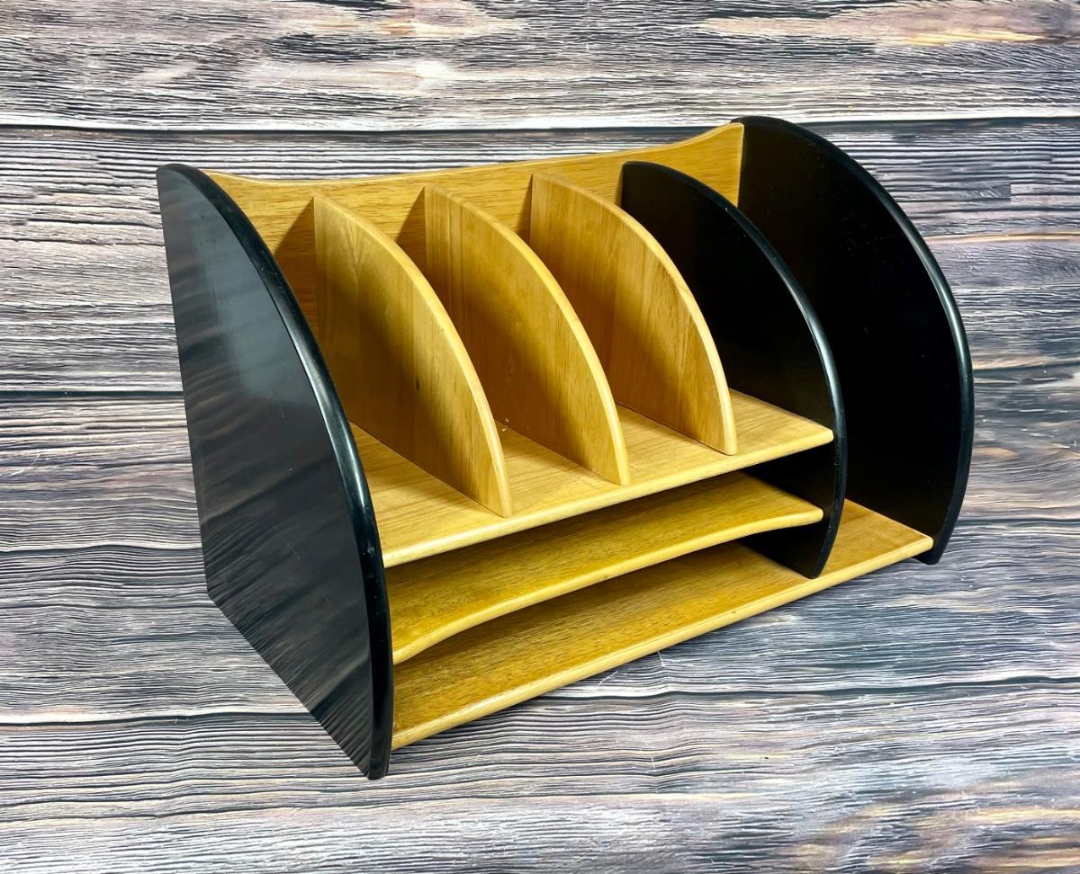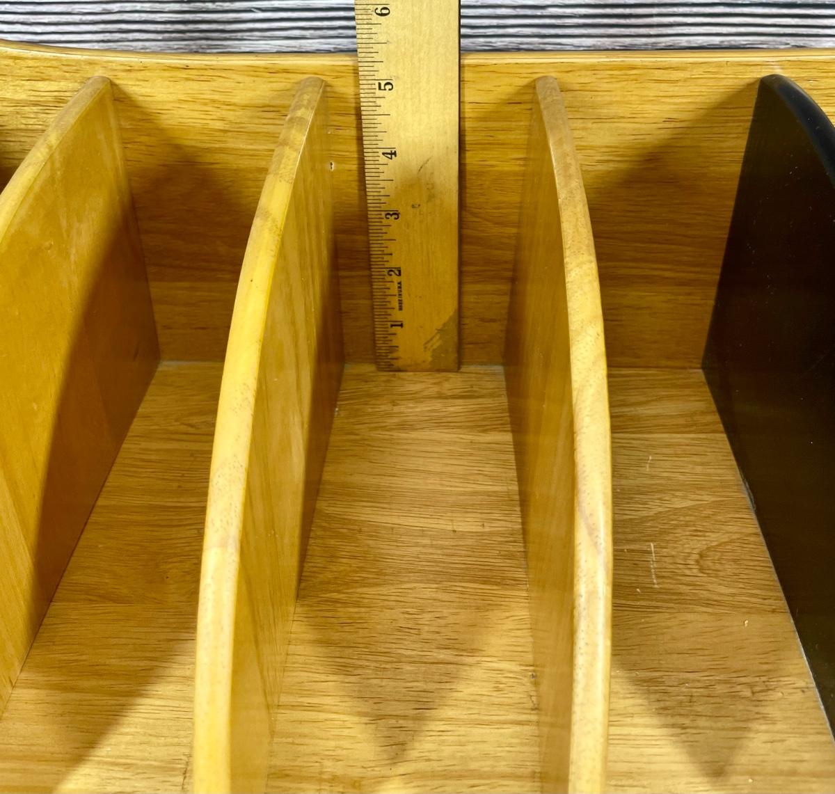 Wooden multi-compartment desktop organizer. Can be used to sort and organize bills, mail, printer paper and other small items. Made in China by Pomerania, measures approx 17” across, 11” tall and 8.5” deep.