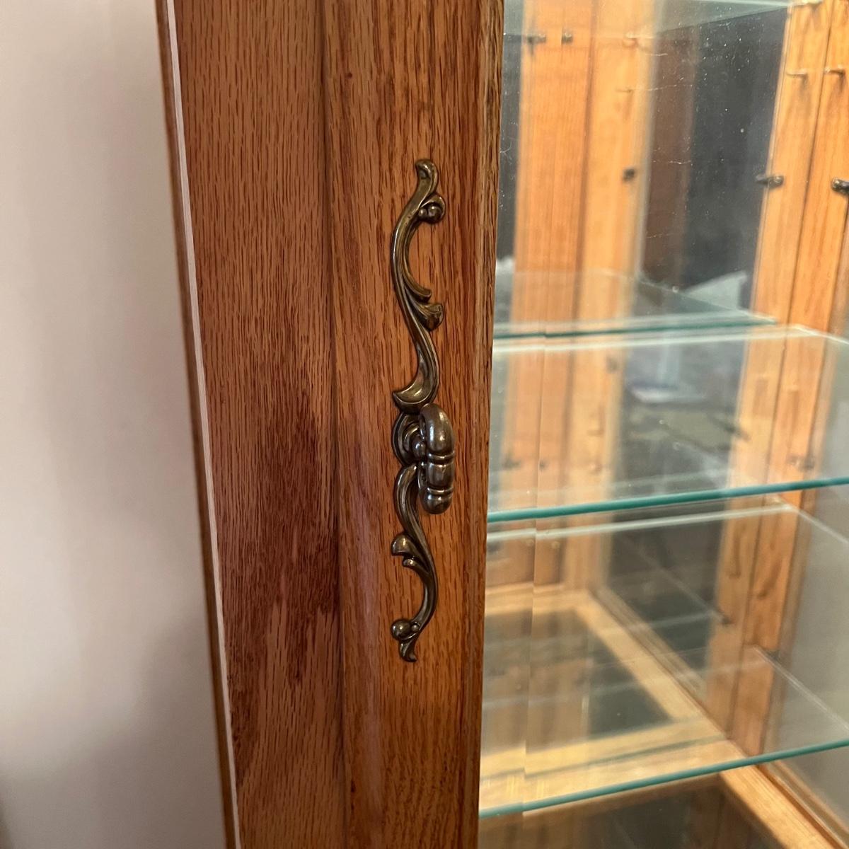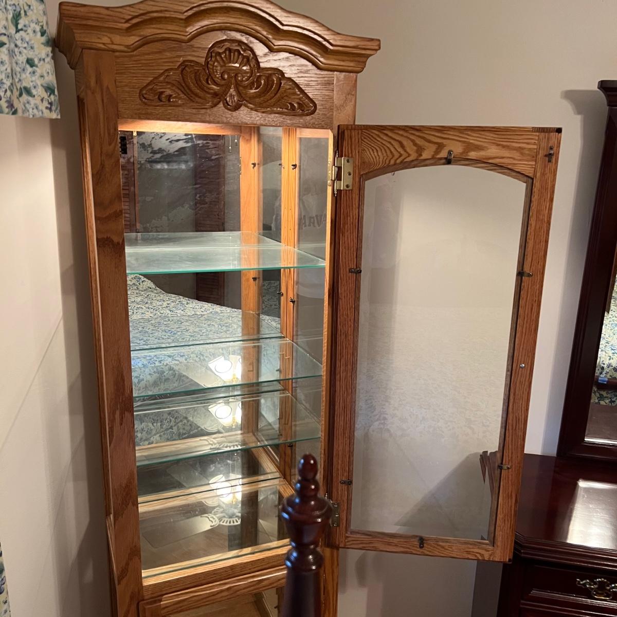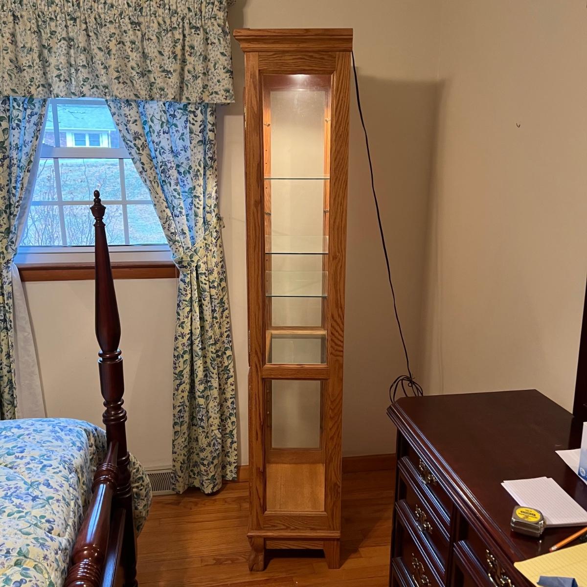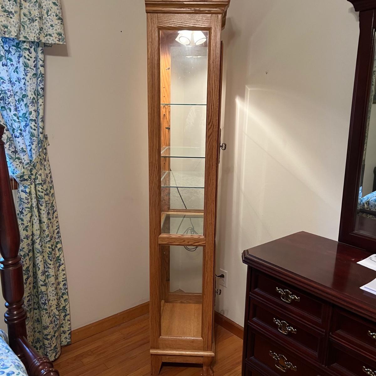 Tall wood display cabinet with brass hardware and clear glass shelves as well as an internal light. The cabinet is 20.5" x 13.5” x 79". The cabinet has an upper and lower display section. It includes three glass shelves with grooved ridges to stand up items such as plates. Each of the three glass shelves is 12” x 18.5”.