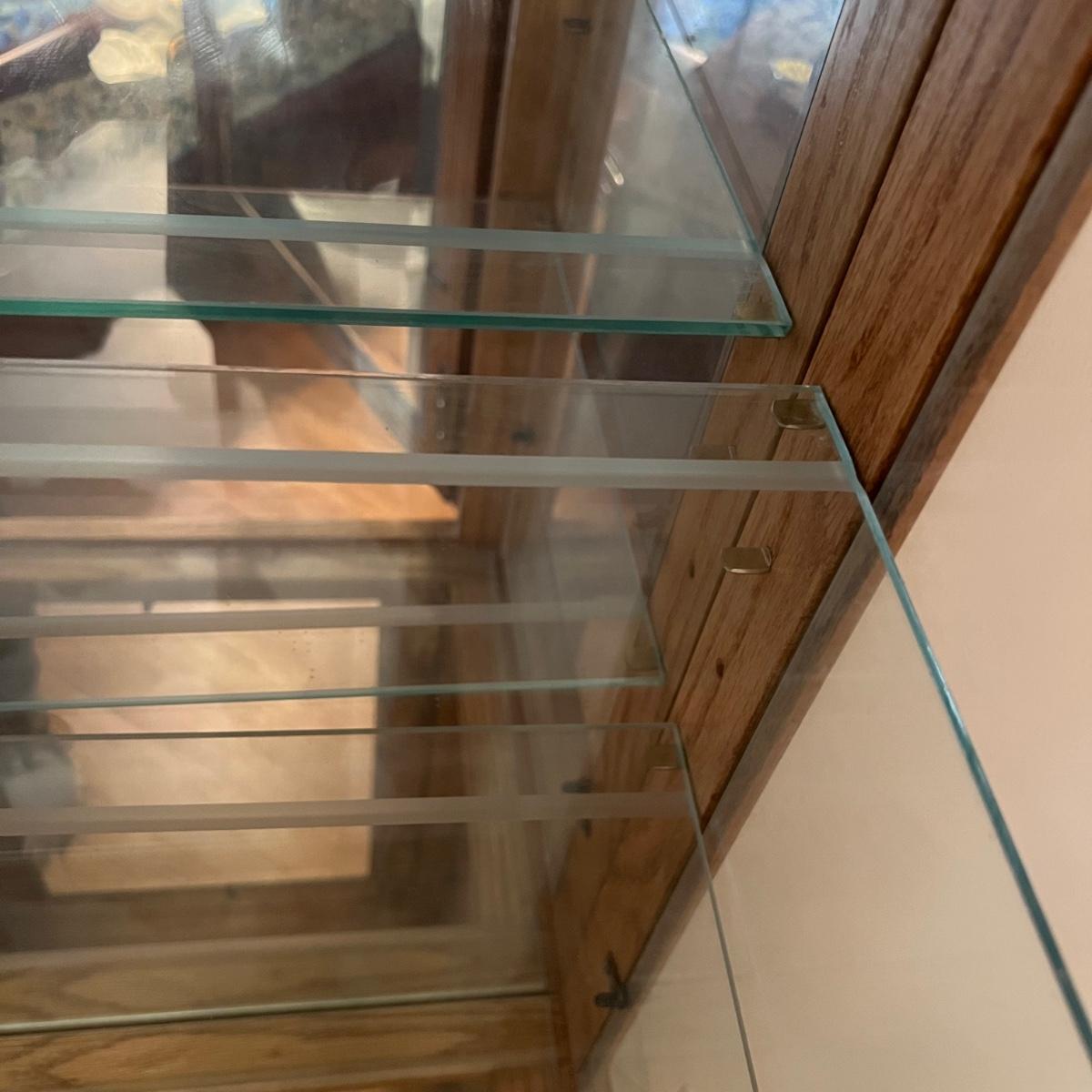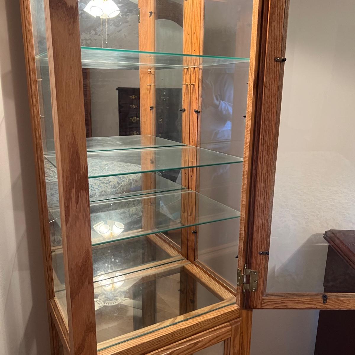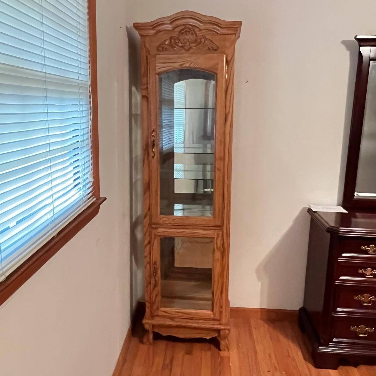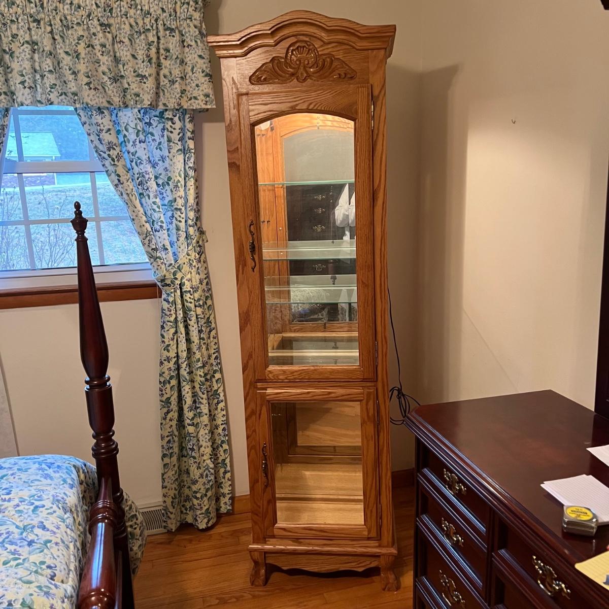 Tall wood display cabinet with brass hardware and clear glass shelves as well as an internal light. The cabinet is 20.5" x 13.5” x 79". The cabinet has an upper and lower display section. It includes three glass shelves with grooved ridges to stand up items such as plates. Each of the three glass shelves is 12” x 18.5”.