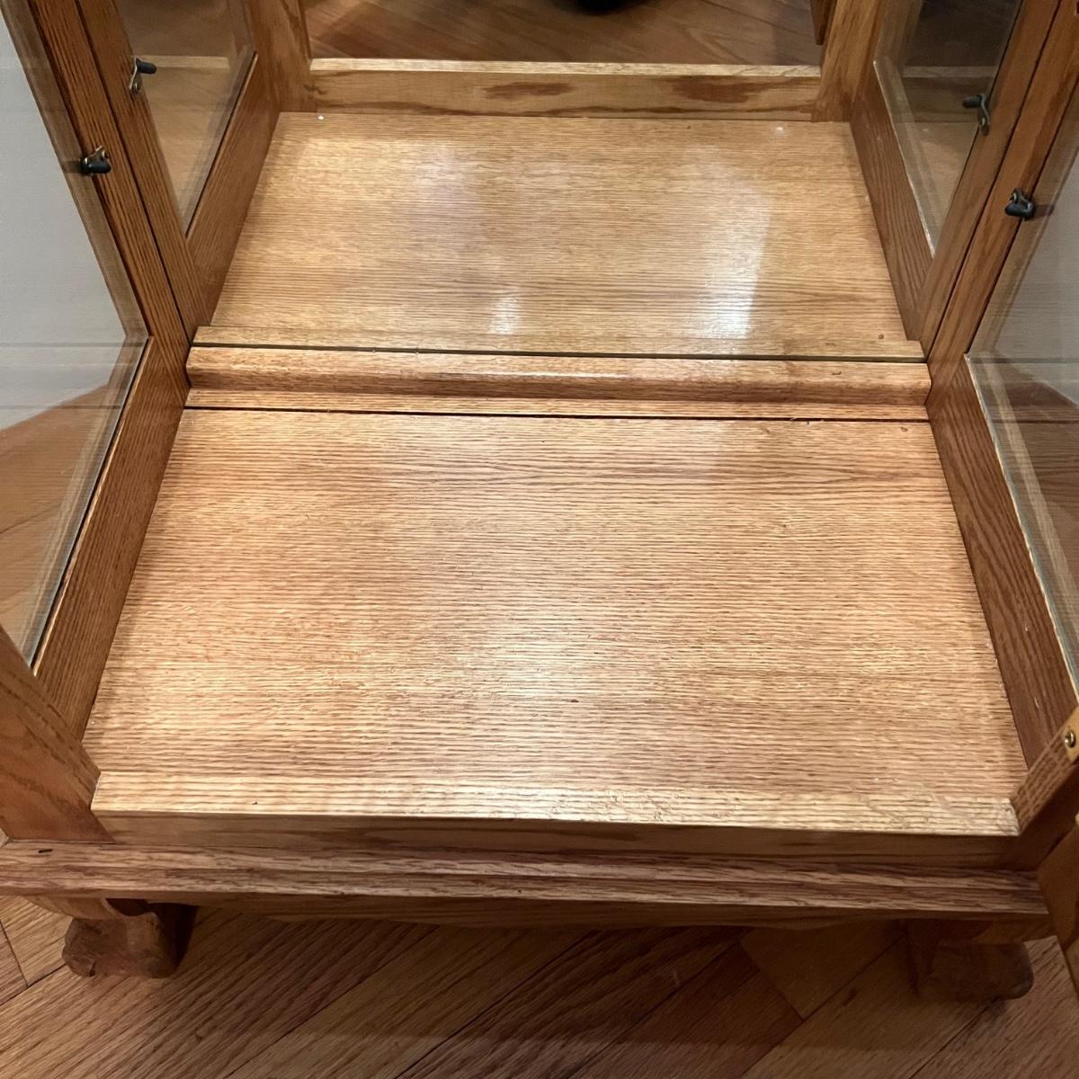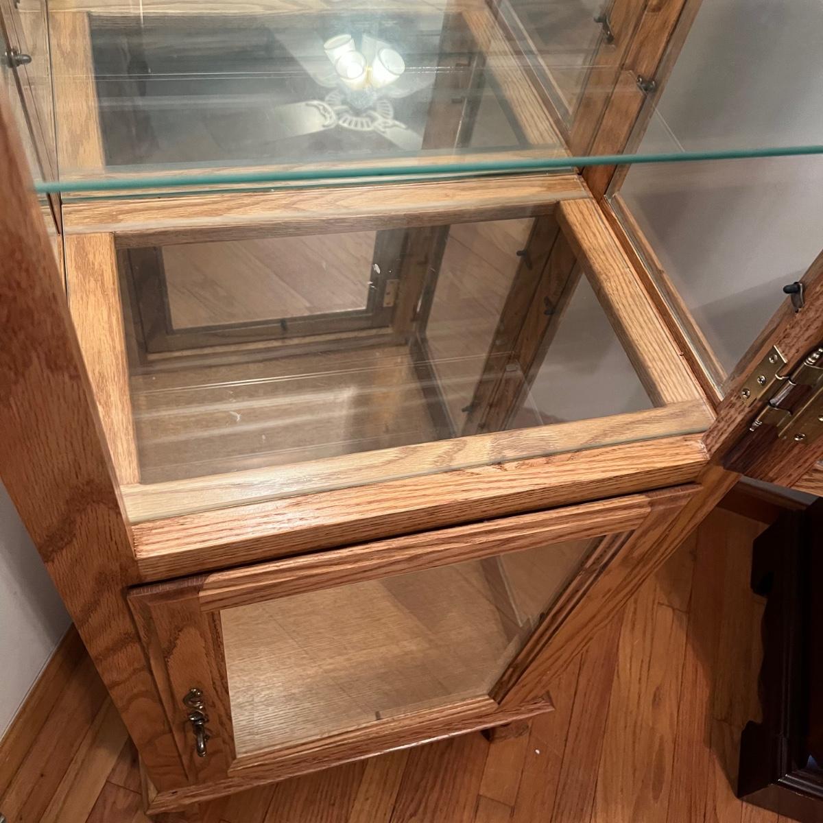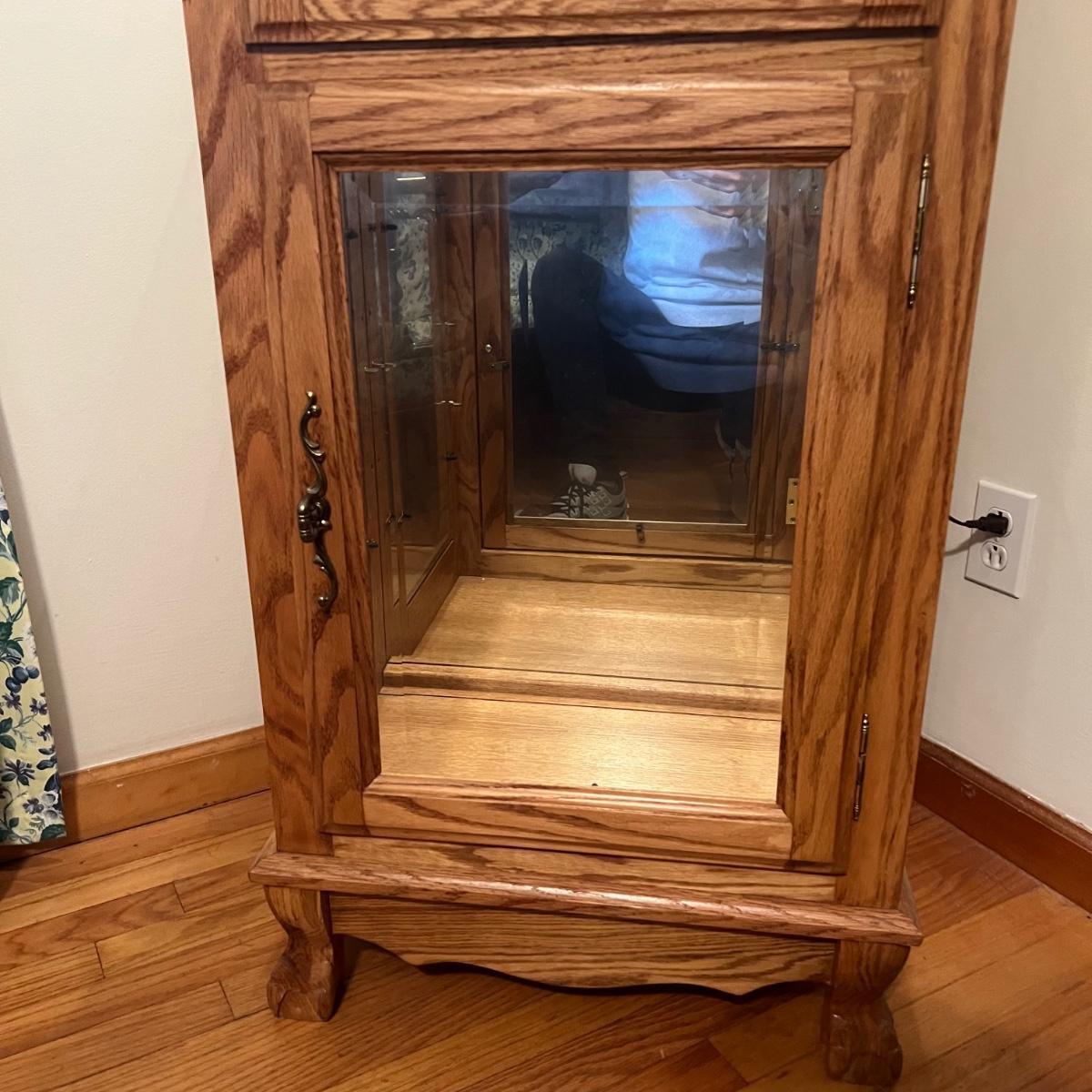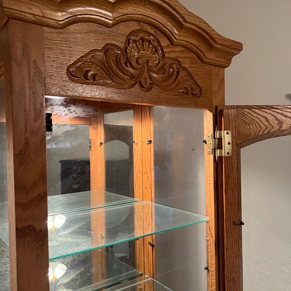 Tall wood display cabinet with brass hardware and clear glass shelves as well as an internal light. The cabinet is 20.5" x 13.5” x 79". The cabinet has an upper and lower display section. It includes three glass shelves with grooved ridges to stand up items such as plates. Each of the three glass shelves is 12” x 18.5”.