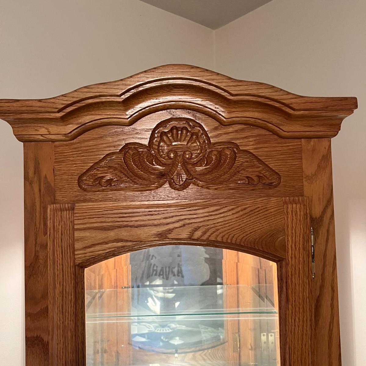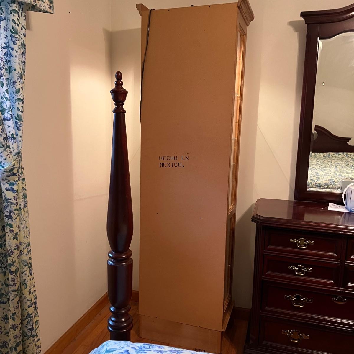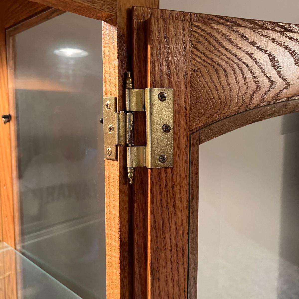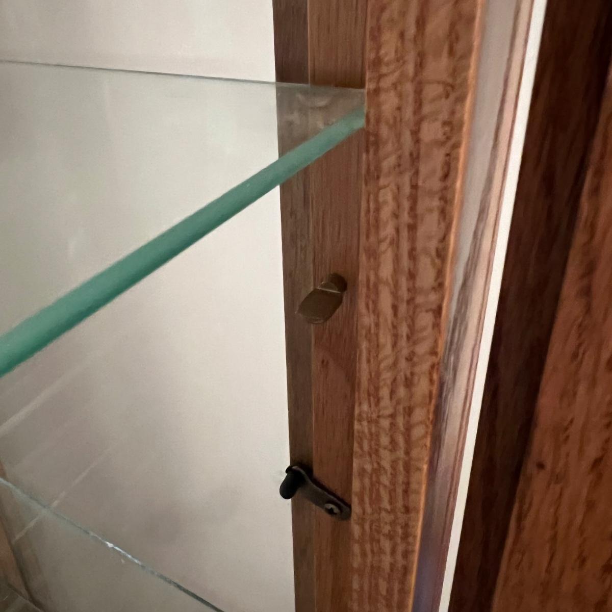 Tall wood display cabinet with brass hardware and clear glass shelves as well as an internal light. The cabinet is 20.5" x 13.5” x 79". The cabinet has an upper and lower display section. It includes three glass shelves with grooved ridges to stand up items such as plates. Each of the three glass shelves is 12” x 18.5”.