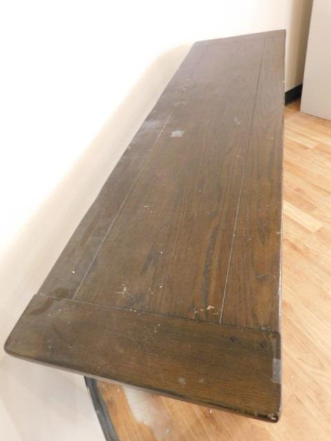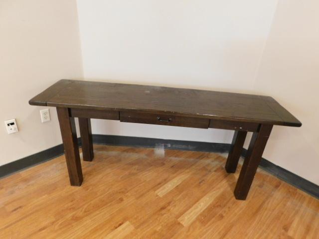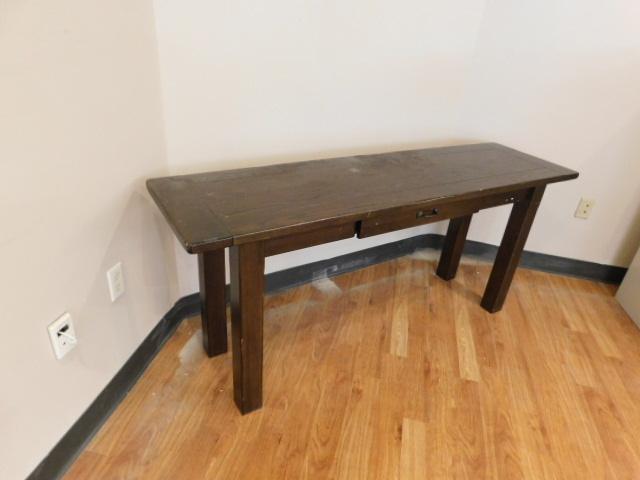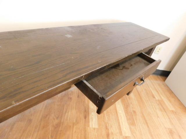 Wood Display Table with Drawer 69"x19"x30". Nice display table both contemporary or primitive style depending on retail application. Surface has some scratches and wear. Nice large table. Sturdy.