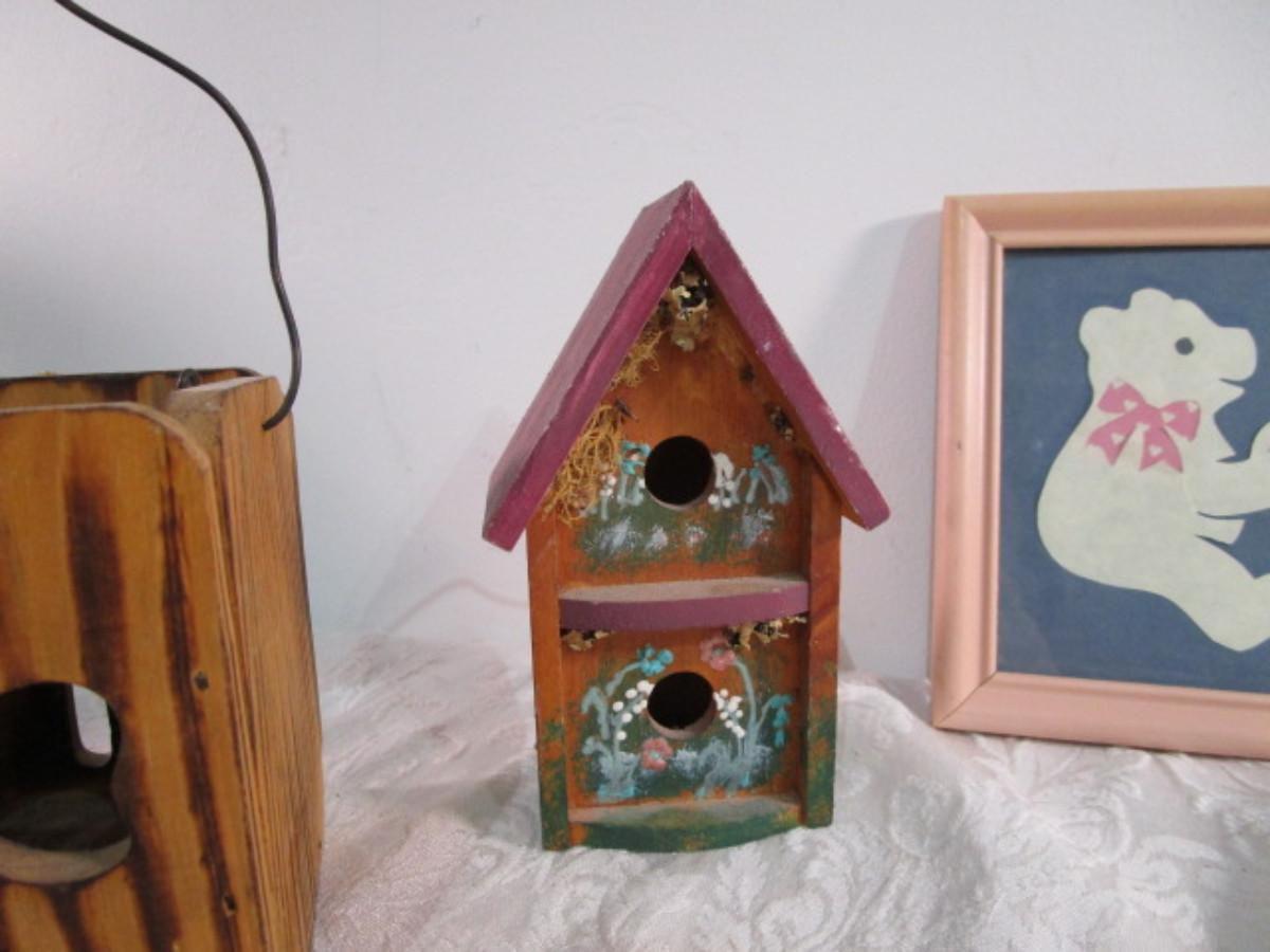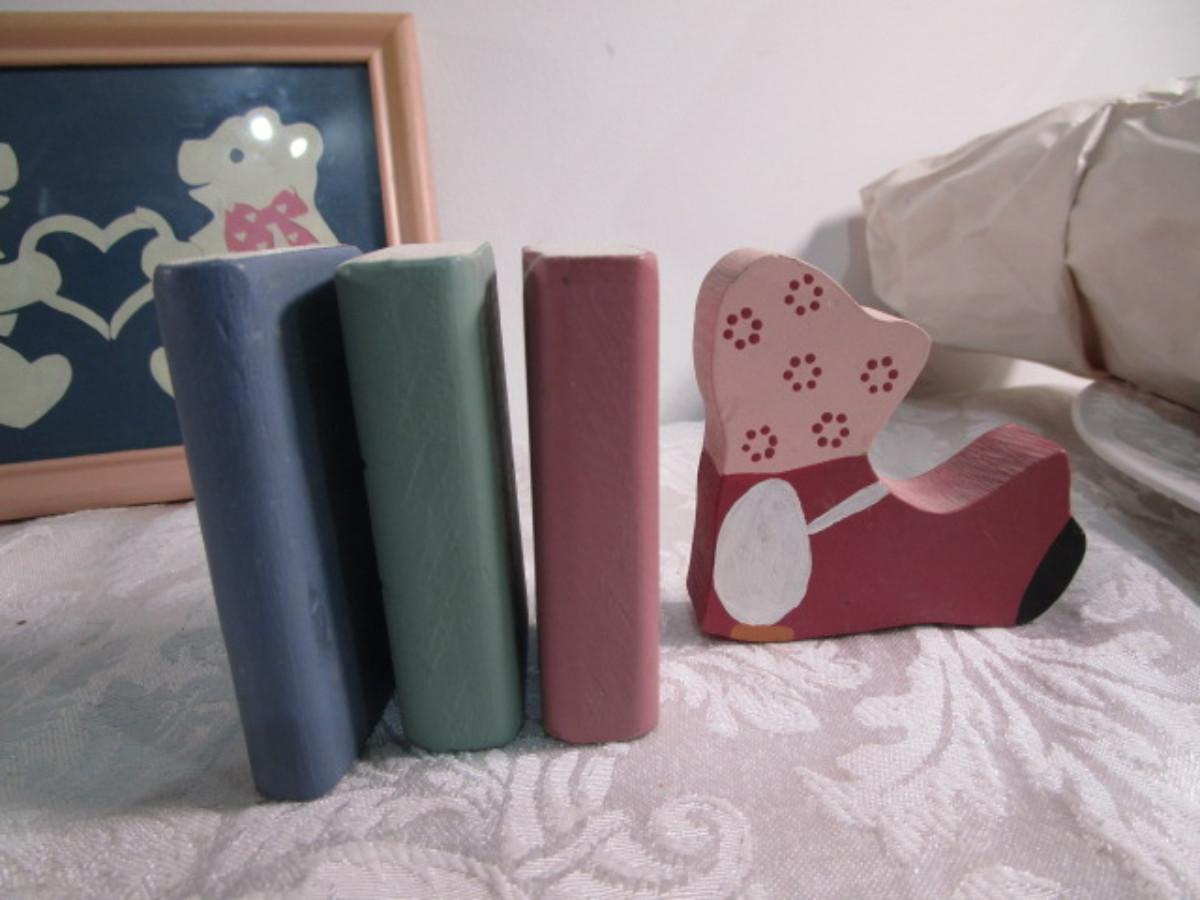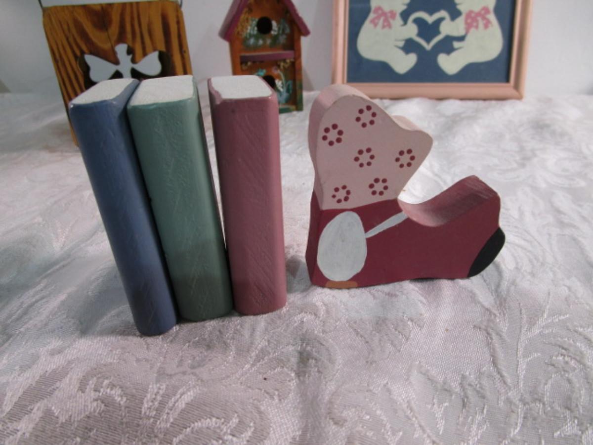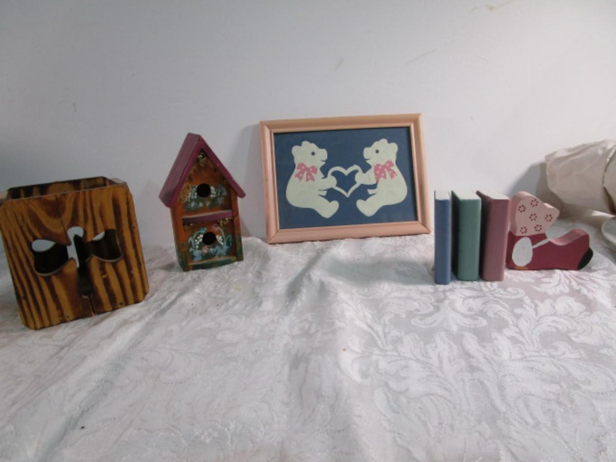Wood dolly & books, wood birdhouse & candle holder, bear picture