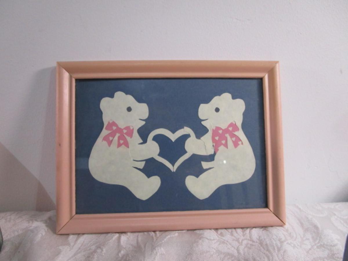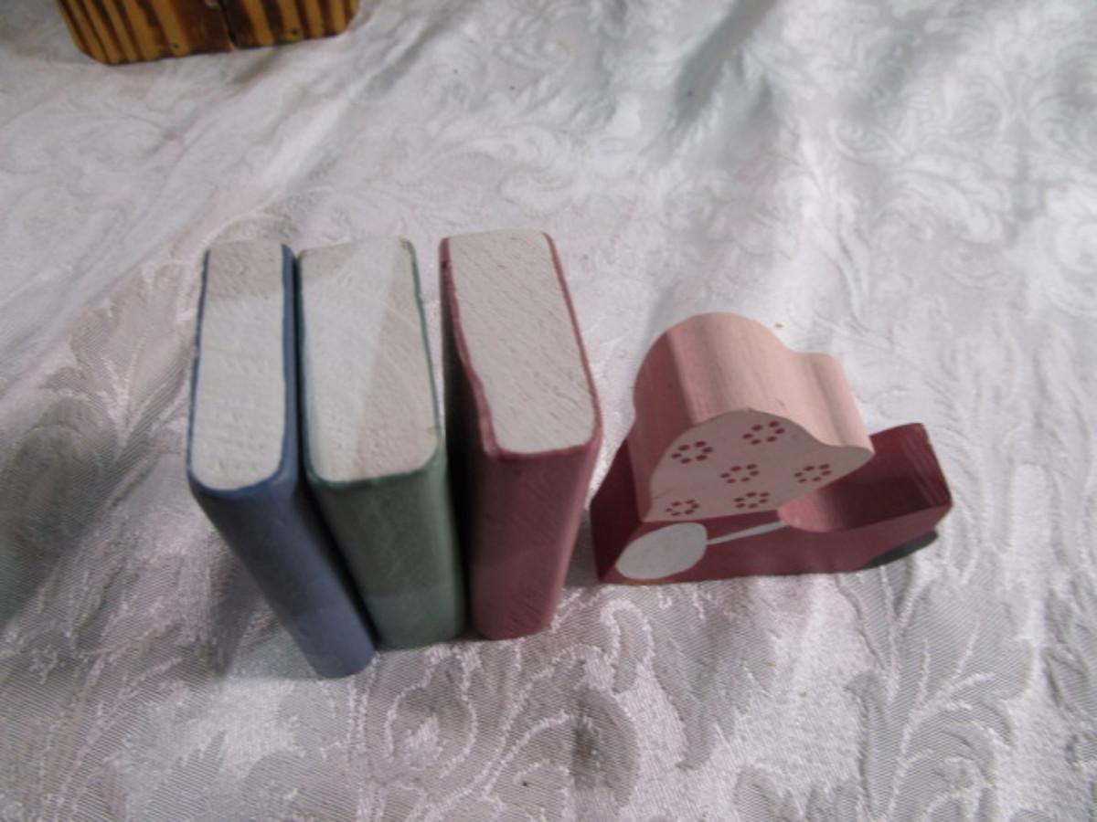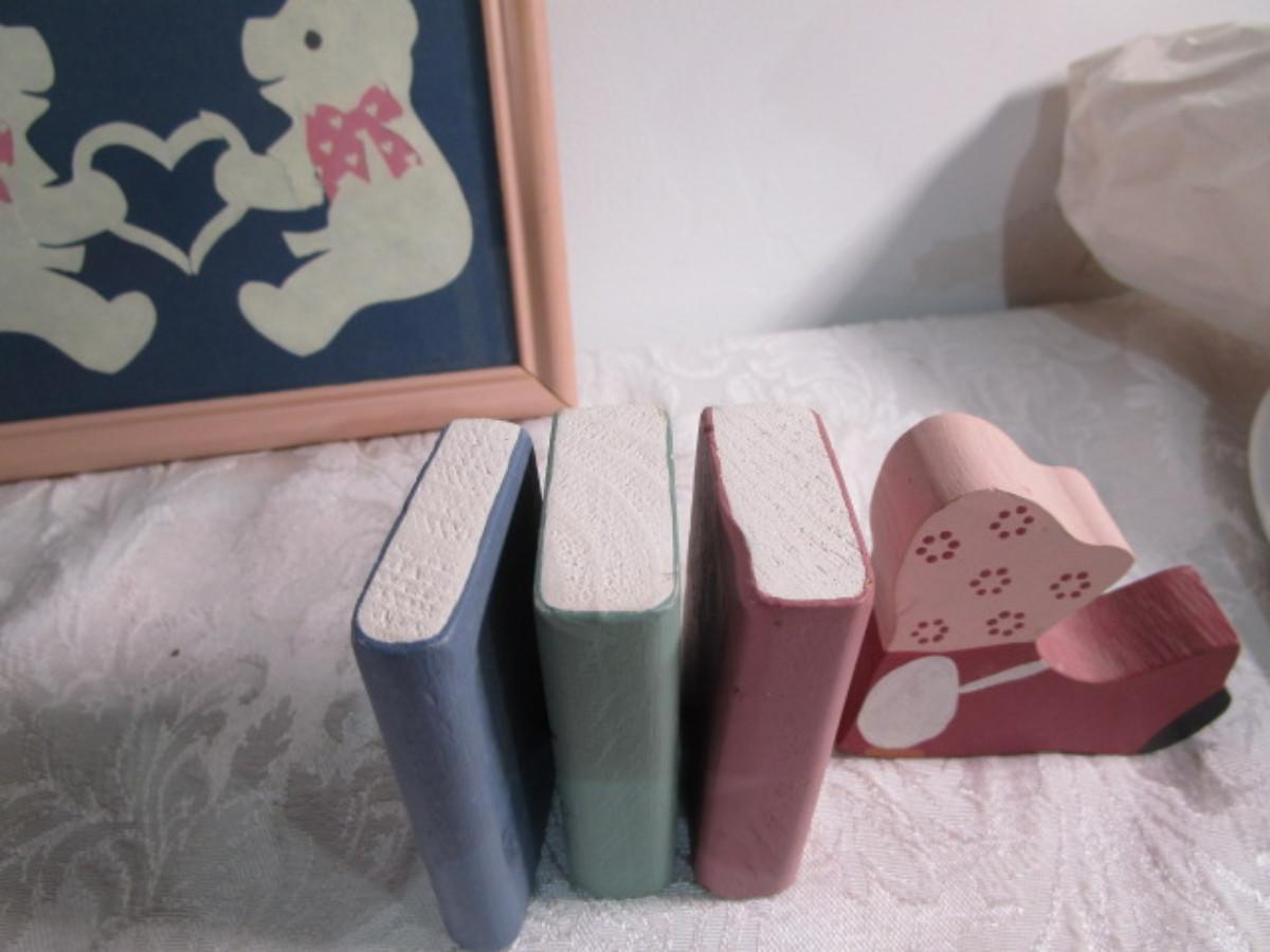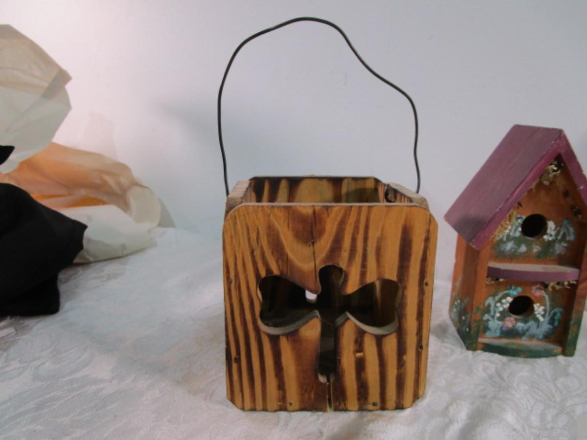 Wood dolly & books, wood birdhouse & candle holder, bear picture