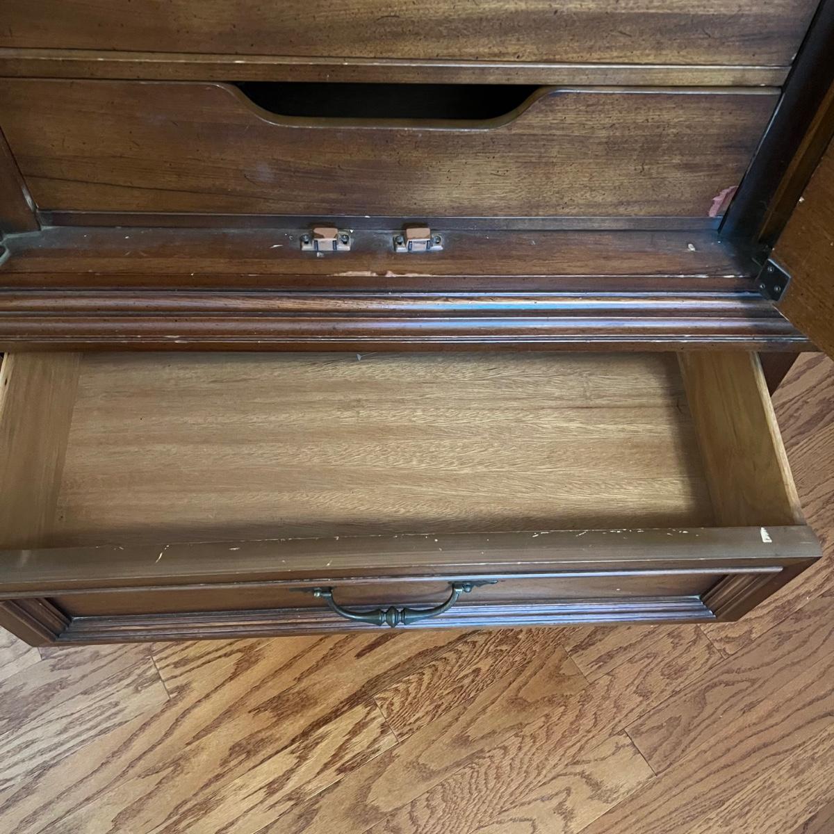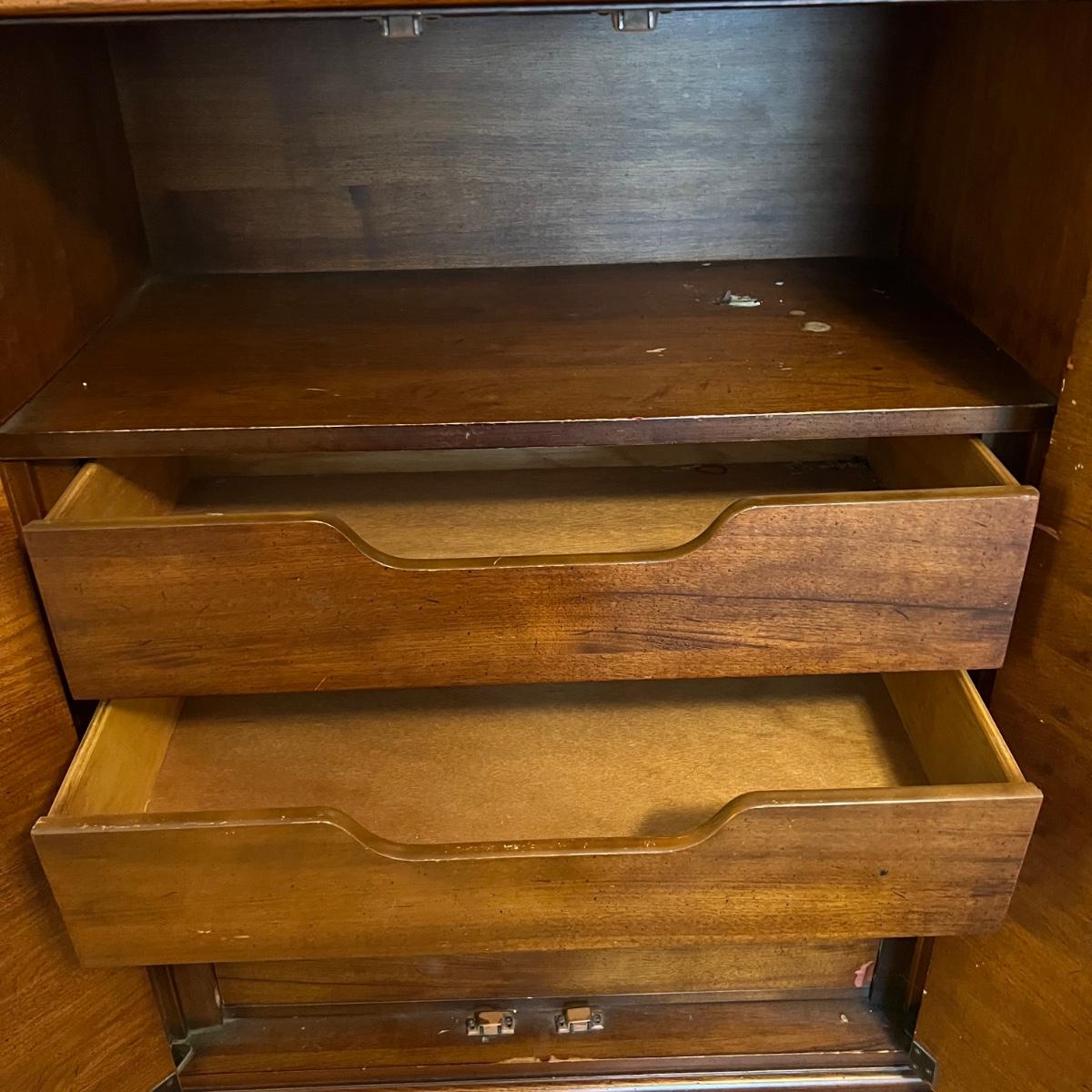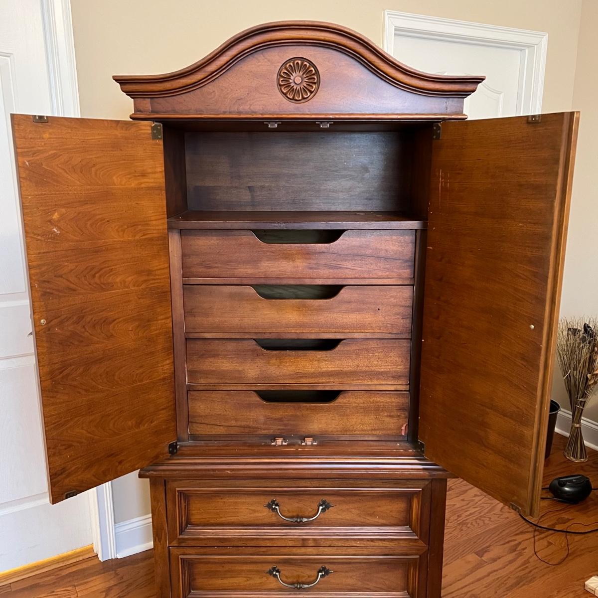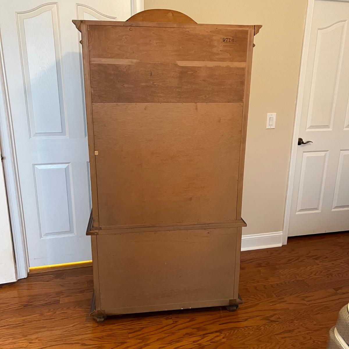 Wood dresser with armoire style doors. Two larger drawers at bottom and four smaller drawers inside cabinet top. Hardware appears to be aged brass metal. It measures 37.25” X 17.5” x 73.5”H. A substance is stuck to the top shelf that appears to be cleanable. Local pickup only. Winning bidder must bring assistance to help move and load this item due to its weight and/or size.
