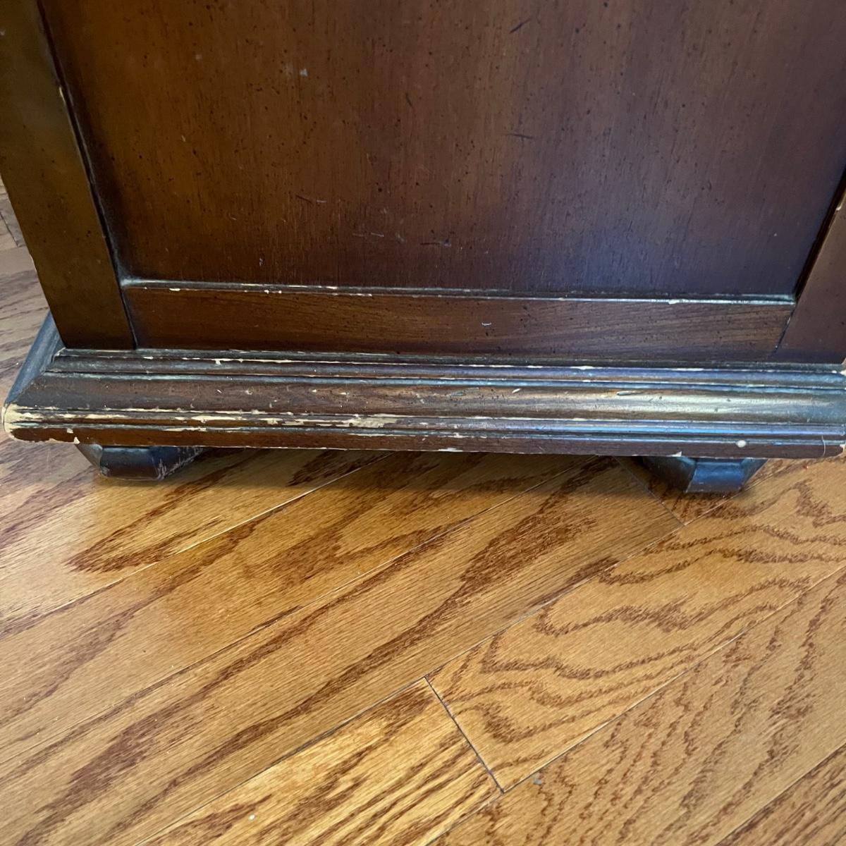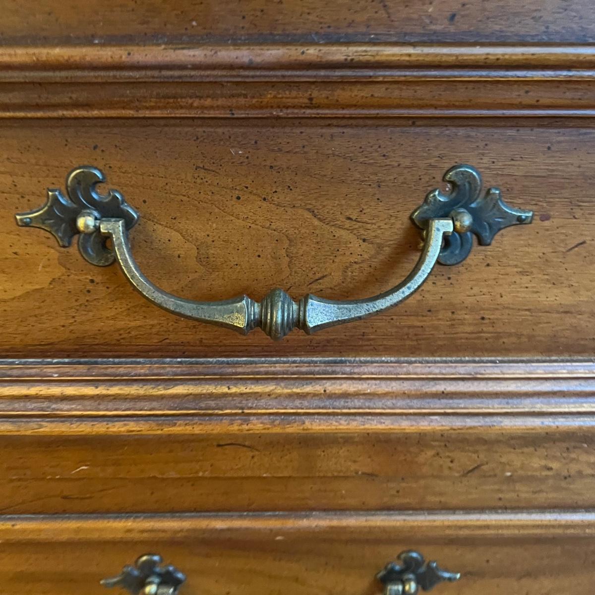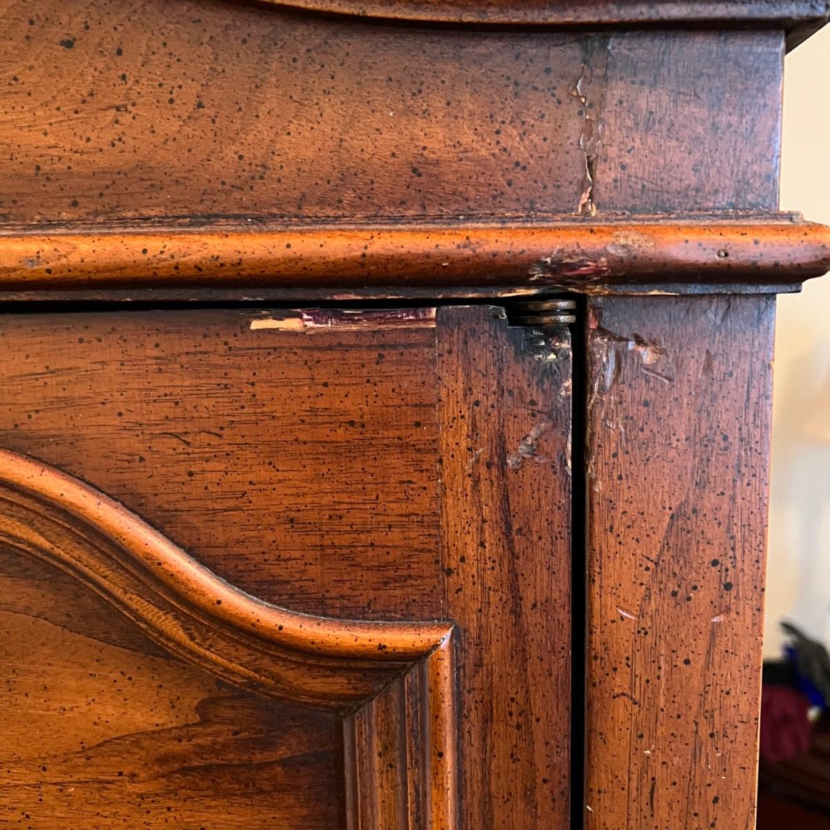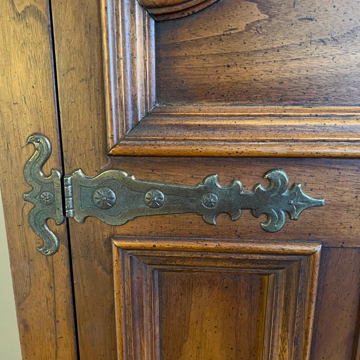 Wood dresser with armoire style doors. Two larger drawers at bottom and four smaller drawers inside cabinet top. Hardware appears to be aged brass metal. It measures 37.25” X 17.5” x 73.5”H. A substance is stuck to the top shelf that appears to be cleanable. Local pickup only. Winning bidder must bring assistance to help move and load this item due to its weight and/or size.