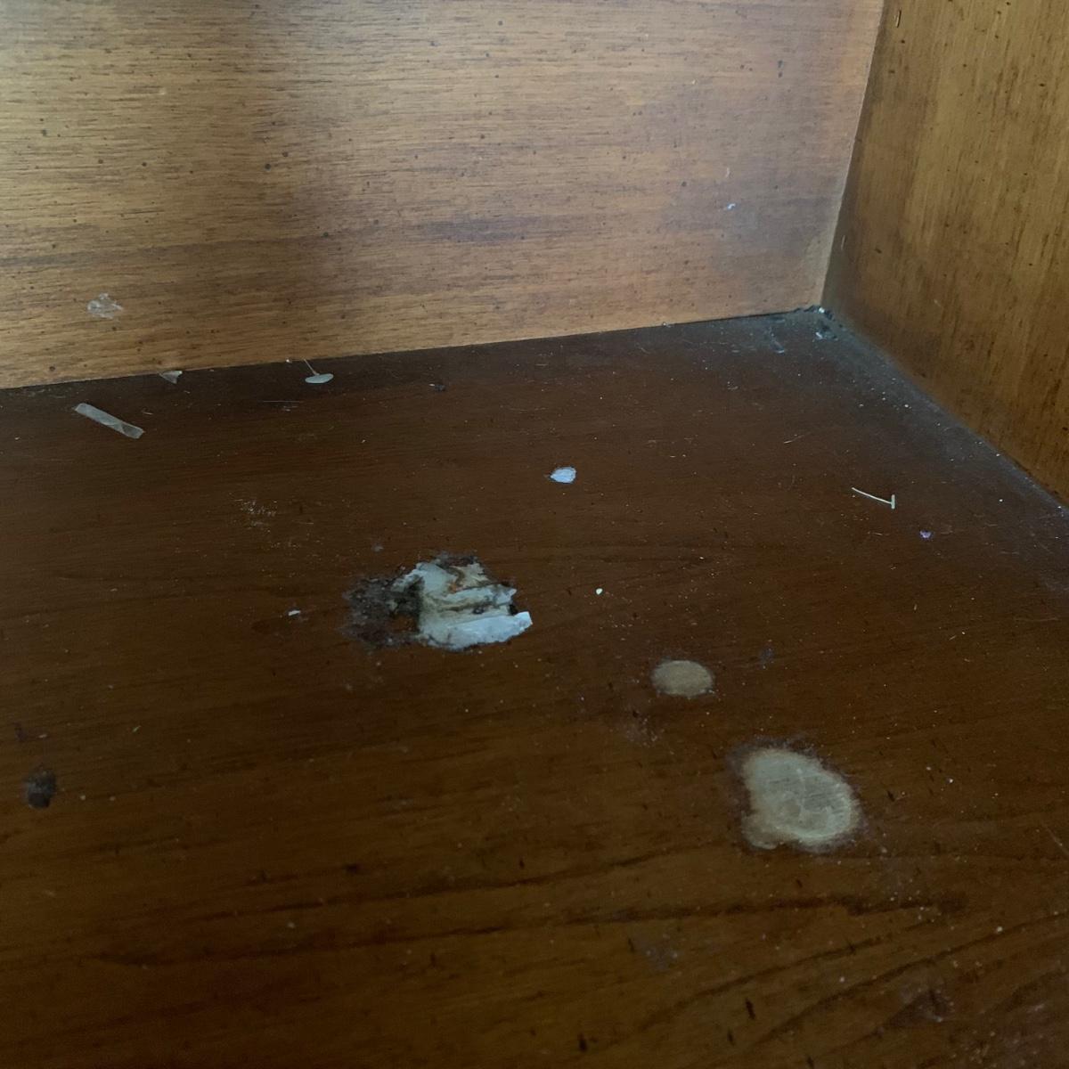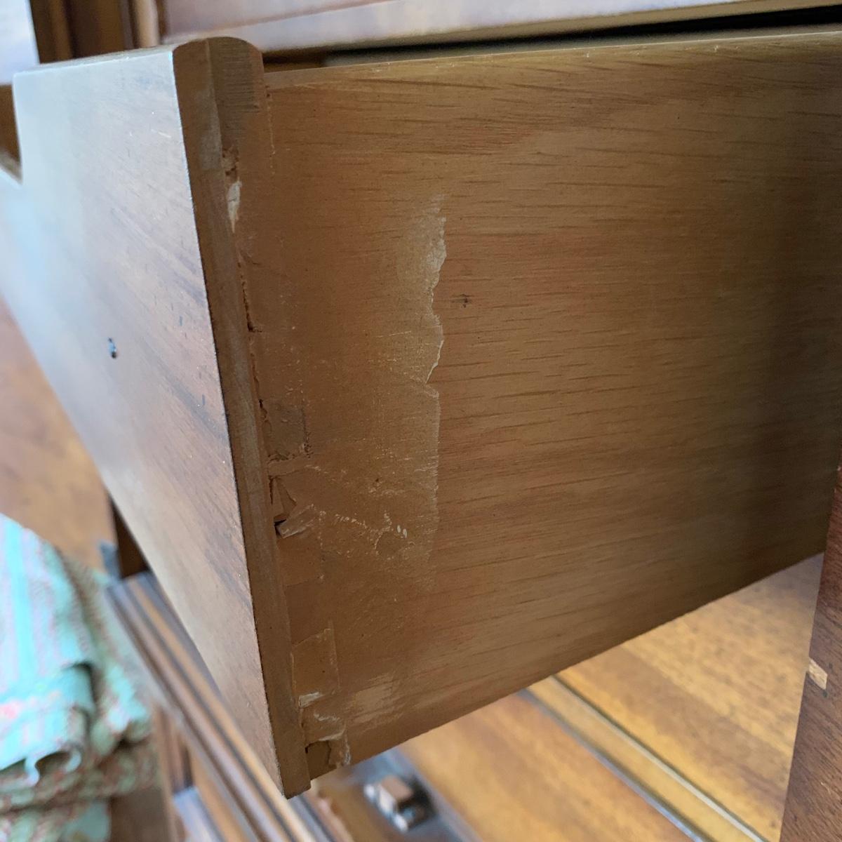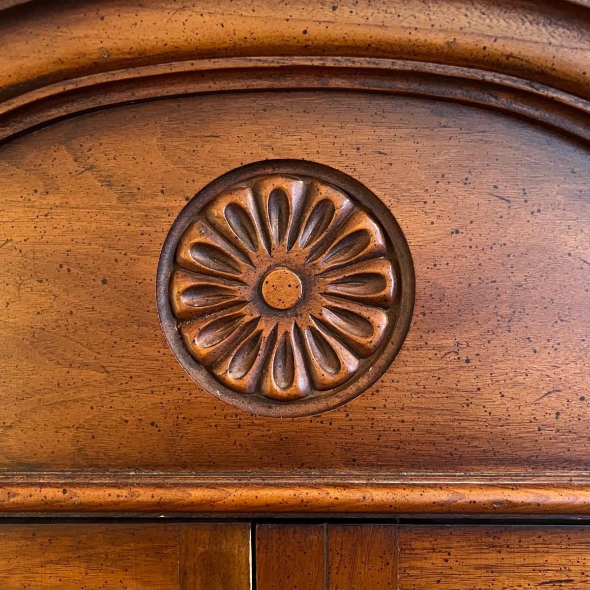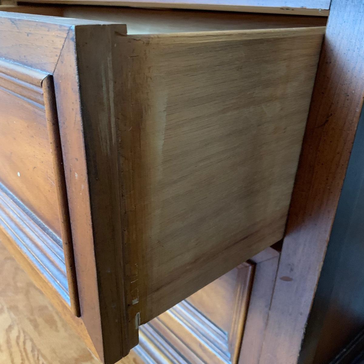 Wood dresser with armoire style doors. Two larger drawers at bottom and four smaller drawers inside cabinet top. Hardware appears to be aged brass metal. It measures 37.25” X 17.5” x 73.5”H. A substance is stuck to the top shelf that appears to be cleanable. Local pickup only. Winning bidder must bring assistance to help move and load this item due to its weight and/or size.