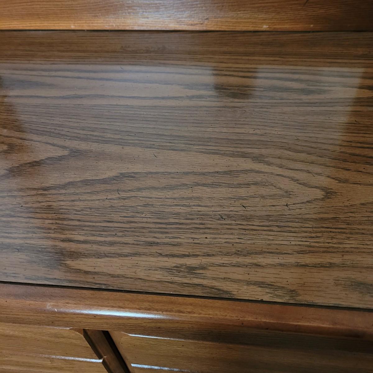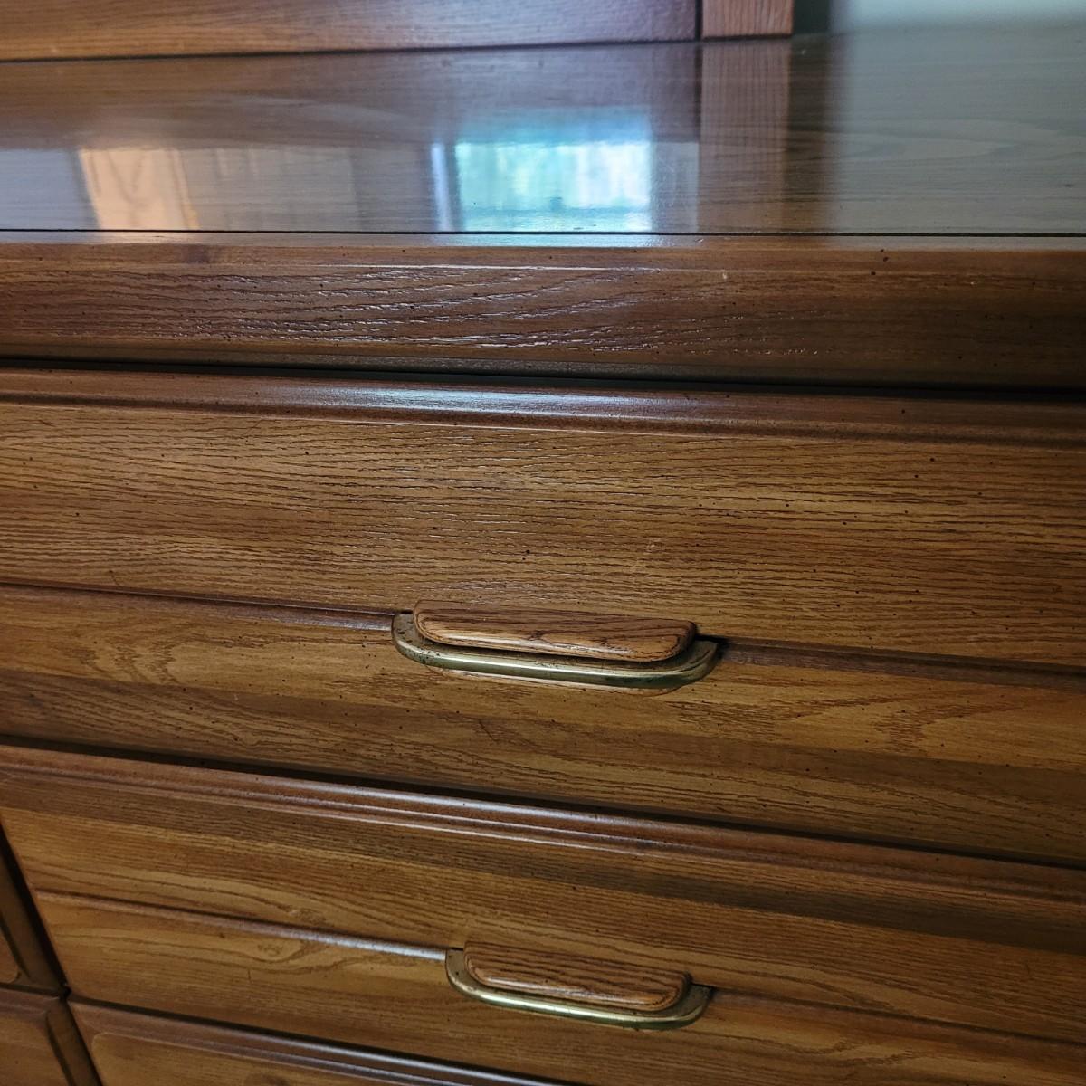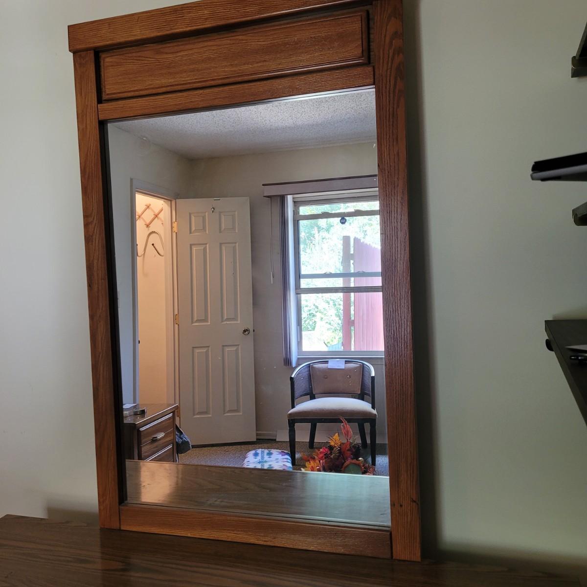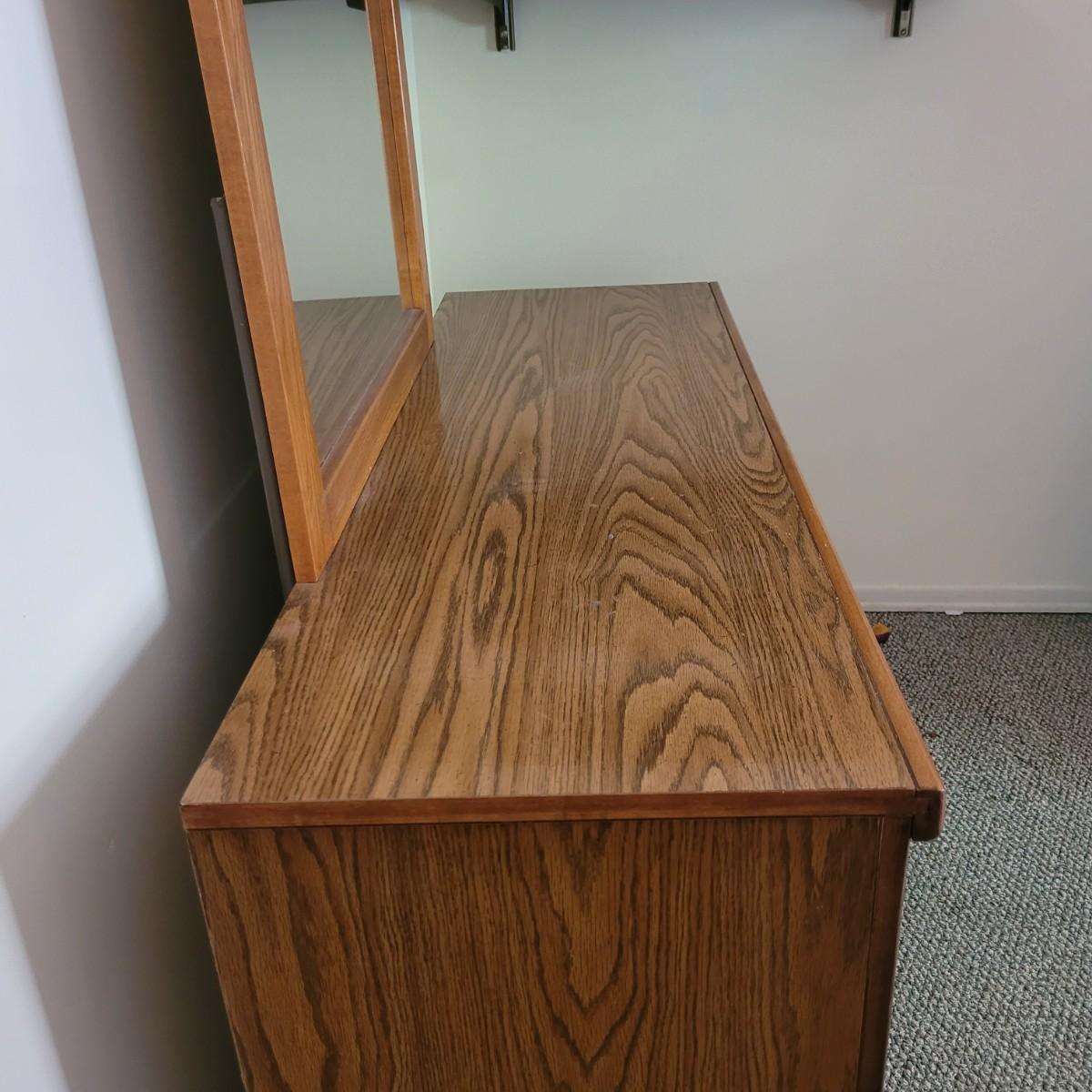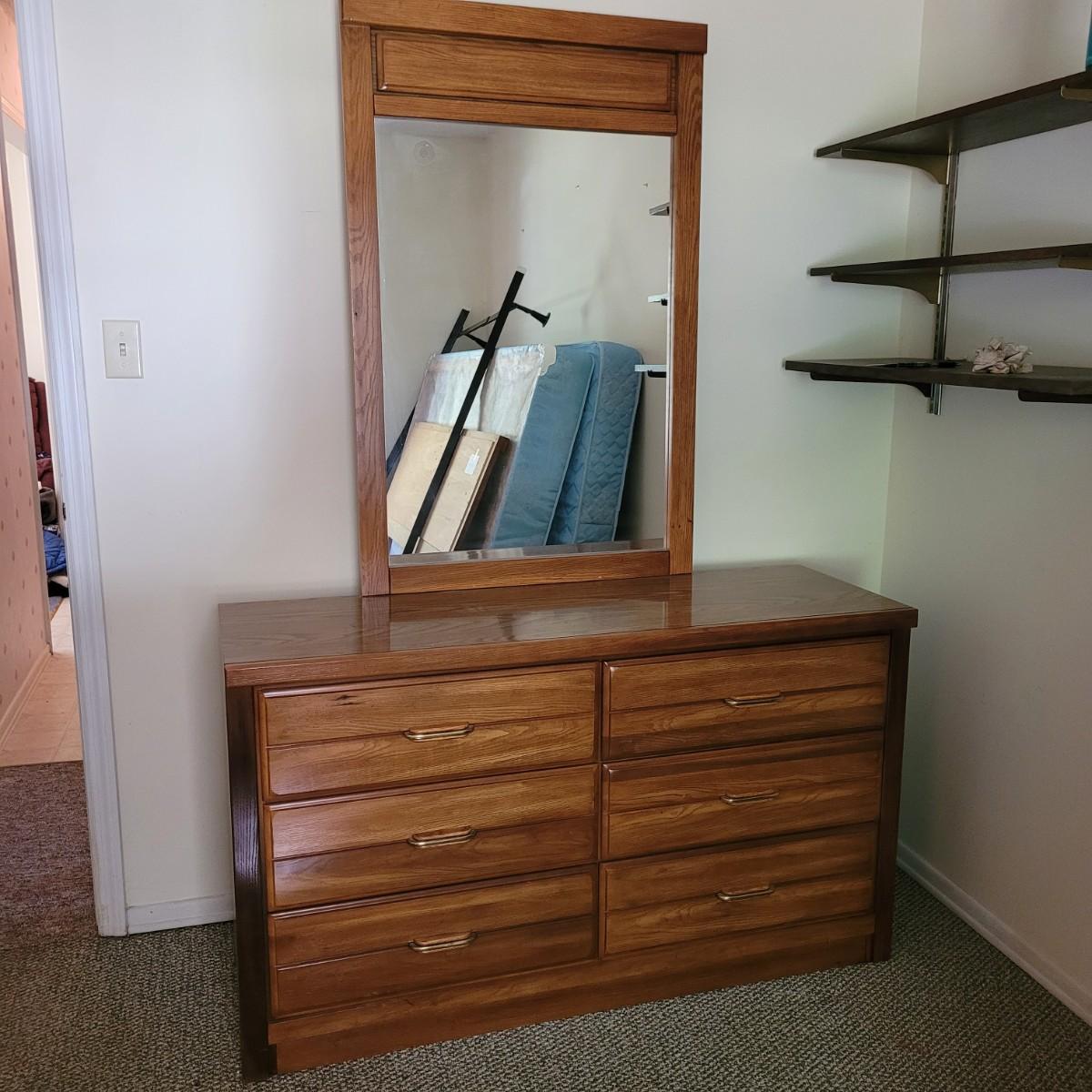 This six drawer wooden dresser has a veneer top and sides. Mirror is attached securely, but can be removedwith a philipshead screwdriver. This piece matches a Lea Furniture dresser in the auction, but doesn't have any identifying markers. Dresser measures approximately 52” x 18” x 30”H, mirror 30” x 45.5”, drawer height 5.5.”