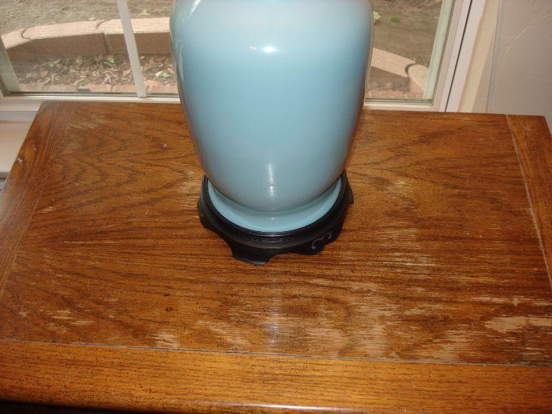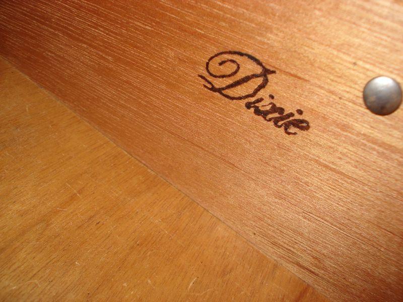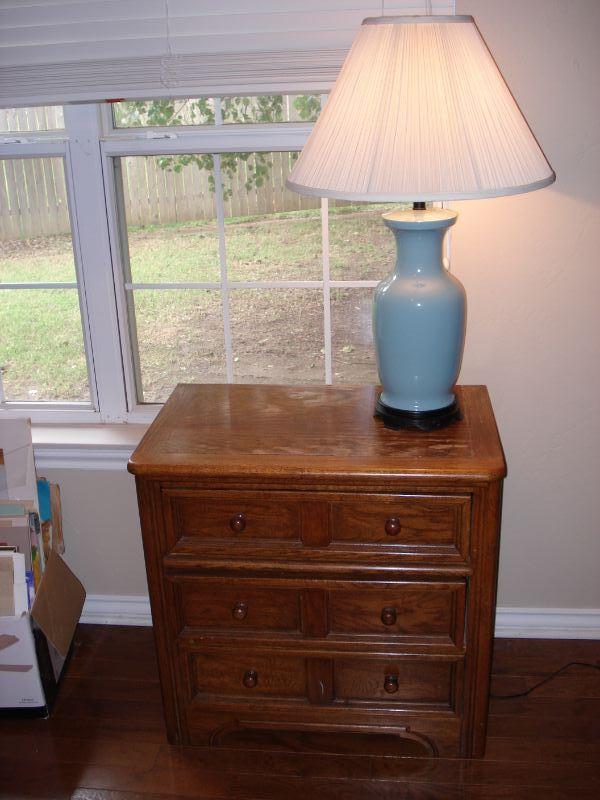 Wood end table or bedside table 27" wide by 17" deep by 23" tall, made by Dixie furniture company. Good construction. Top has been in sun through window and needs to be rubbed down and refinished. Would make a great painter piece. Nice porcelain lamp with shade.