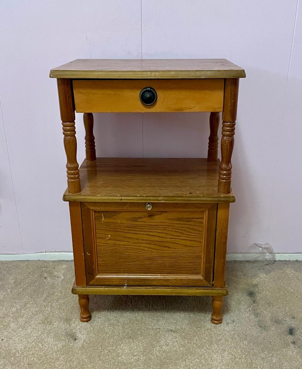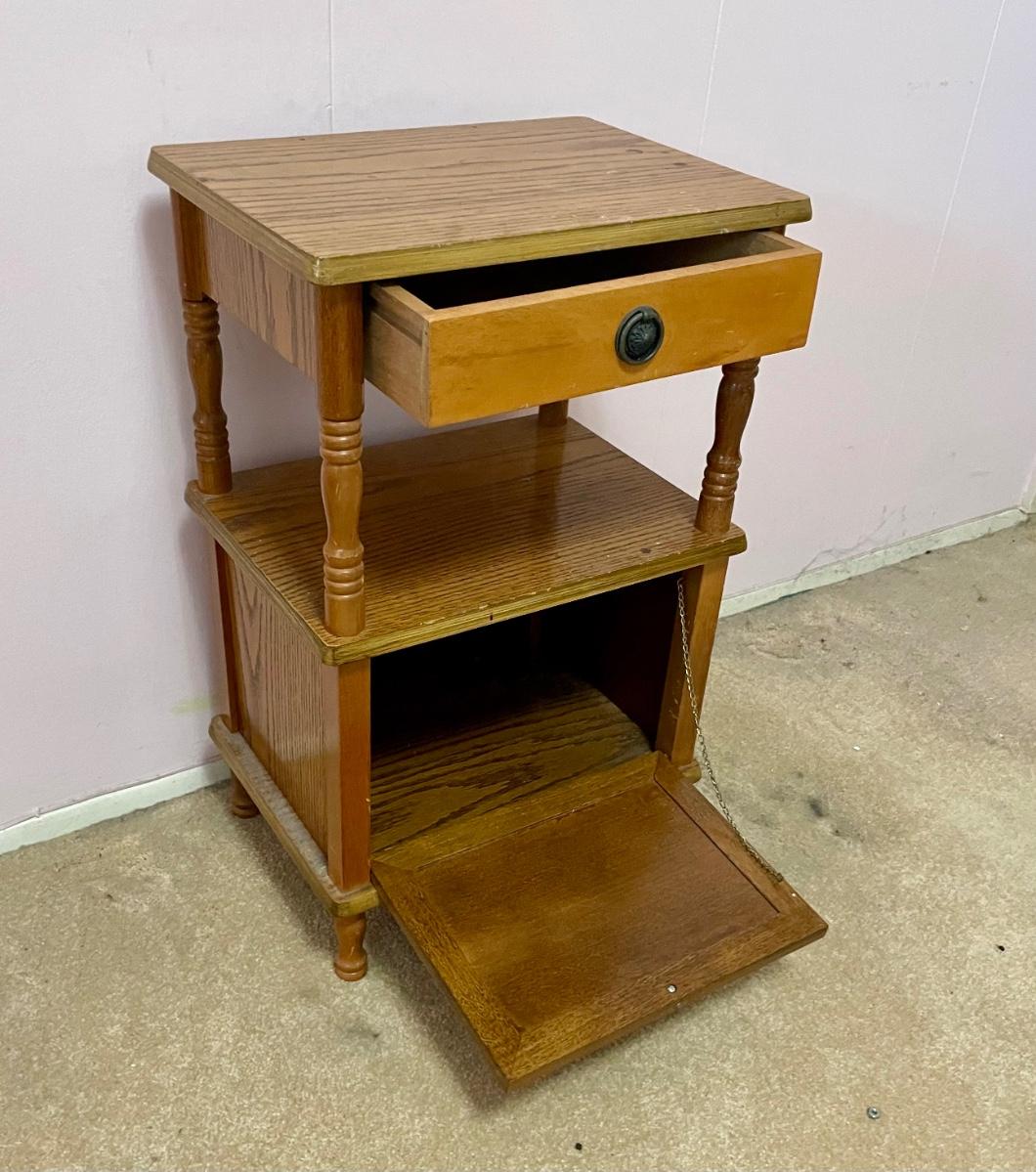 Good condition, open shelf underneath a small top drawer. Large Cabinet space below. Approx. 25” x 15” x 12”.