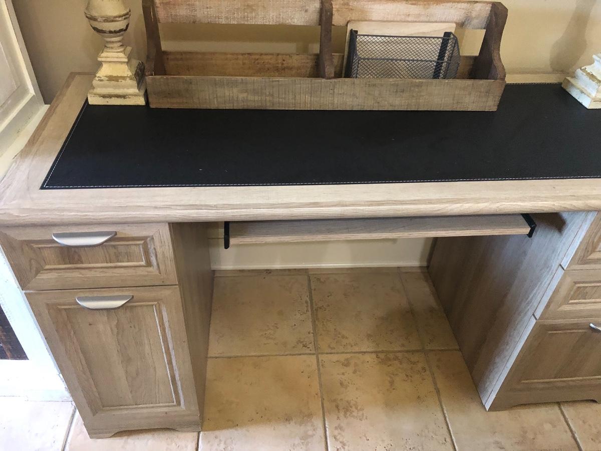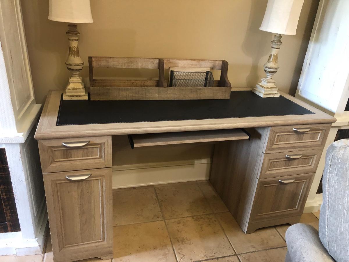 This desk is great. Never used and has a pull out computer shelf if needed. It also has plenty of storage with drawers and cabinets. Measures 57 x 23 x 30