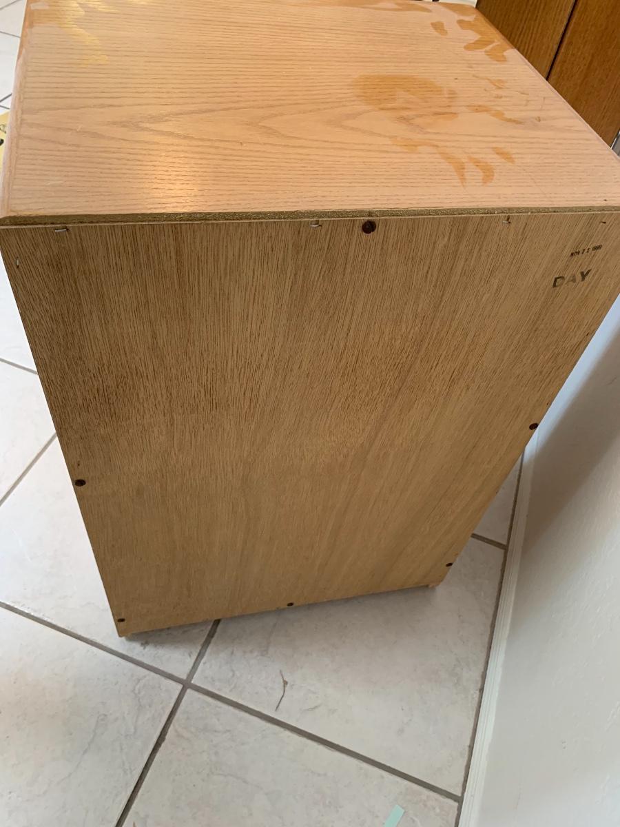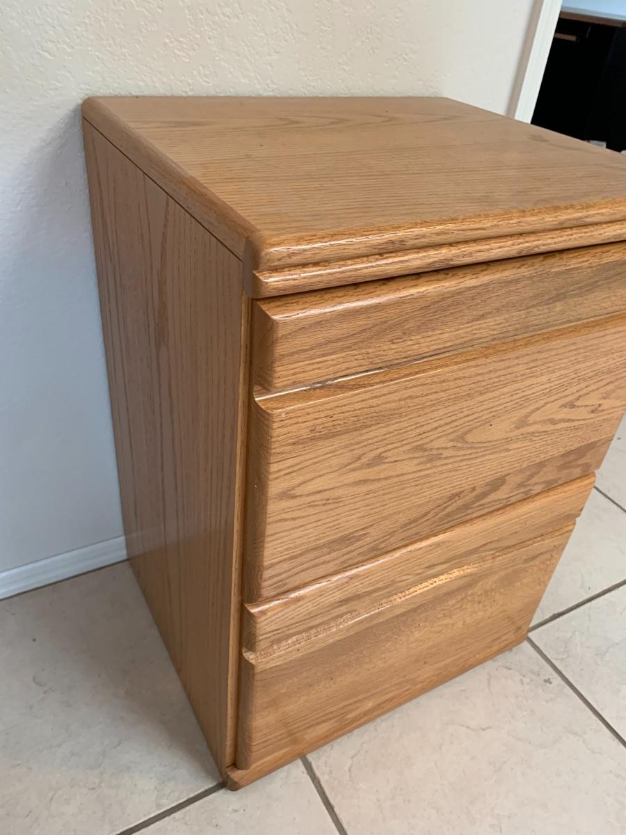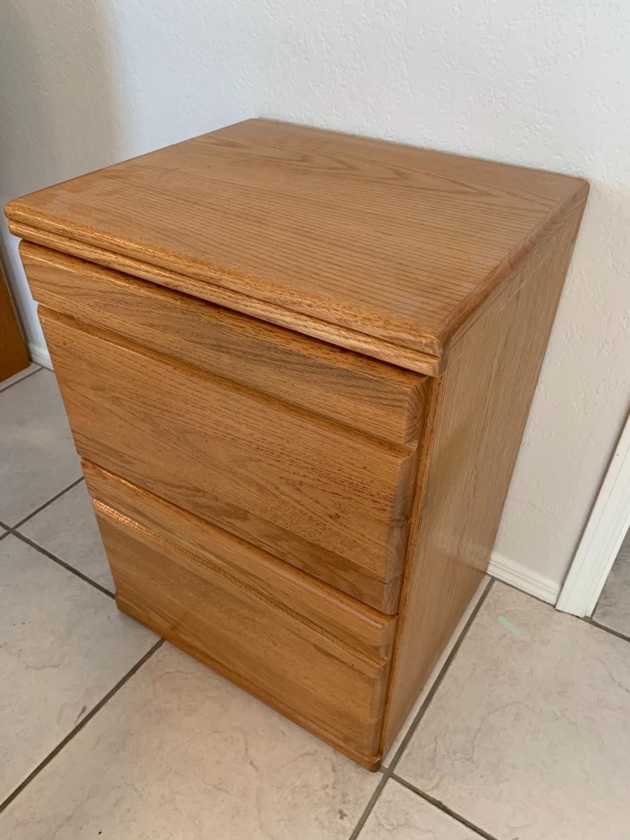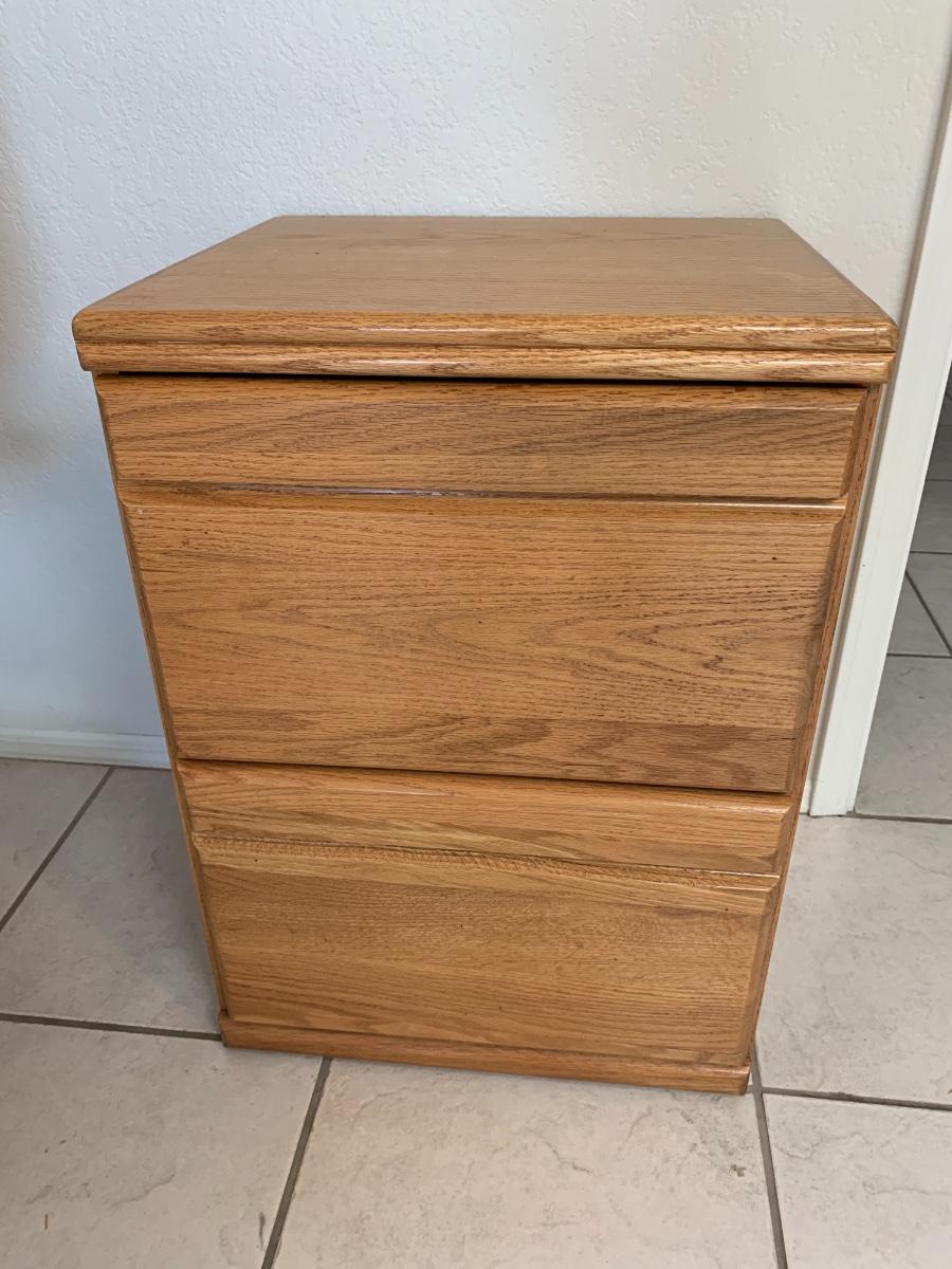 Oak file cabinet, 2 drawers. Good condition. 27.5” tall x 19.5” wide x 16.5” deep.
