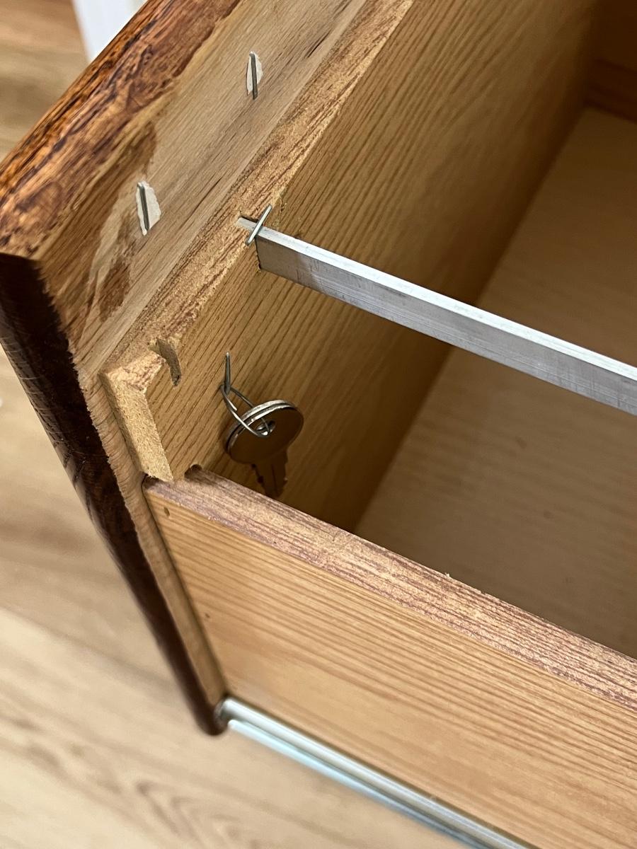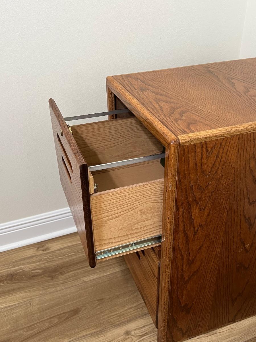 Drawers slide in & out easily ~ Does have keys ~ Only the top drawer locks, bottom drawer does not have key slot ~