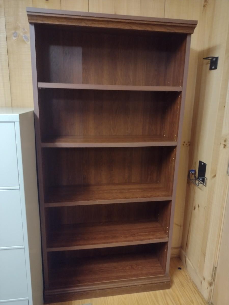 Wood Finish Bookcase (#3) PLEASE NOTE:. Due to no internet connection or wireless service, all invoices must be prepaid via PayPal, Stripe, or Zelle prior to arrival at pick up. Exact change cash onsite is acceptable but absolutely no debit or credit cards at time of pick up.