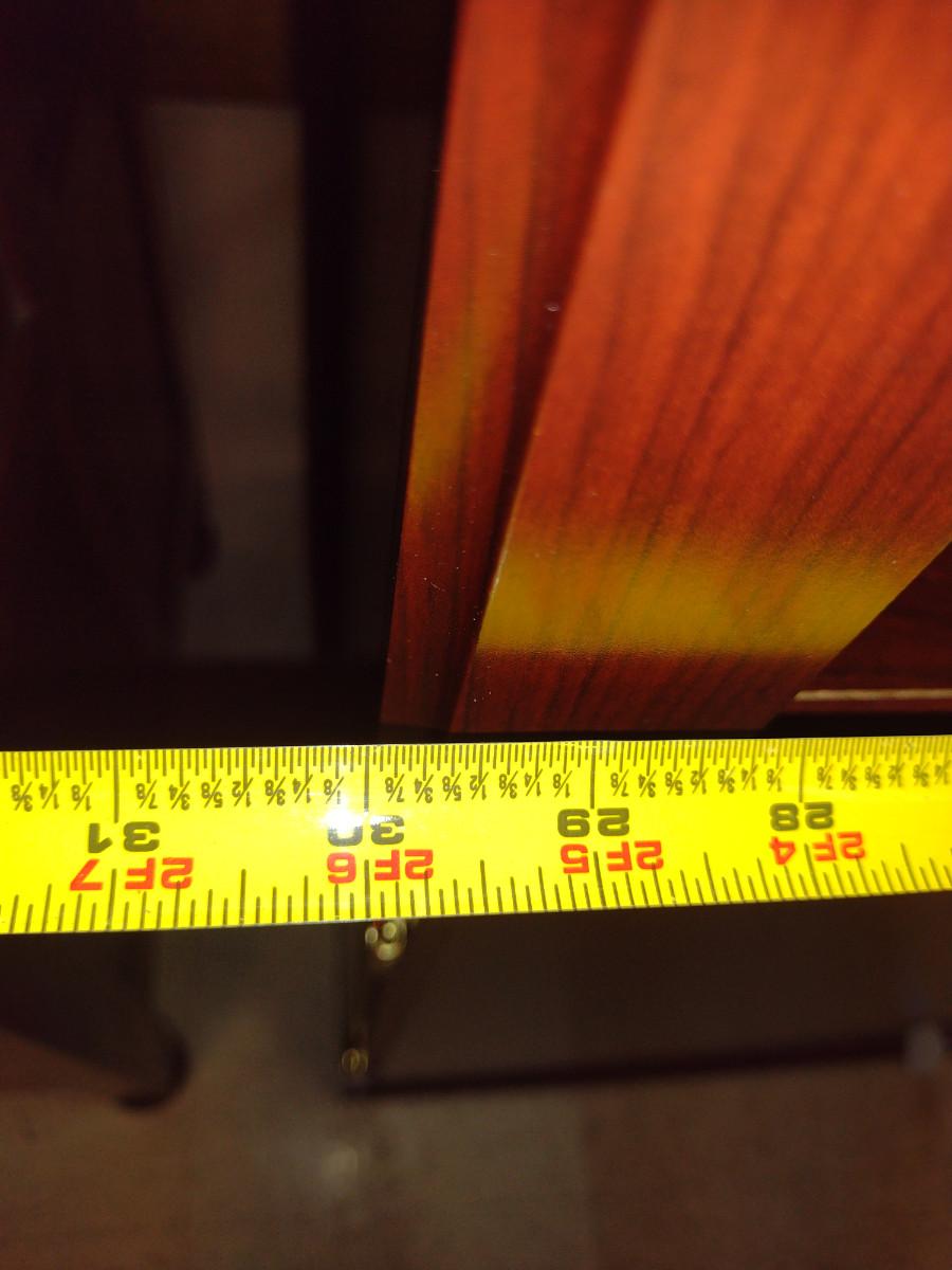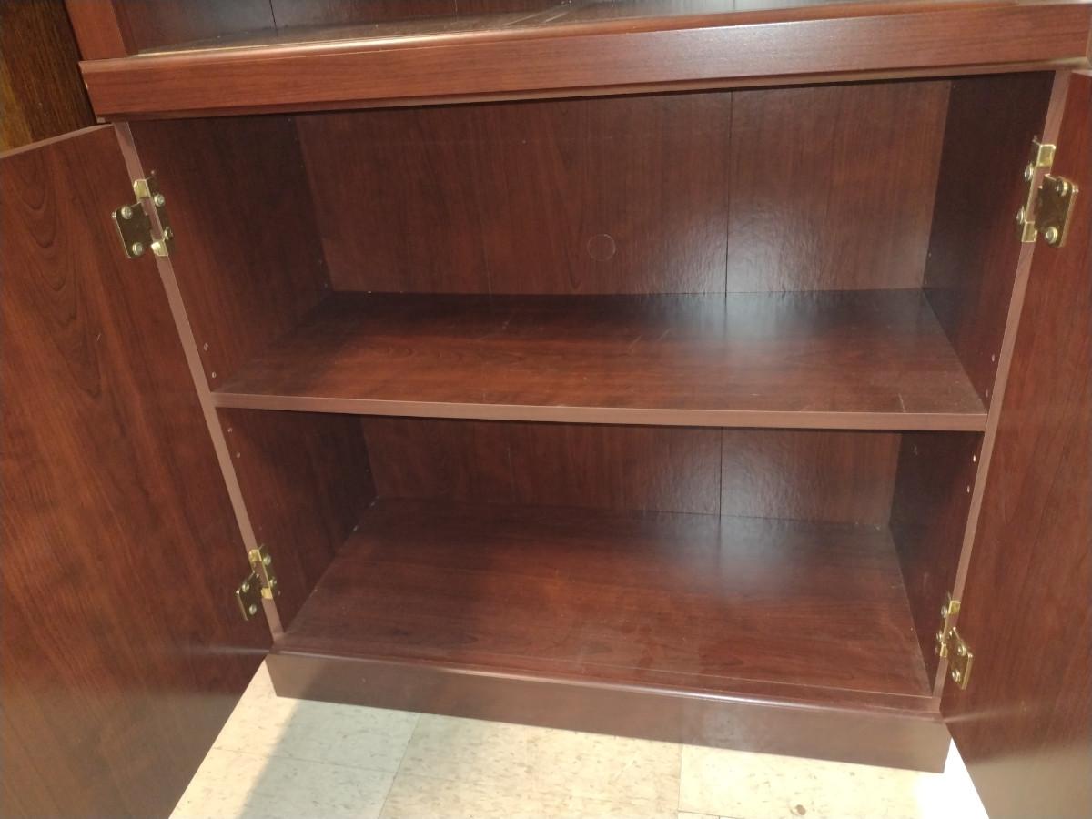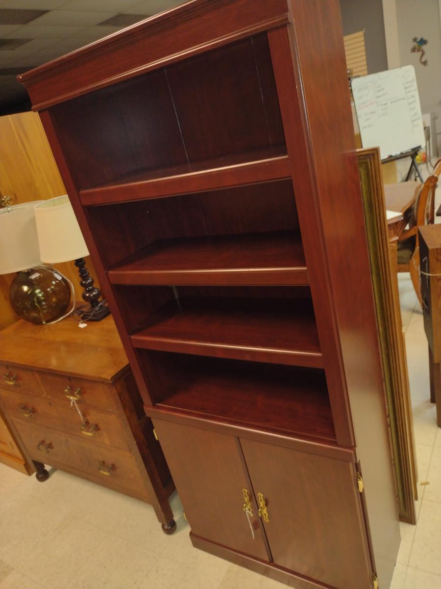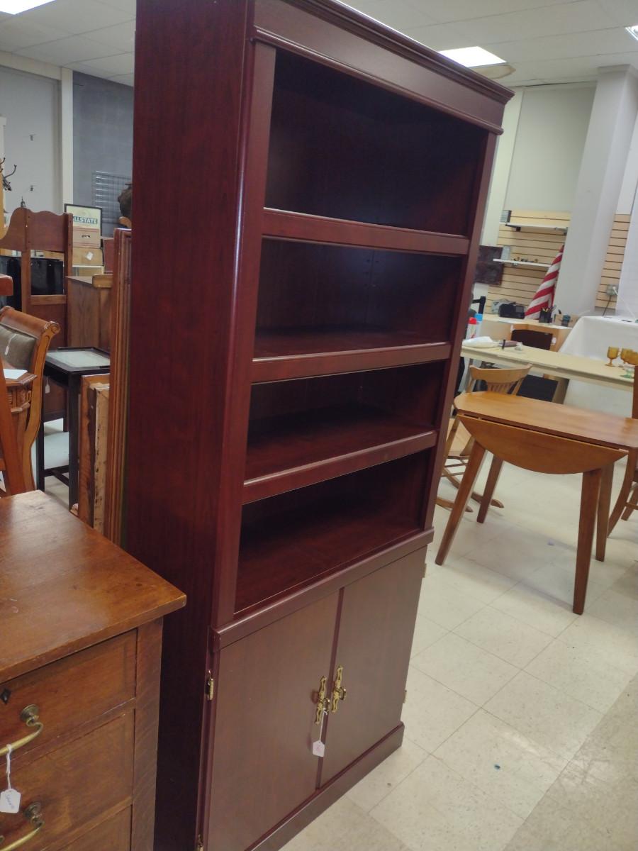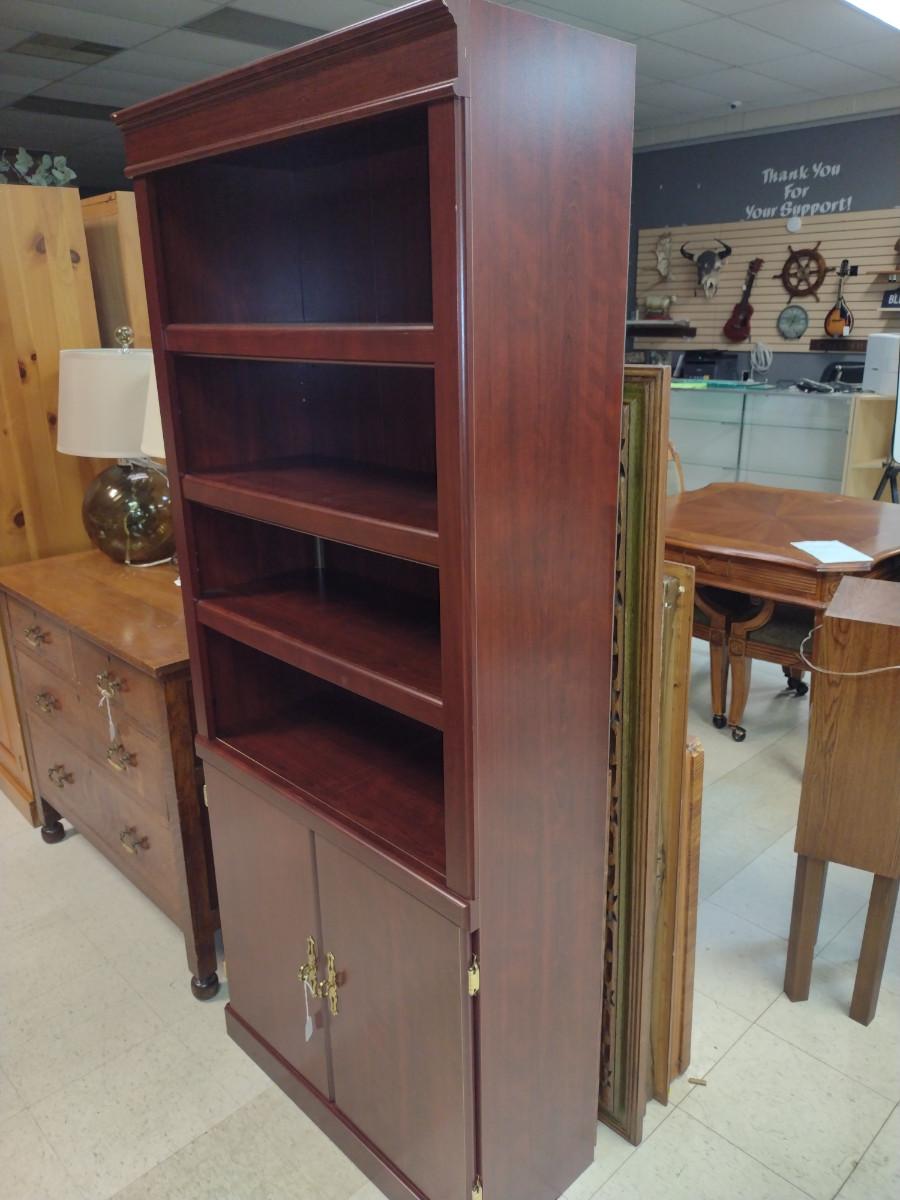 Wood Finish Bookcase with Enclosed Storage- Approx 30" x 12" x 71" Tall. Shelves are adjustable. Item is missing one shelf support pin.