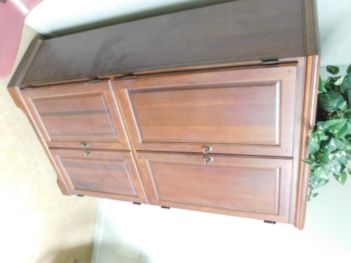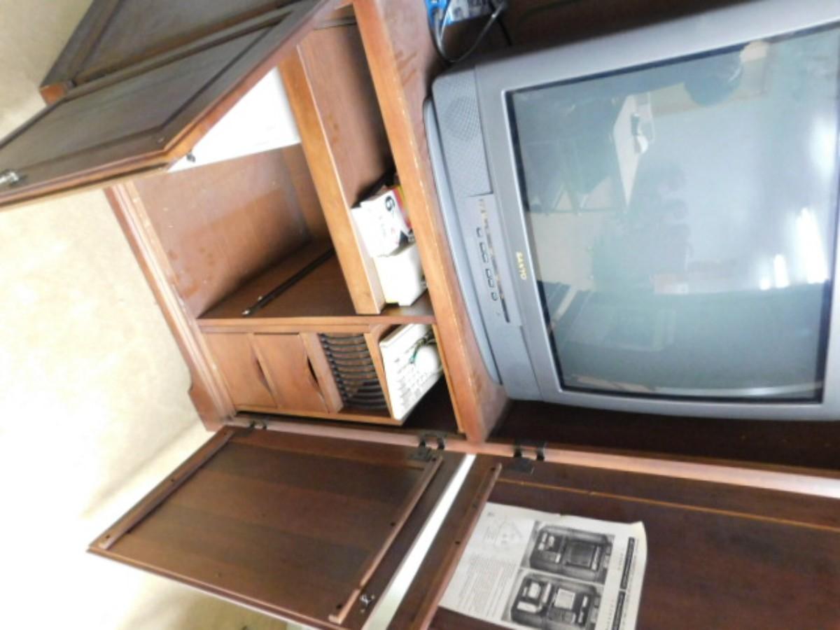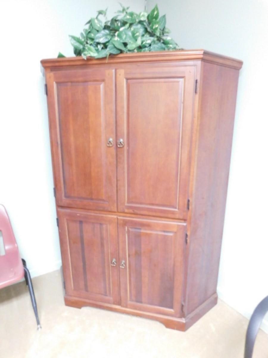 Wood Finish Corner Hutch Storage Cabinet Media Center Choice A (No Contents) Expect some wear or scratches to finish. Shipping option available via freight or local mover at Buyer's expense. Buyer must have all shipping scheduled within the stated dates and times of pickup. Recommended local mover is Beaty Bros. Moving 828-201-2982