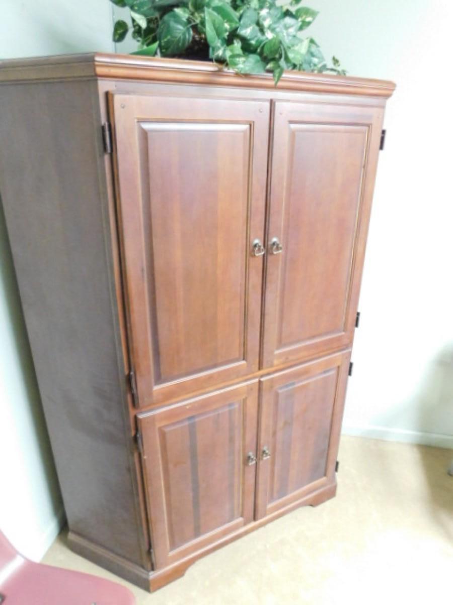 Wood Finish Corner Hutch Storage Cabinet Media Center Choice B (No Contents) Expect some wear or scratches to finish. Shipping option available via freight or local mover at Buyer's expense. Buyer must have all shipping scheduled within the stated dates and times of pickup. Recommended local mover is Beaty Bros. Moving 828-201-2982