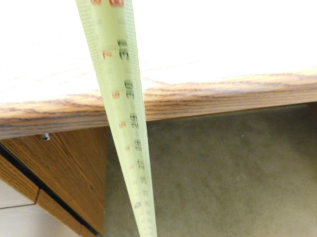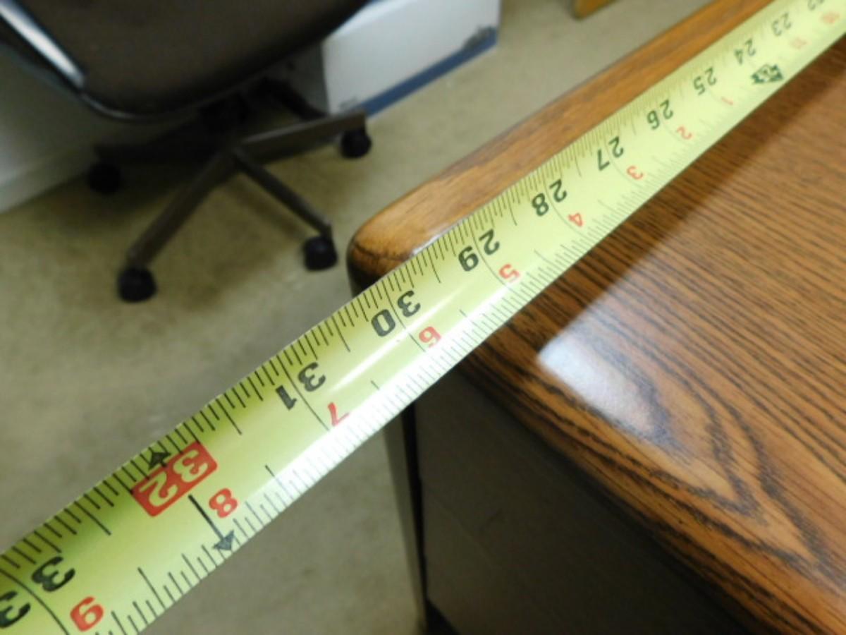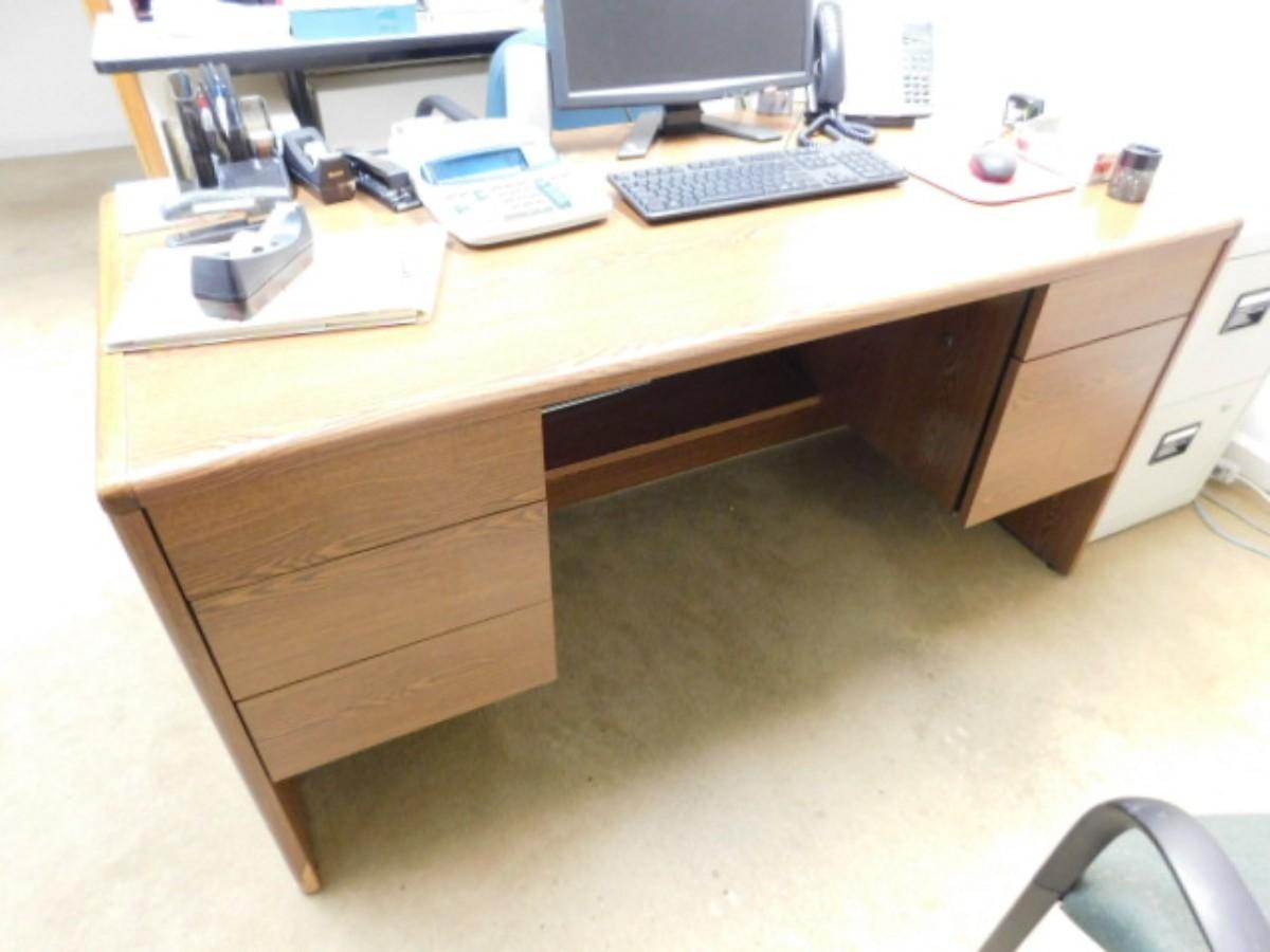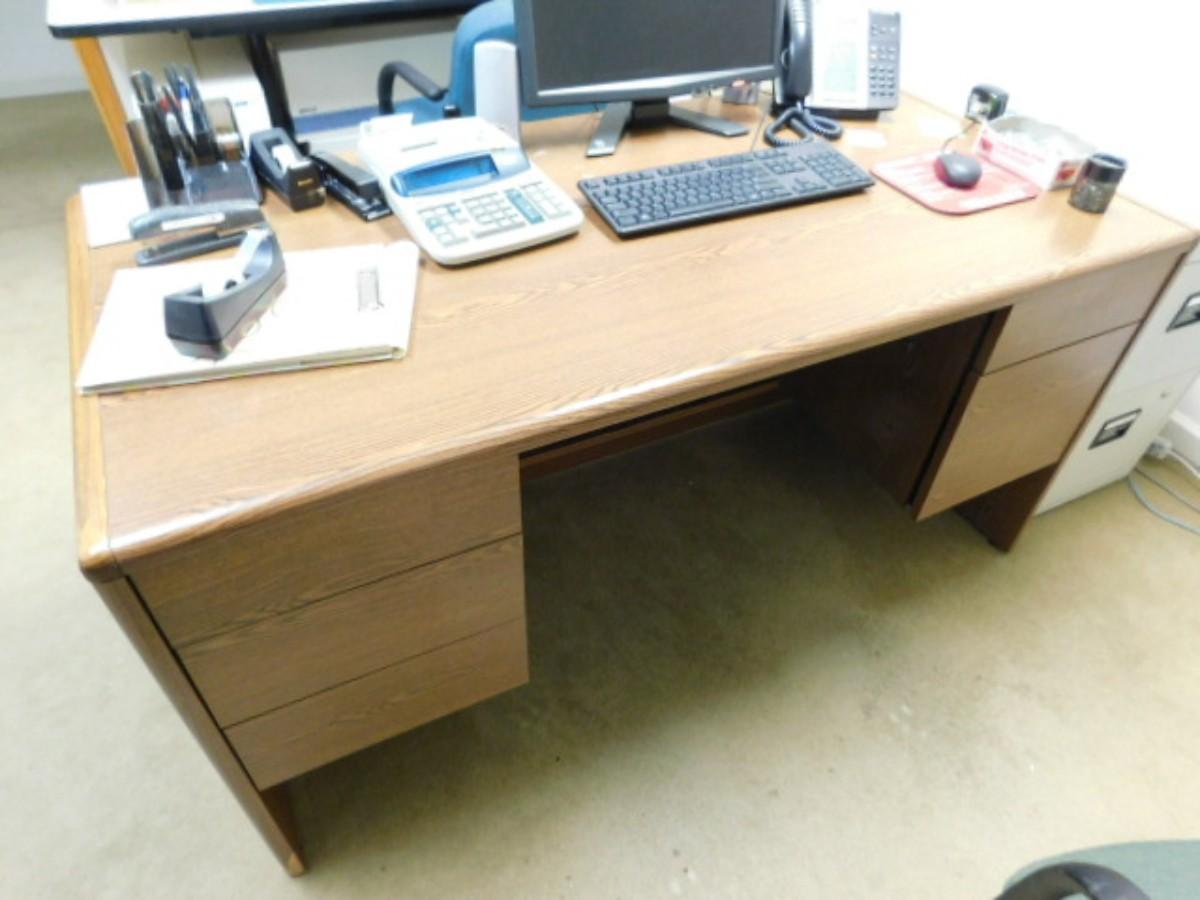 Wood Finish Kneehole Office Desk (No Contents) [O#9] Expect some wear or scratches to finish. Shipping option available via freight or local mover at Buyer's expense. Buyer must have all shipping scheduled within the stated dates and times of pickup. Recommended local mover is Beaty Bros. Moving 828-201-2982