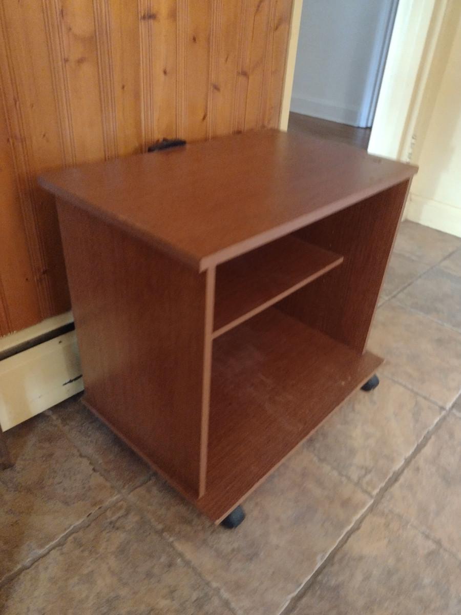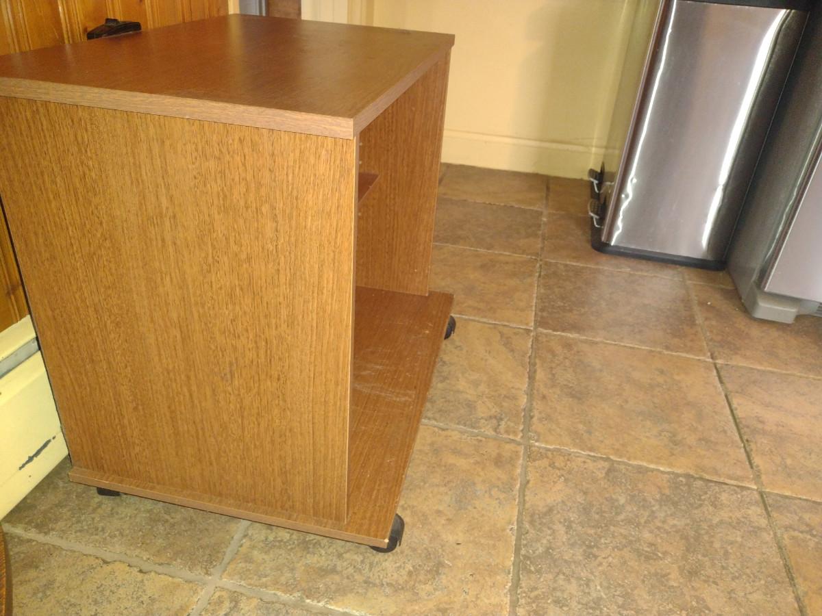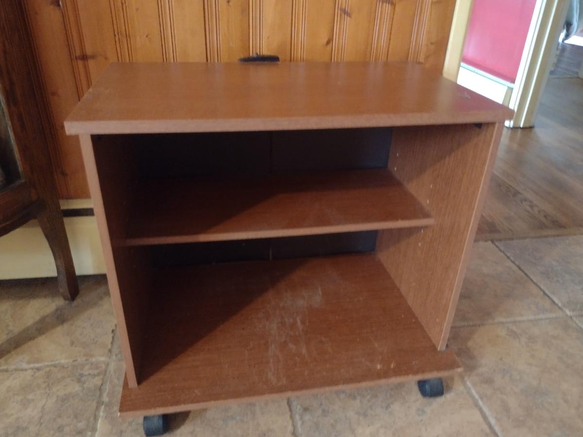 Wood Finish Media Stand with Adjustable Shelf. Some damage to bottom shelf- please see all pictures.
