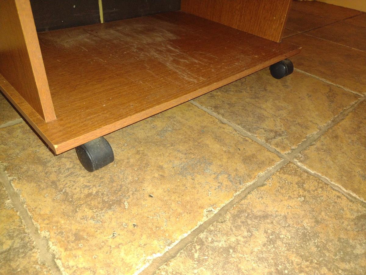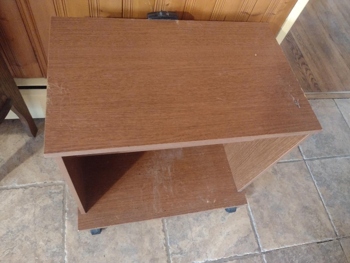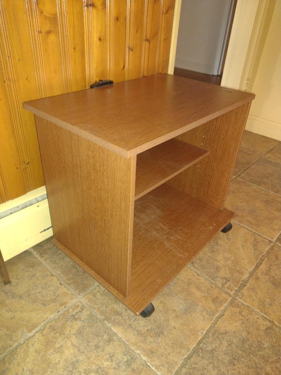 Wood Finish Media Stand with Adjustable Shelf. Some damage to bottom shelf- please see all pictures.