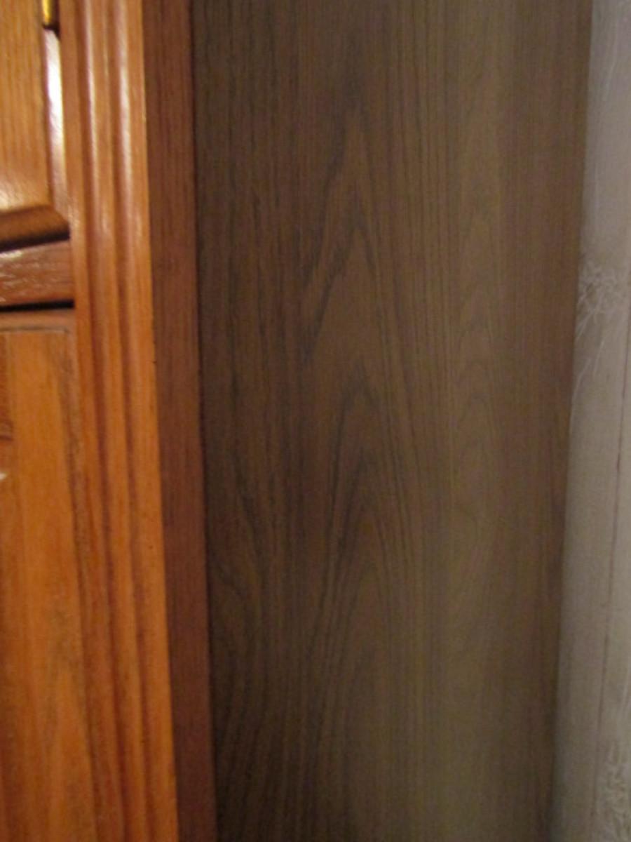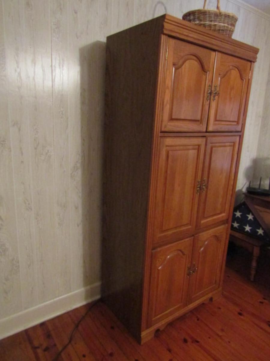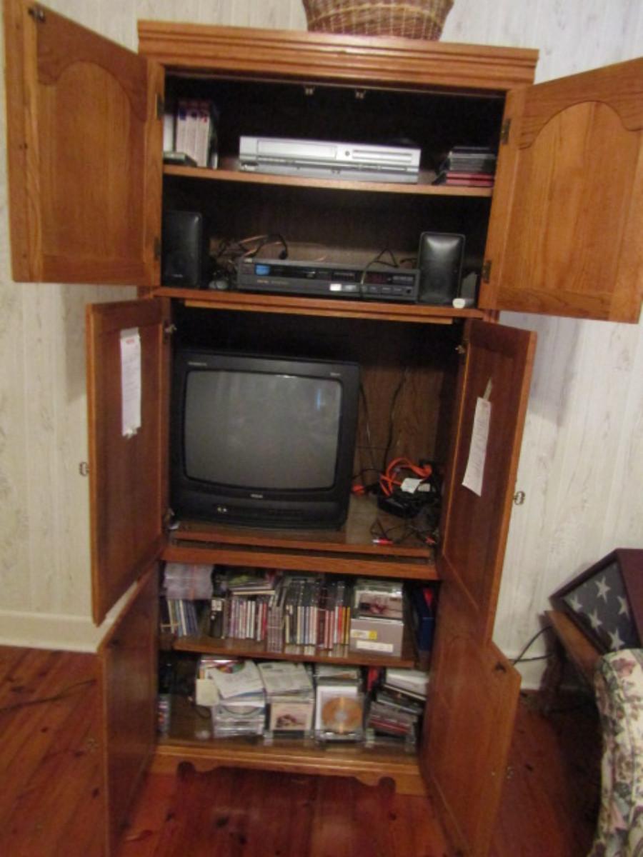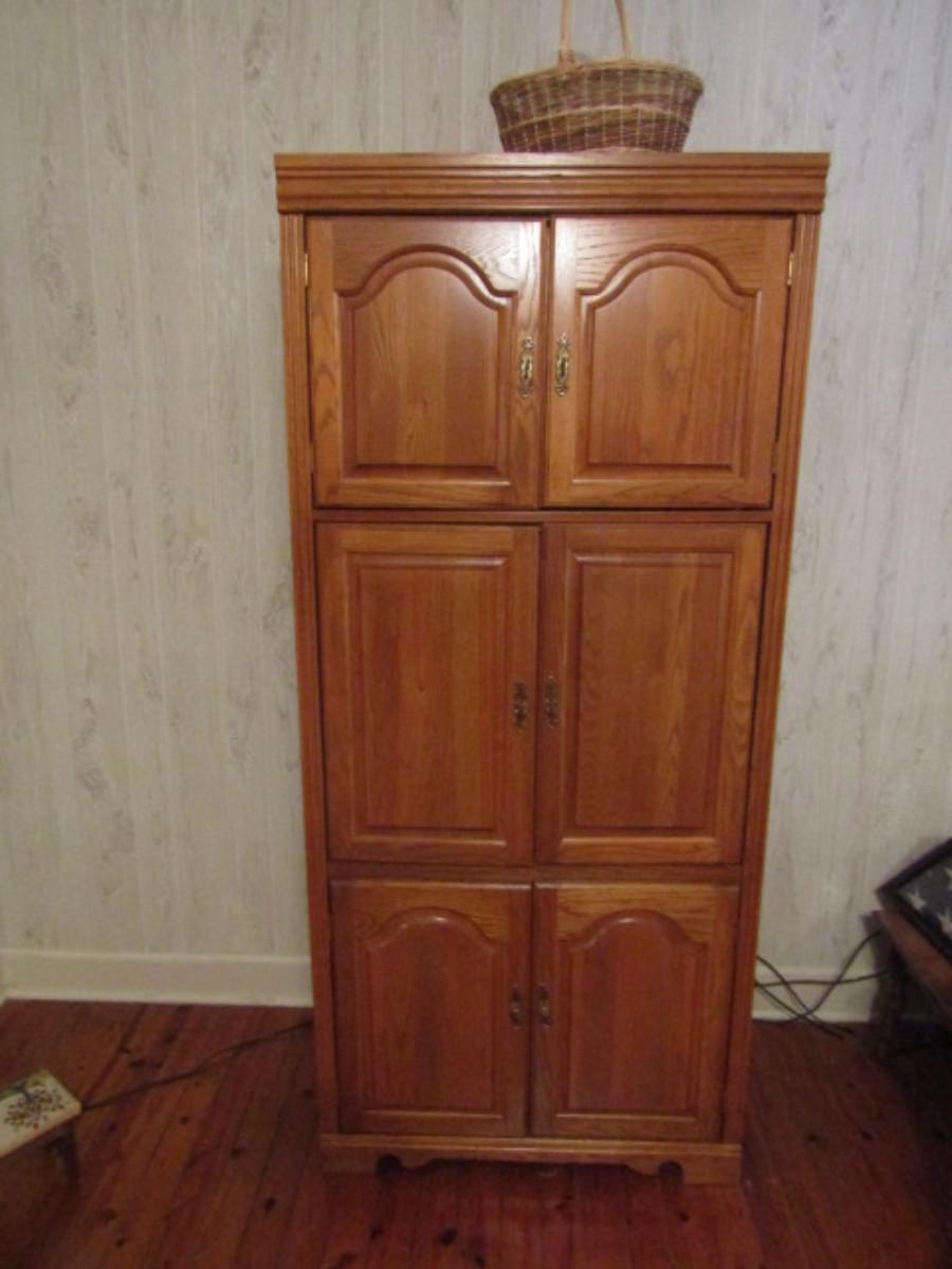 Wood Finish Media/Storage Cabinet (No Contents). Front doors and shelves of cabinet appear to be solid wood, sides and back are wood finish.