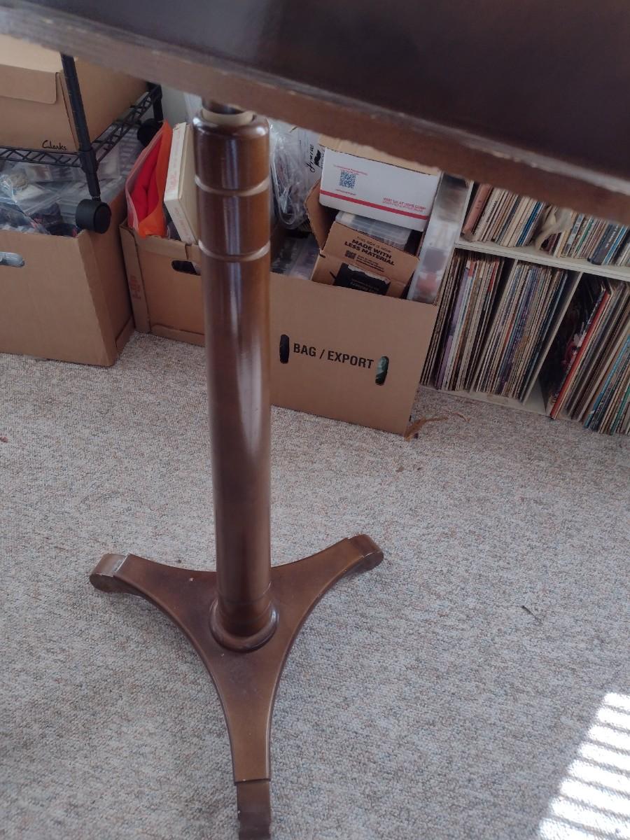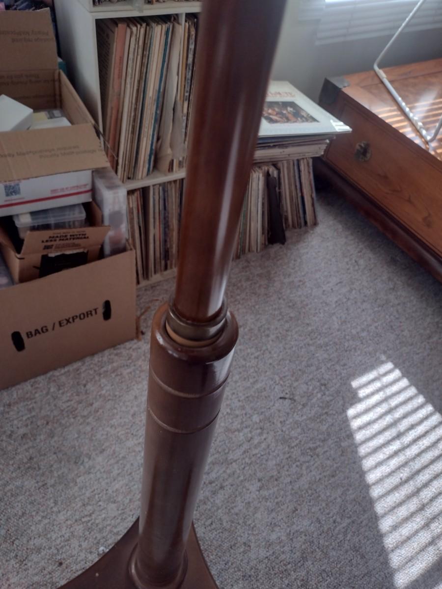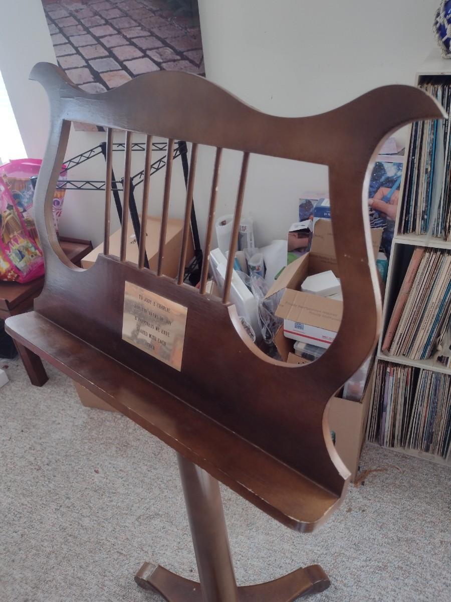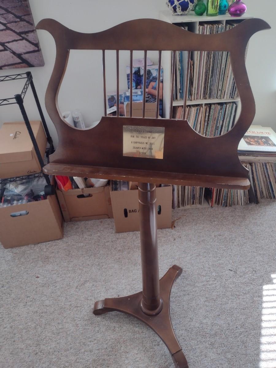 Wood Finish Sheet Music Stand Adjustable Height. Has brass personalized plate on face.