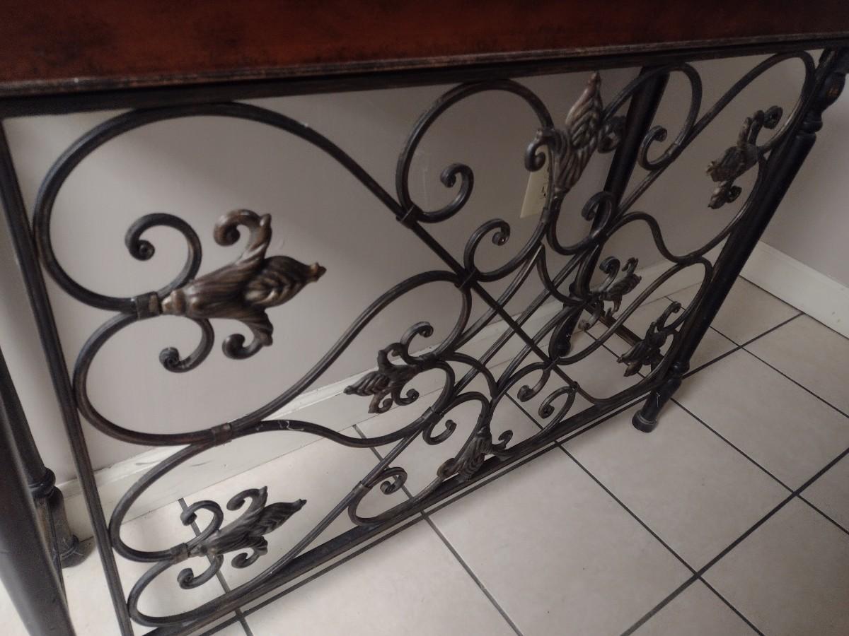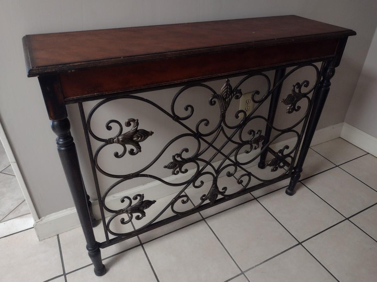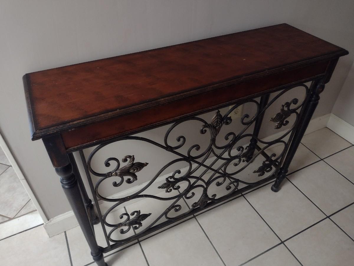Wood Finish Sideboard Table with Decorative Wrought Metal Fleur de Lis Accent
