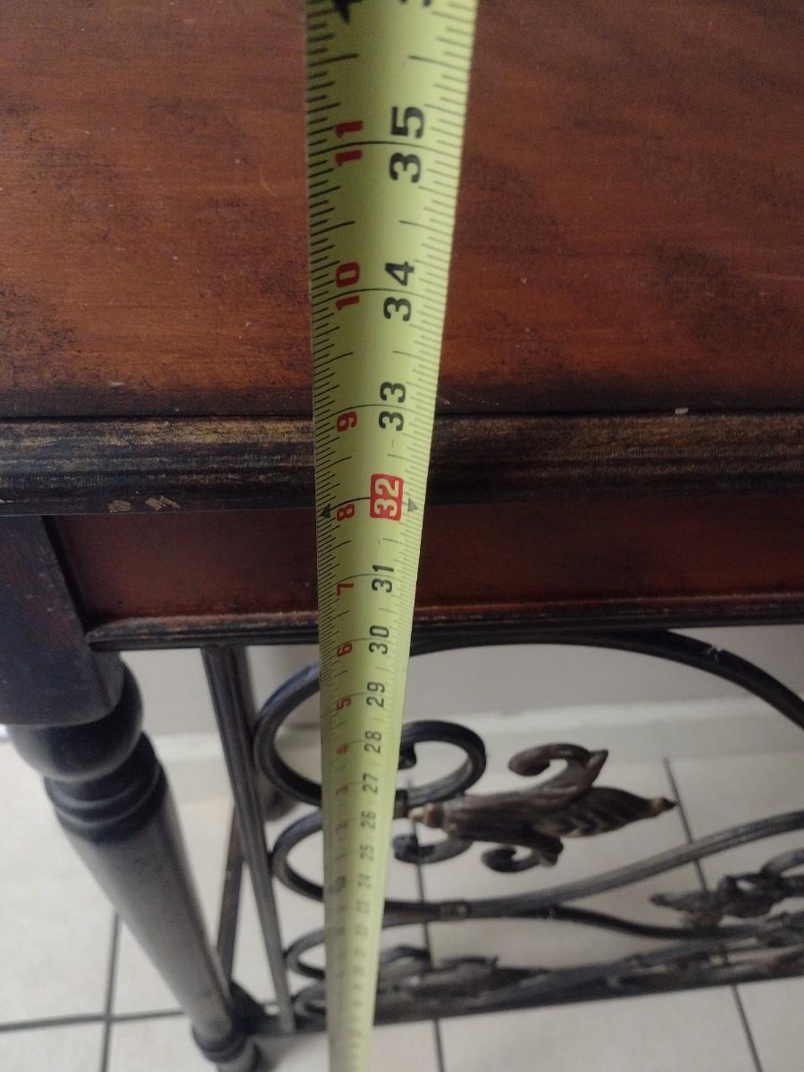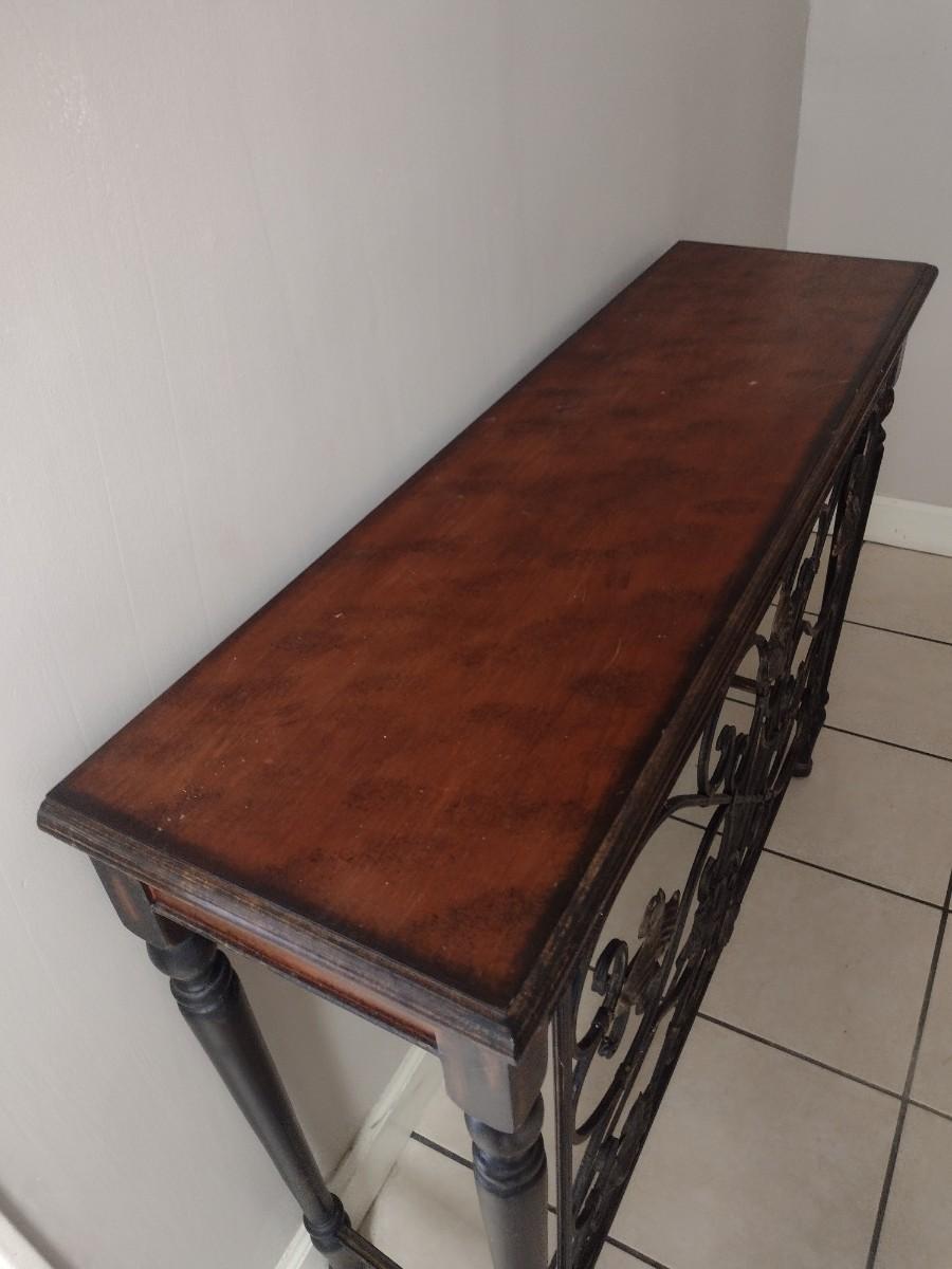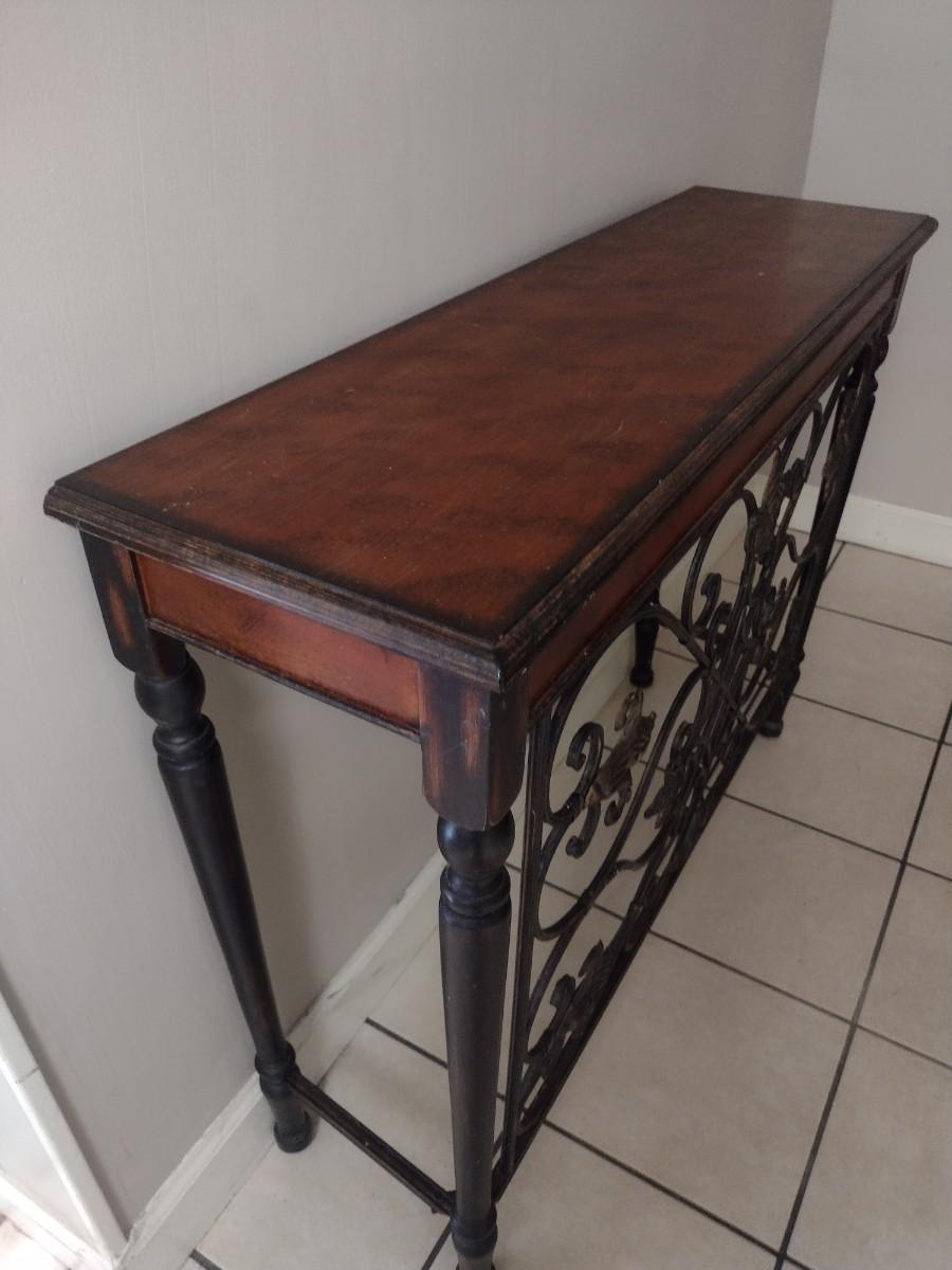 Wood Finish Sideboard Table with Decorative Wrought Metal Fleur de Lis Accent