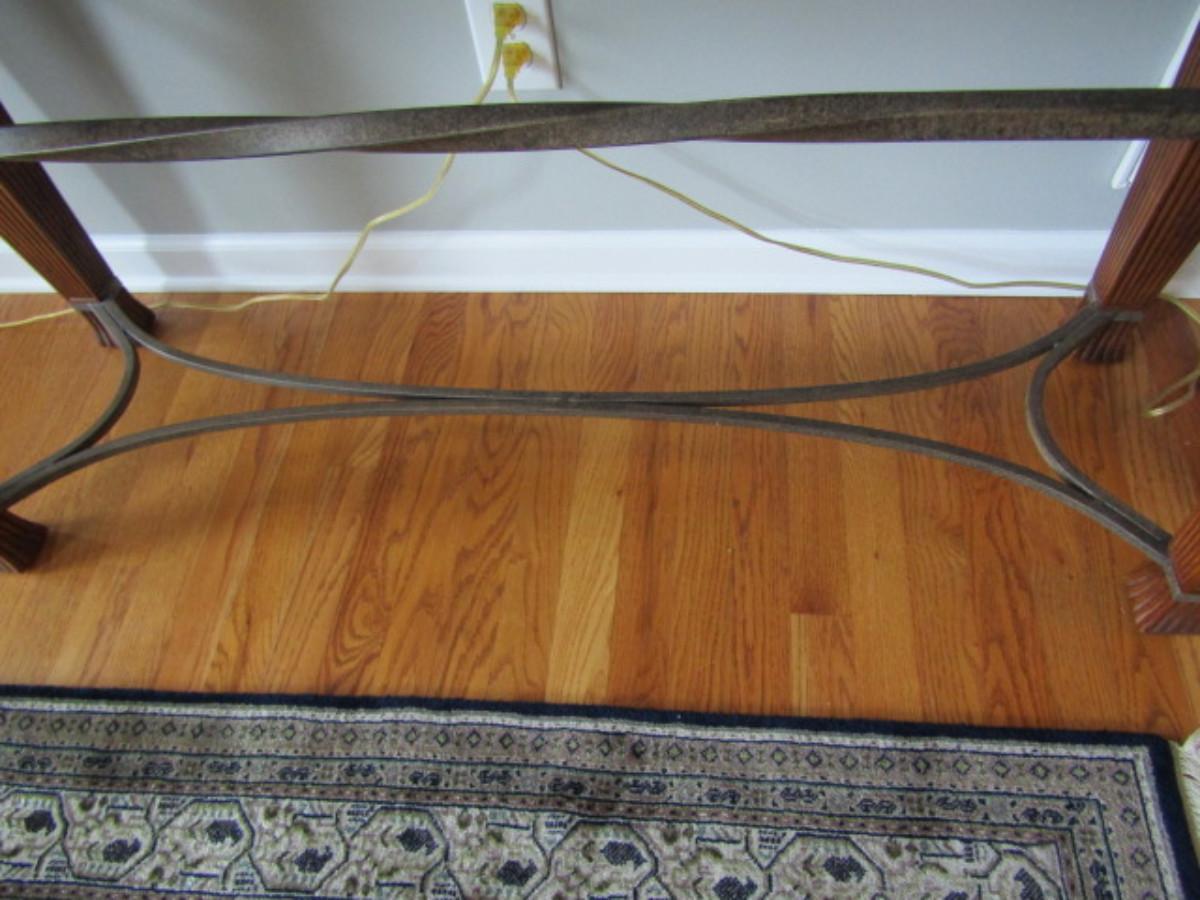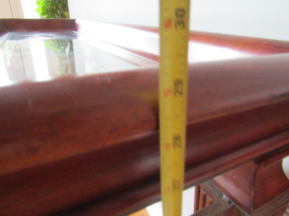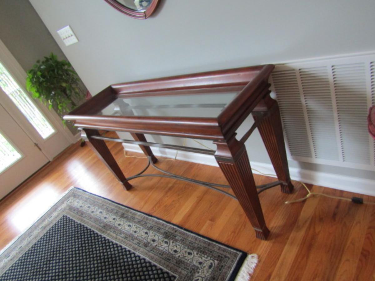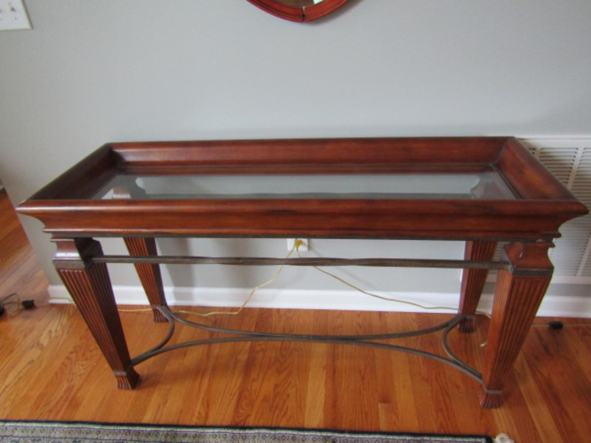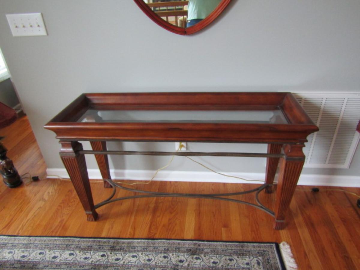 Wood Finish Sofa Table- Picture Frame Style Top with Inlaid Glass