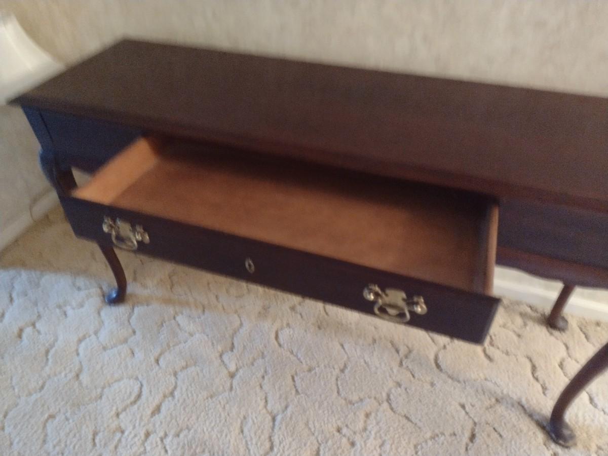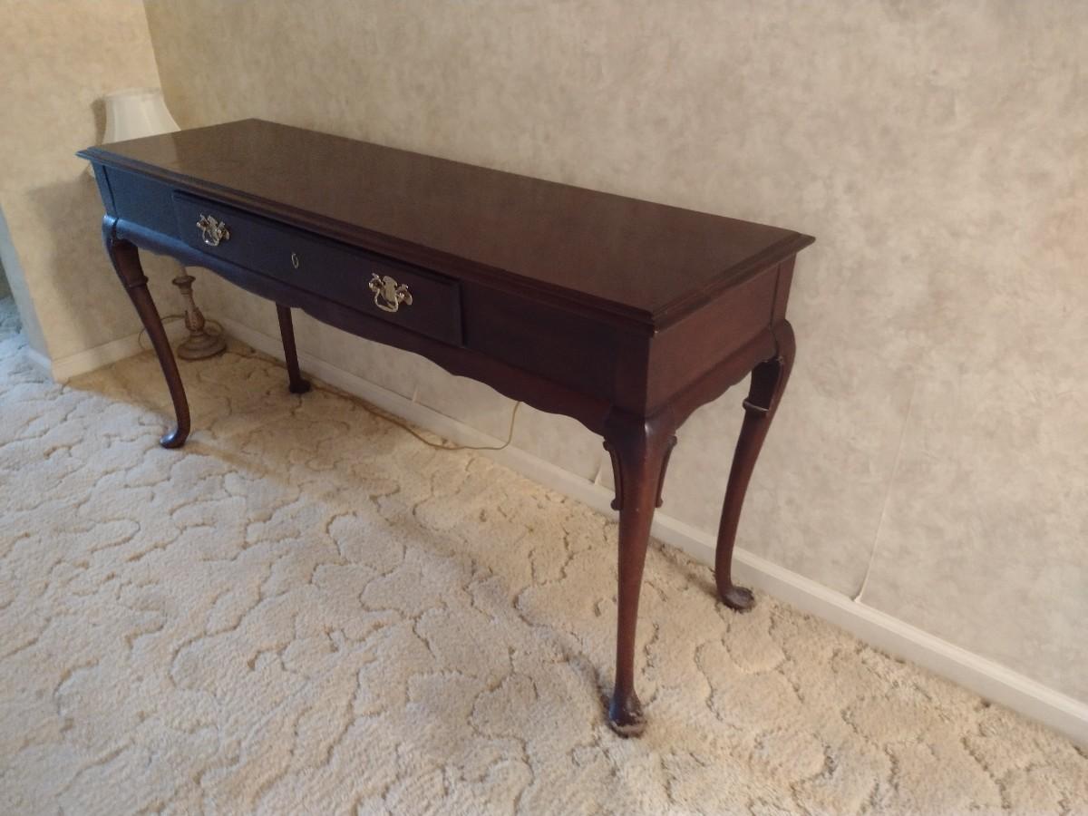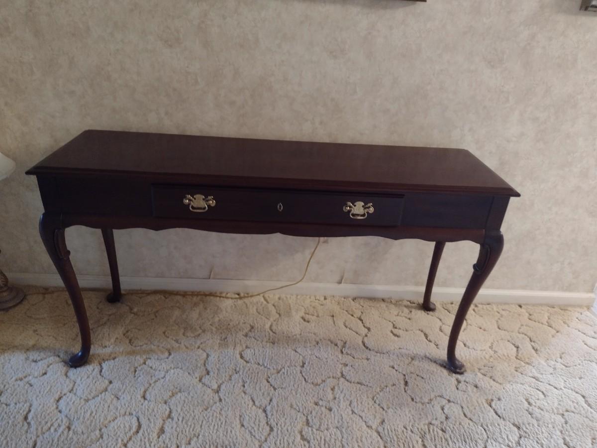 Wood Finish Sofa Table with Drawer. Measures approx 51" x 16" x 27" tall