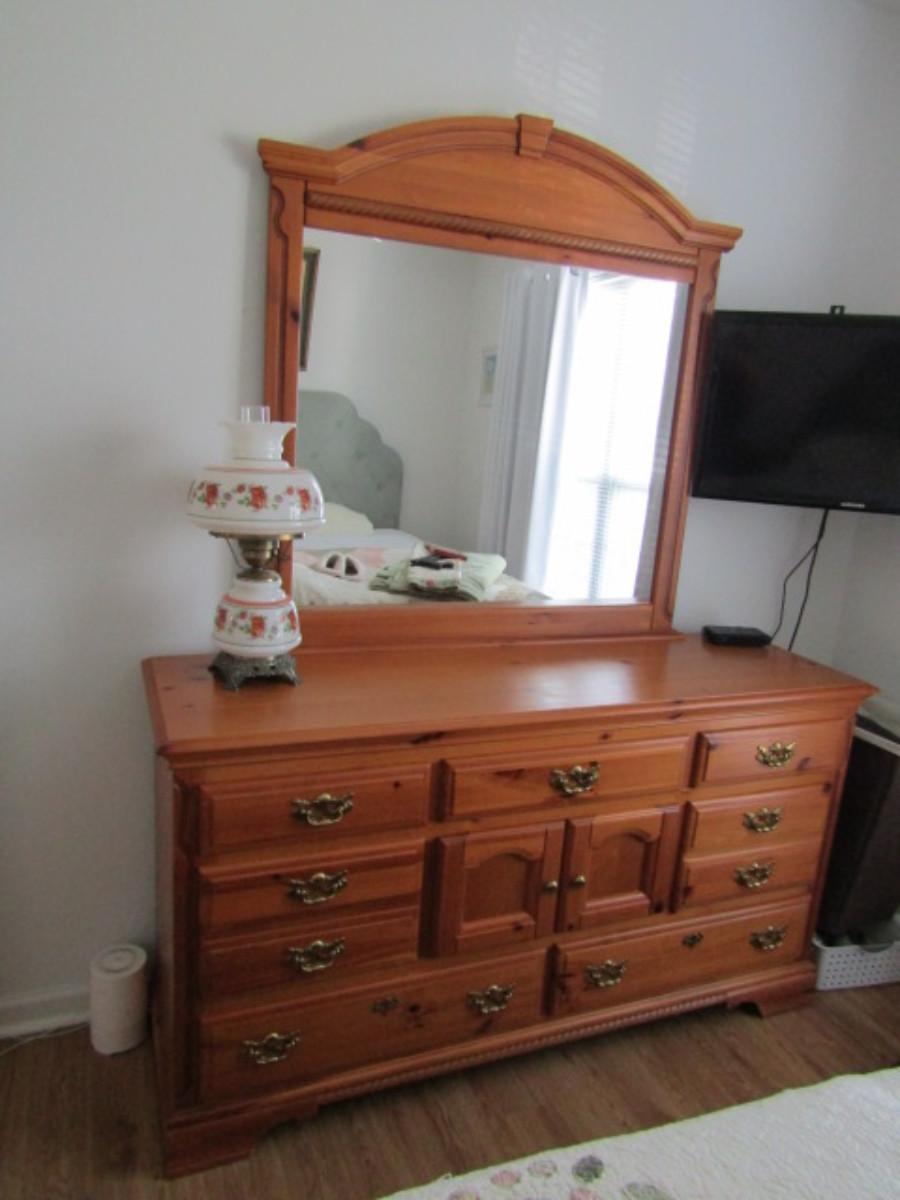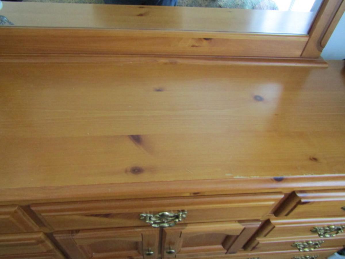 Wood Finish Stretch Dresser with Mirror (No Contents). Possibly made by Webb.