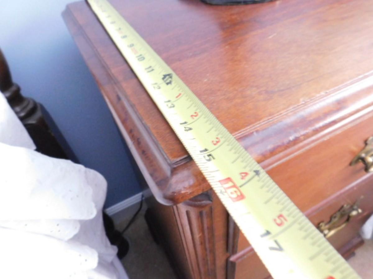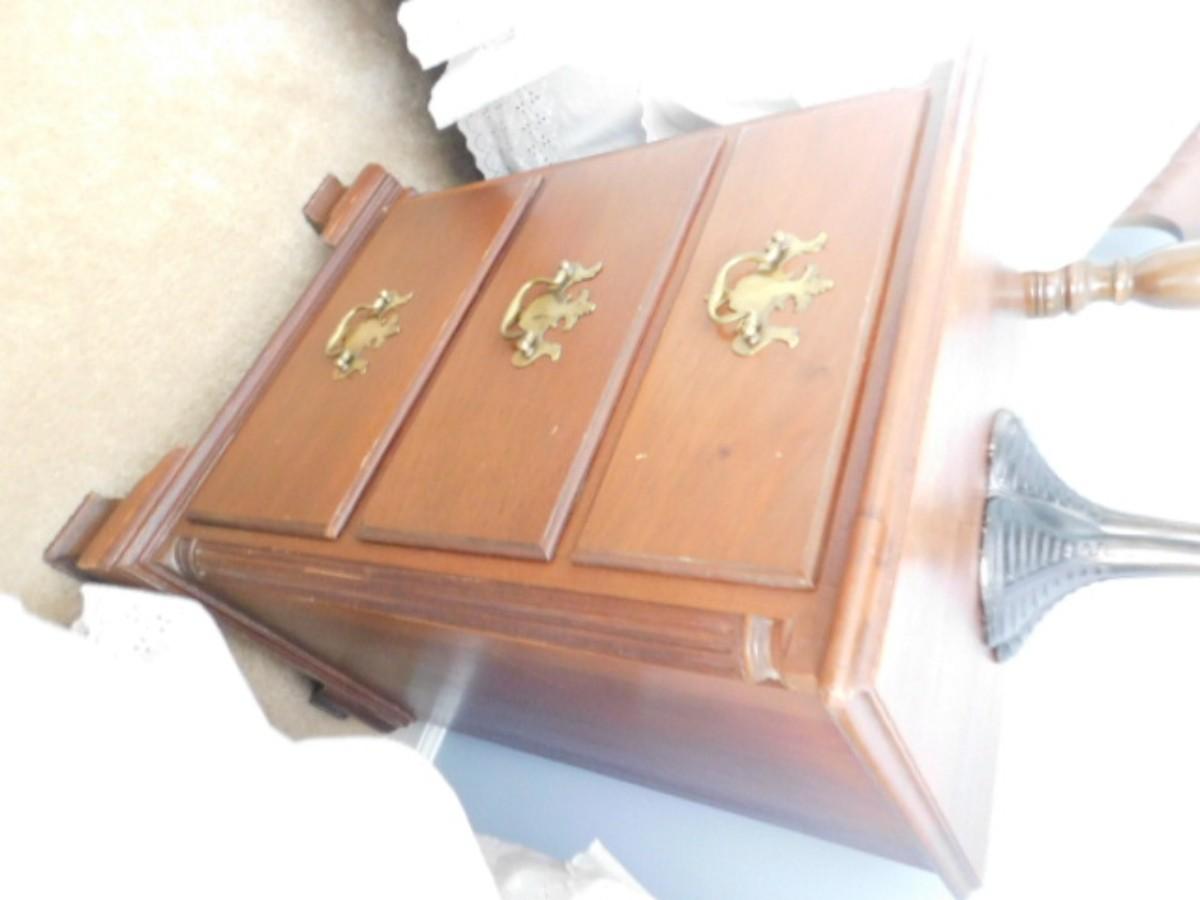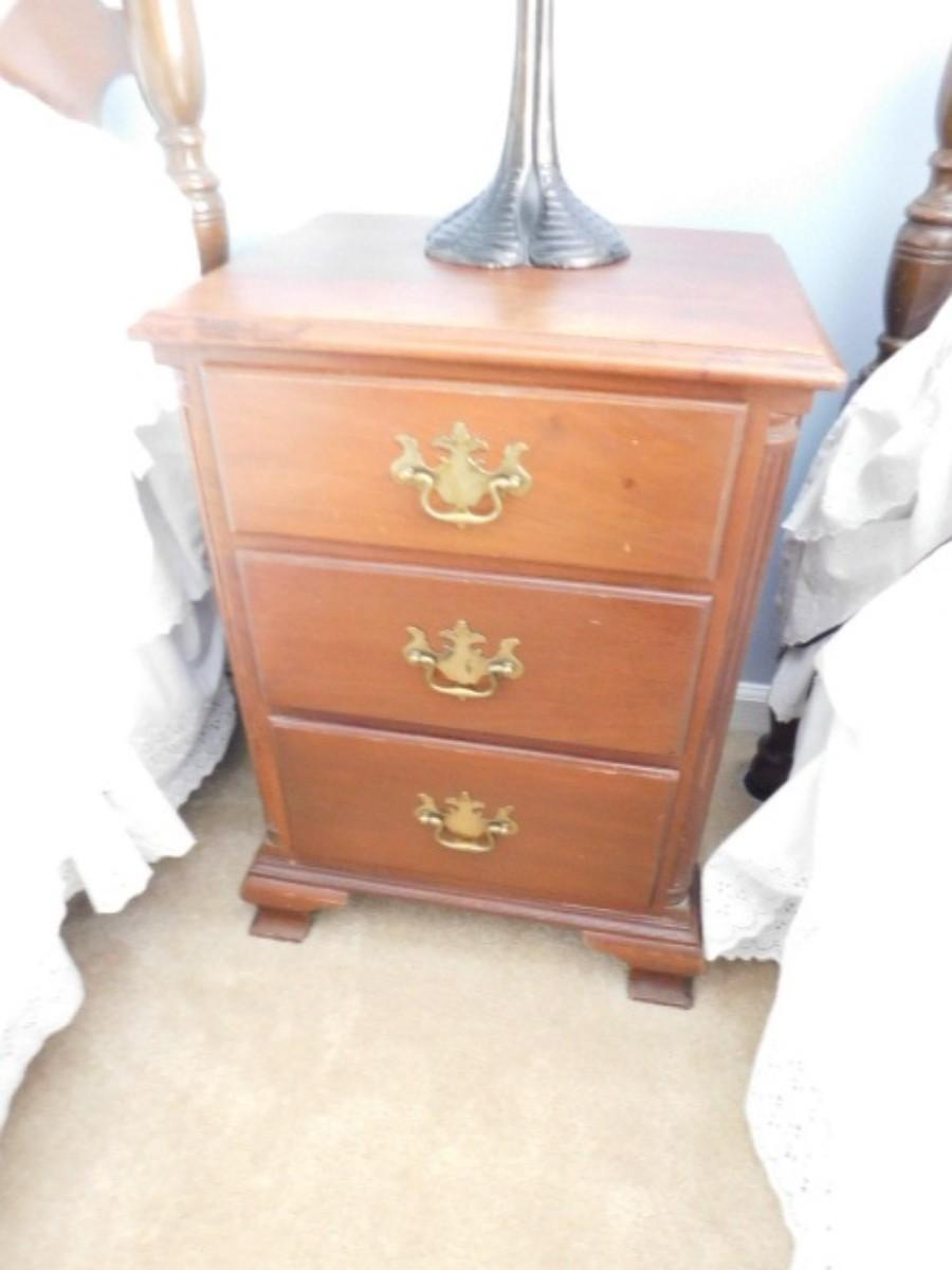 Wood Finish Three Drawer Dresser downstairs item has some wear and scratches