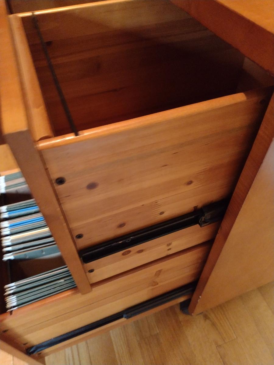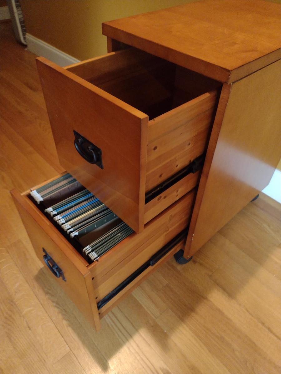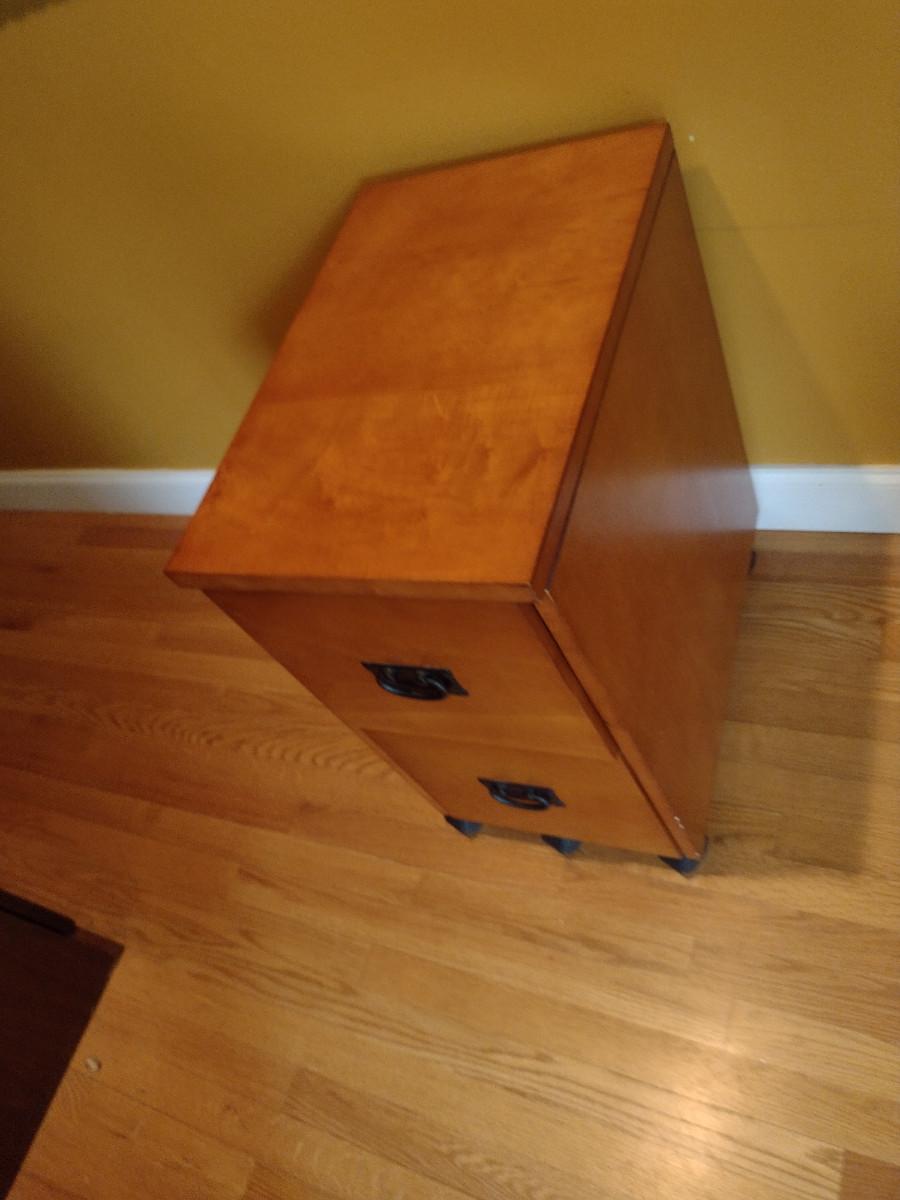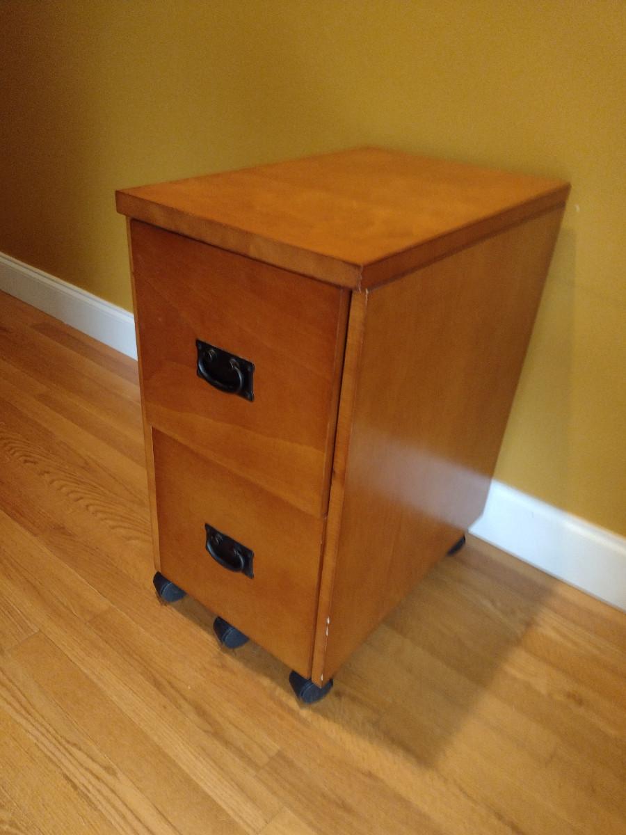 Wood Finish Two Drawer Filing Cabinet. No contents included.