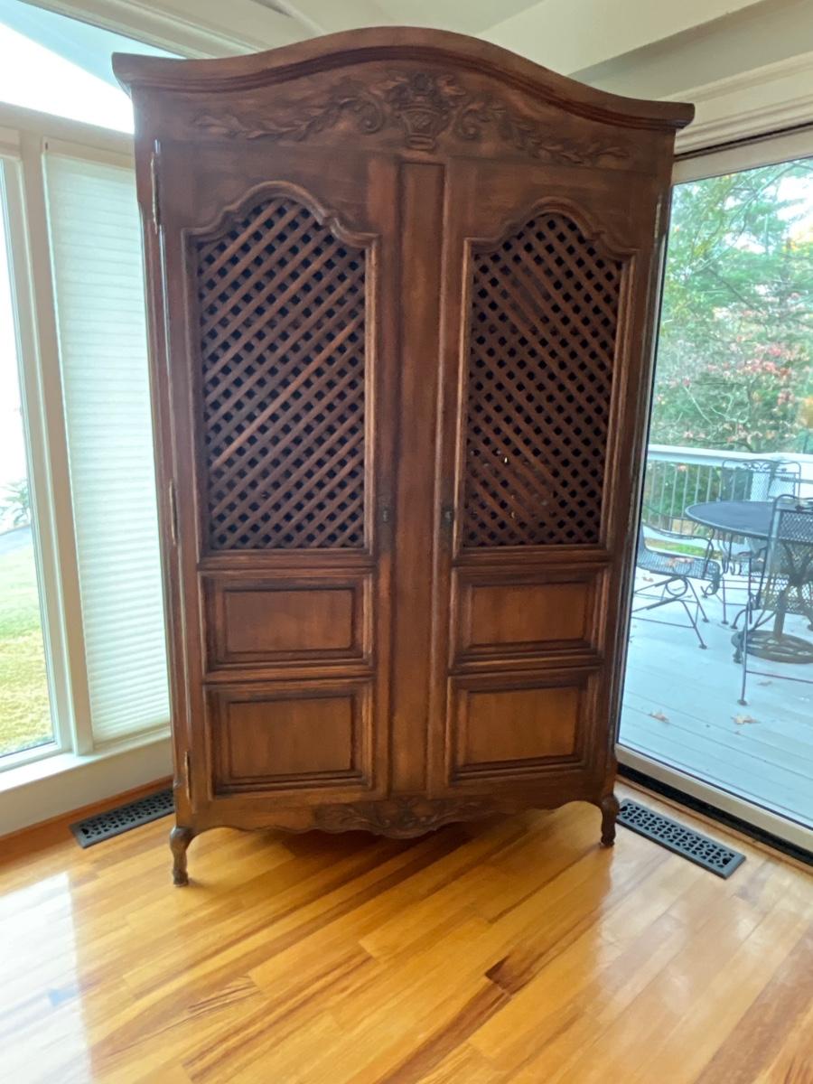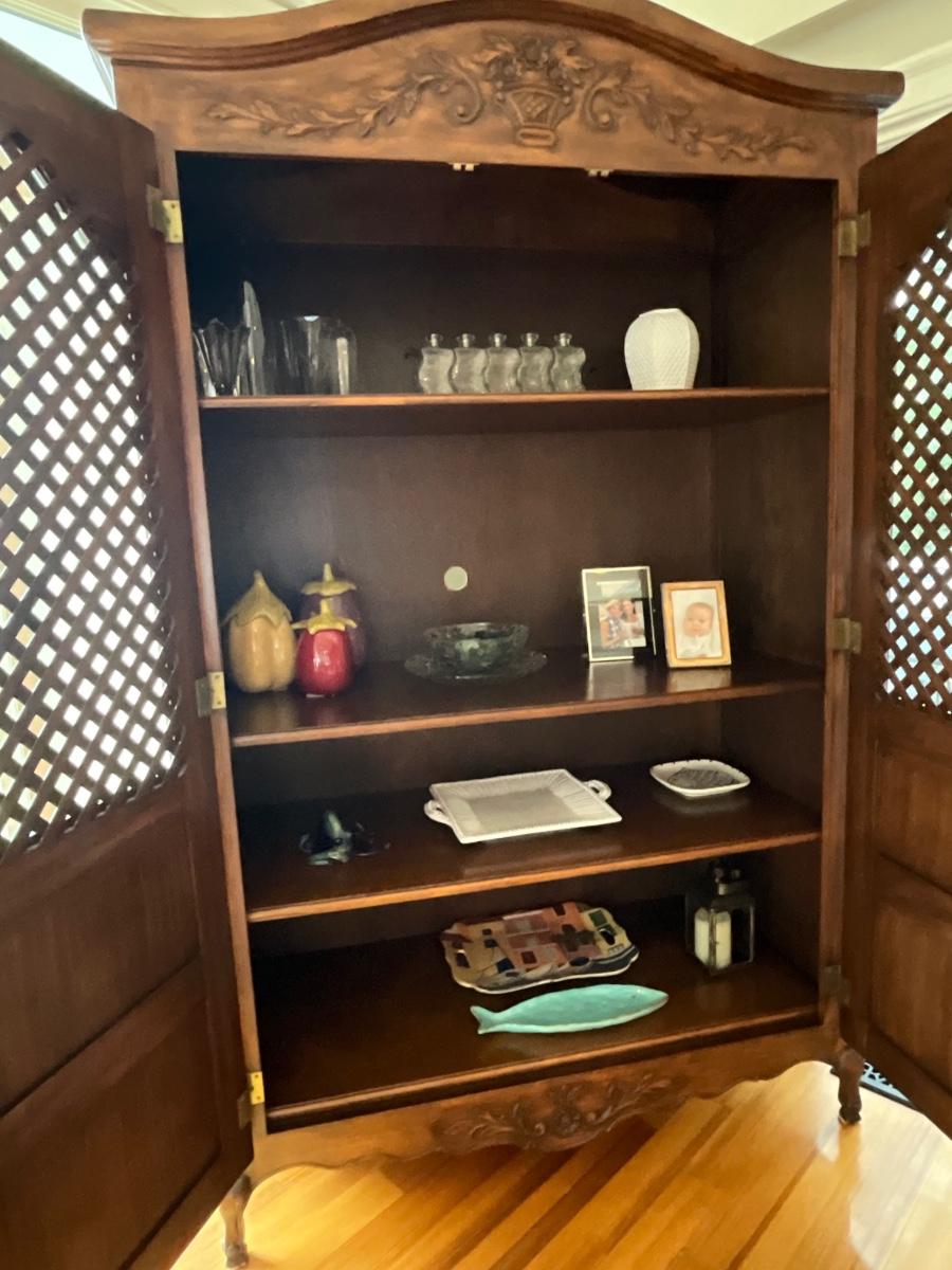 Armoire has two adjustable shelves. 82 inches tall 51 inches wide, 23 inches deep.