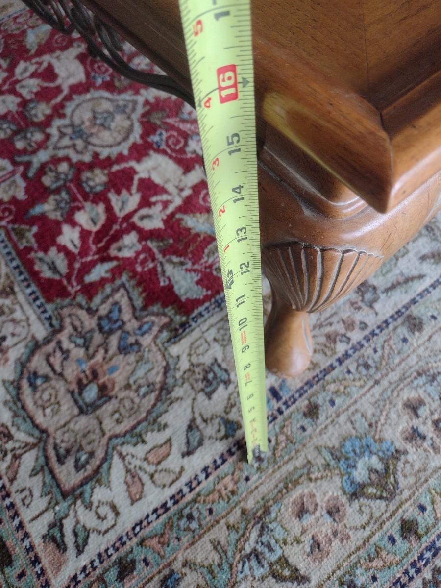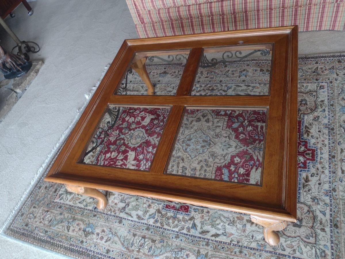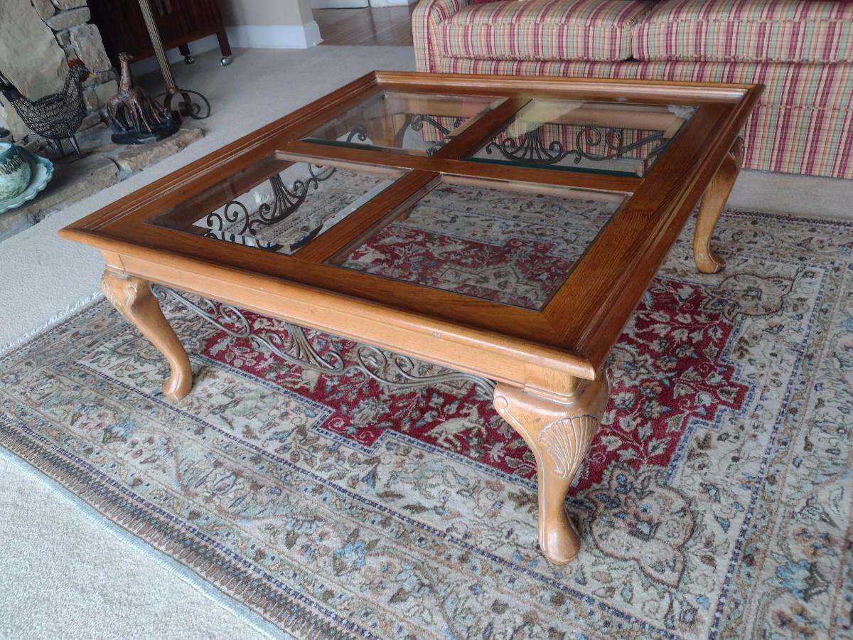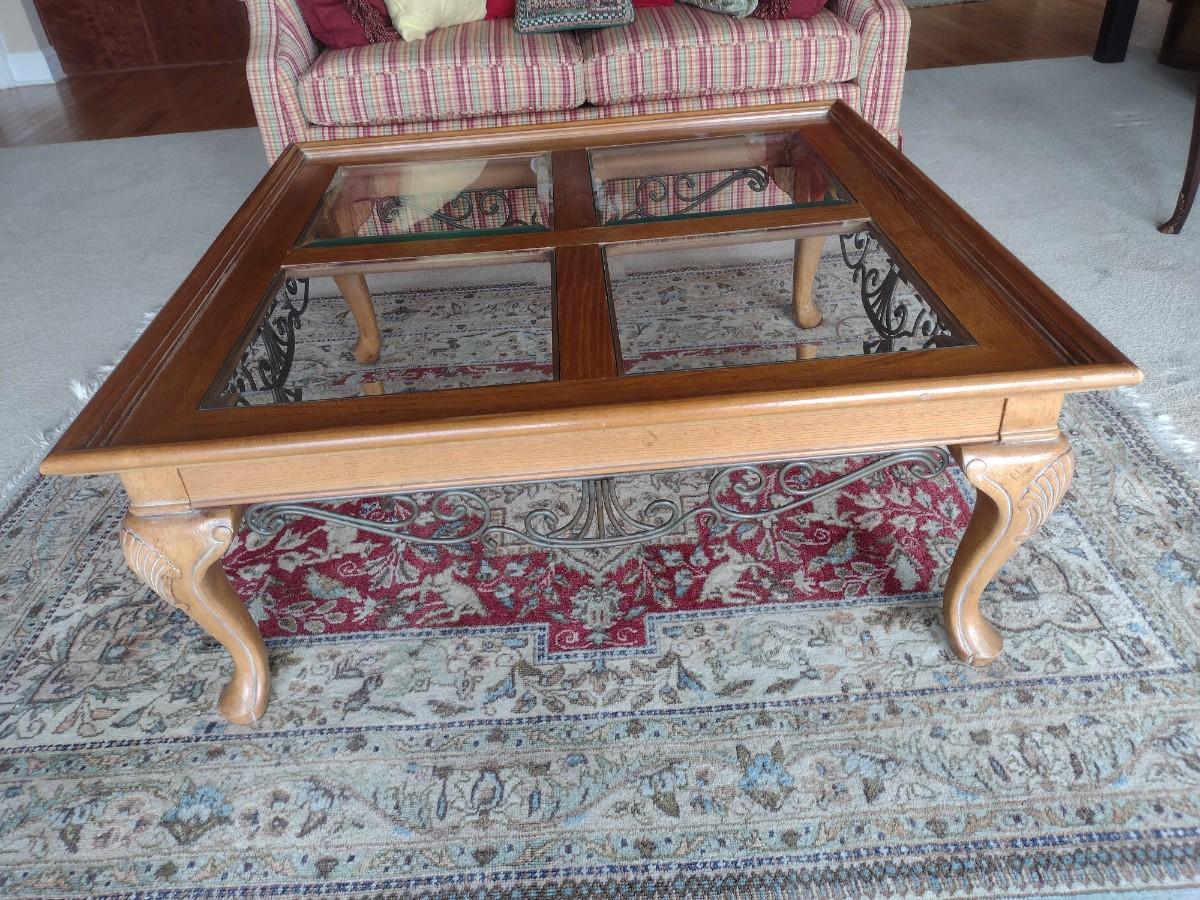 Wood Frame Glass Insert Coffee Table with Wrought Metal Apron Accents