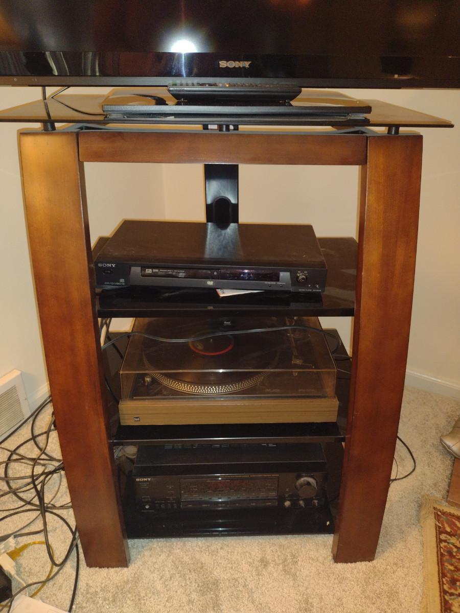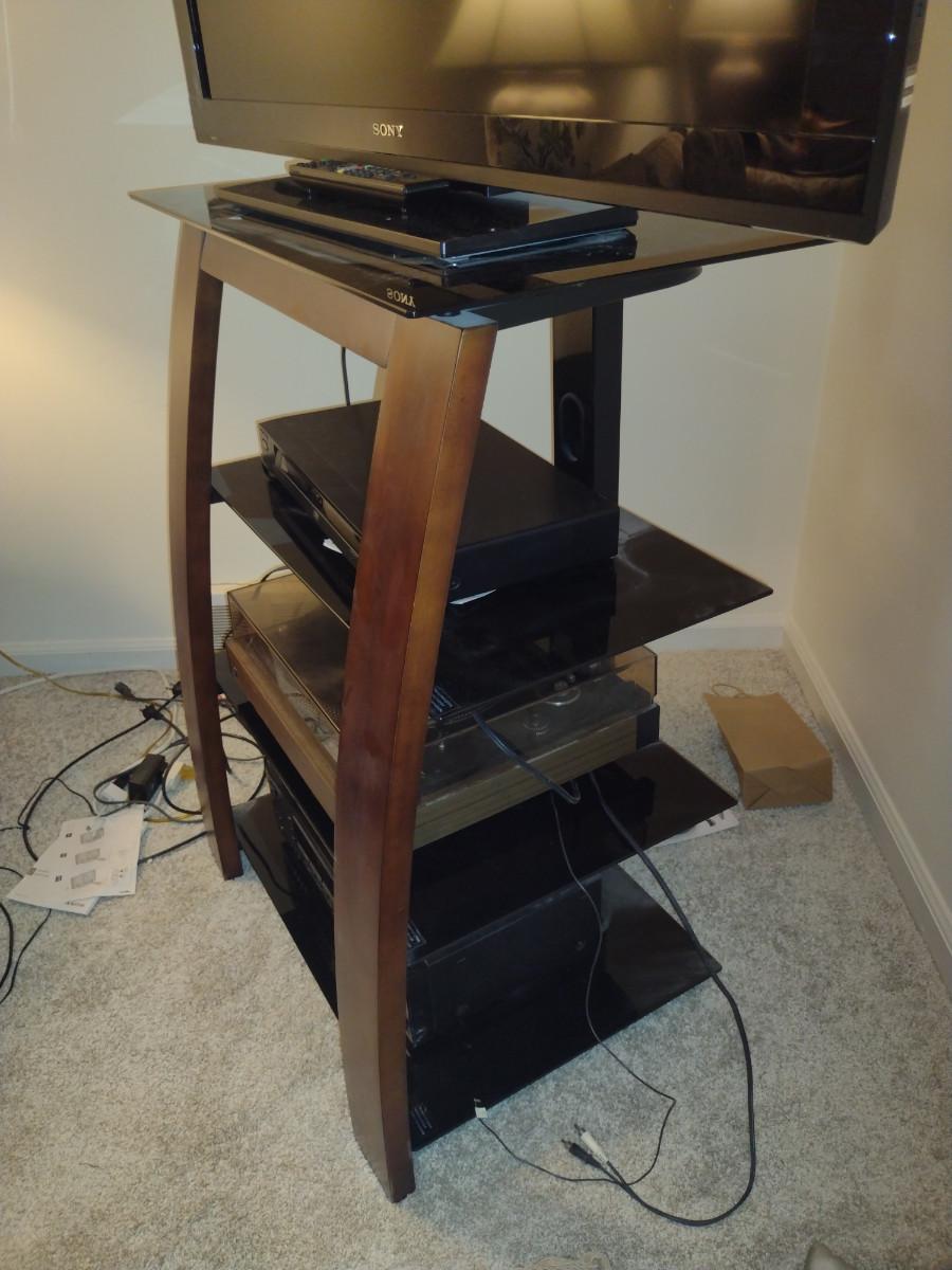Wood Frame Media Stand with Glass Shelves- Approx 27" x 15" x 36" Tall. No contents included.