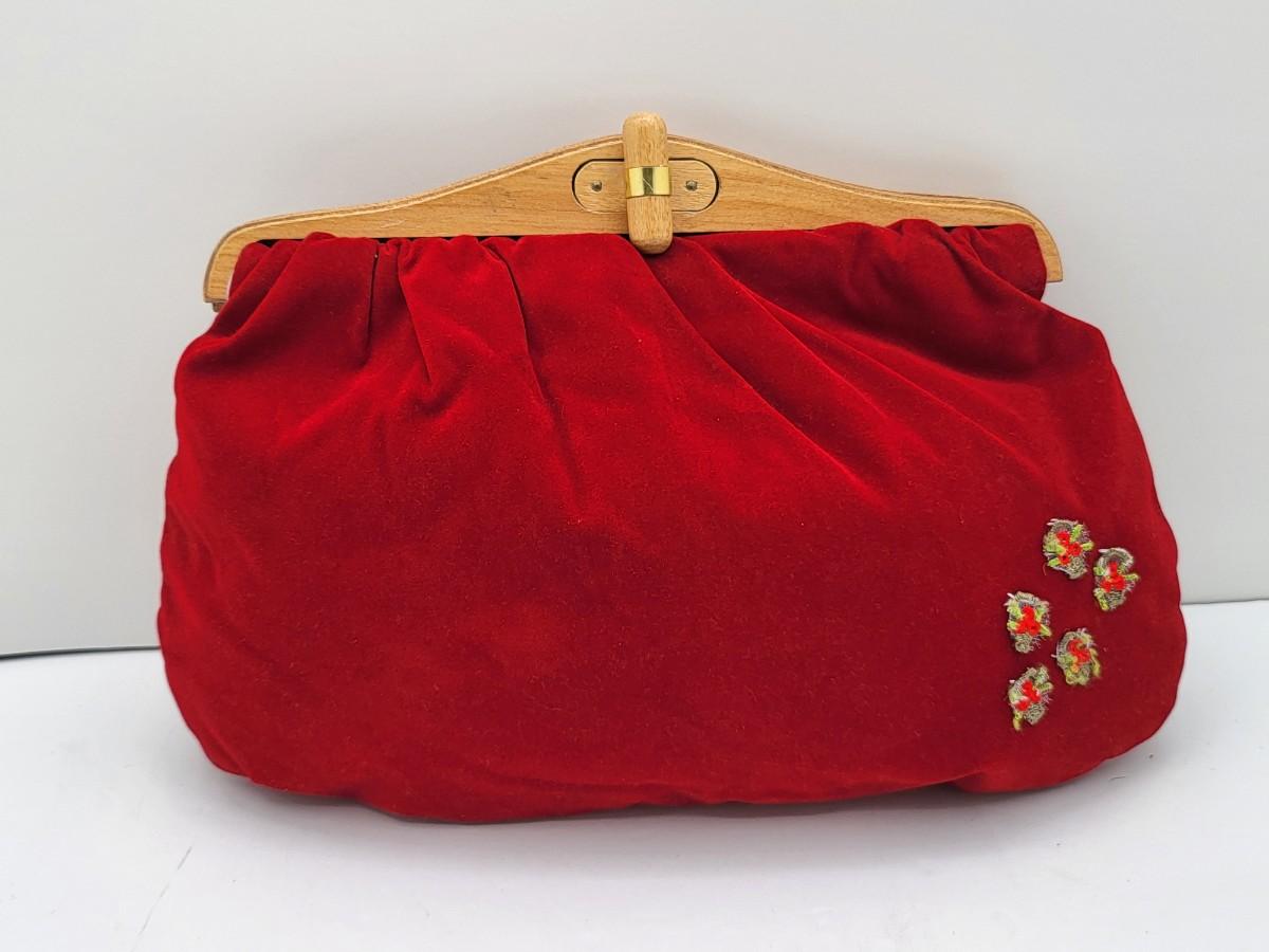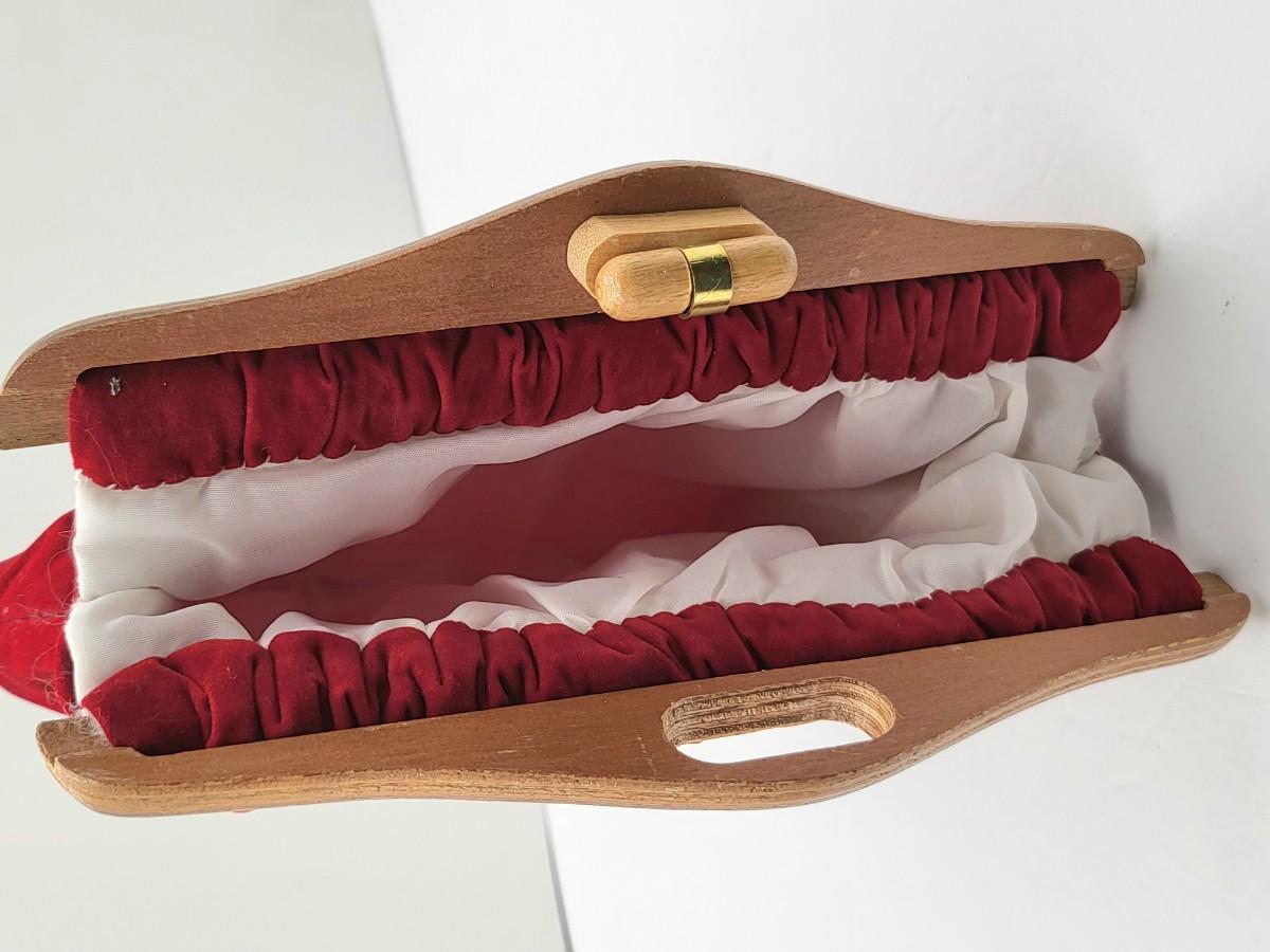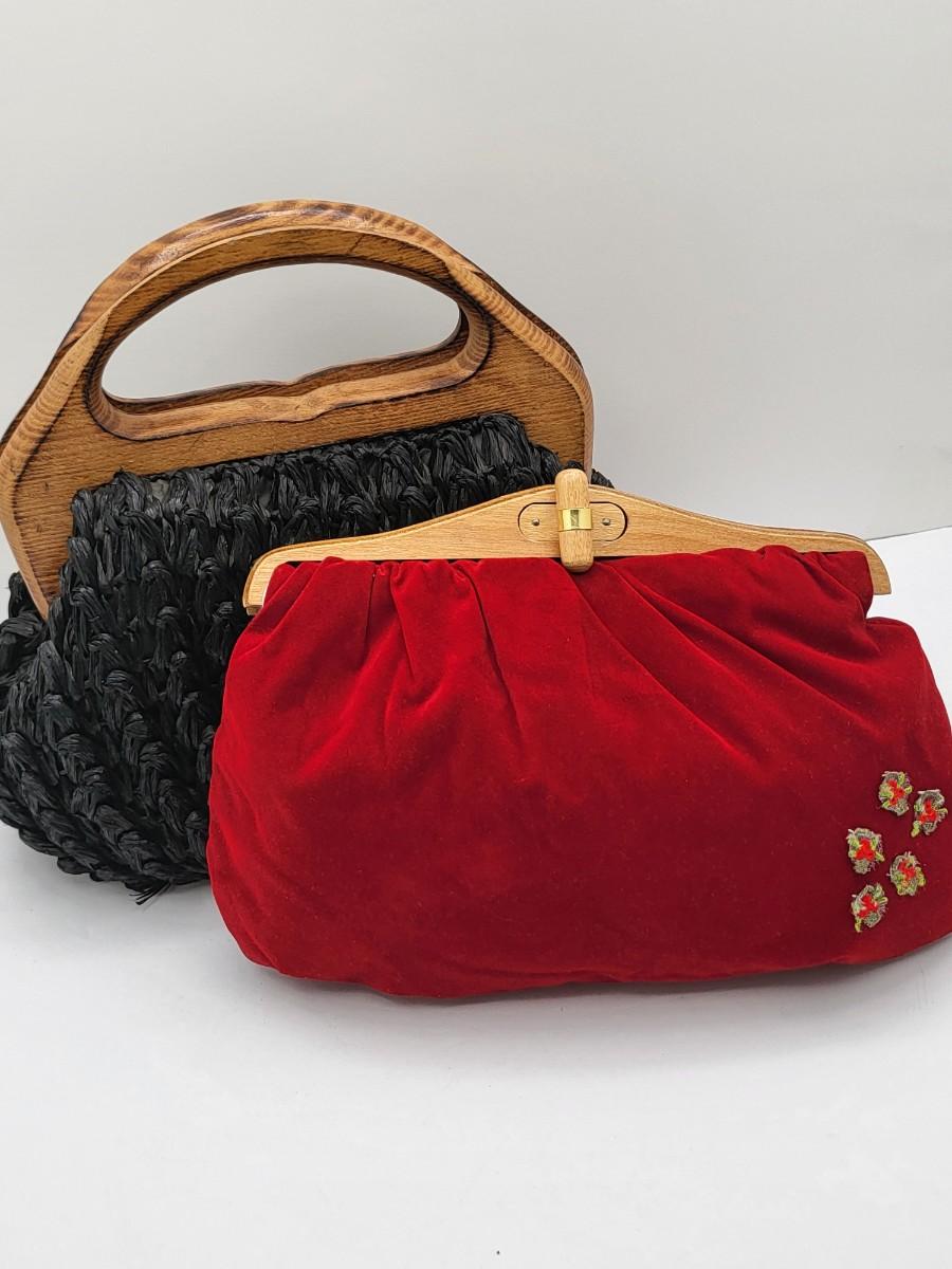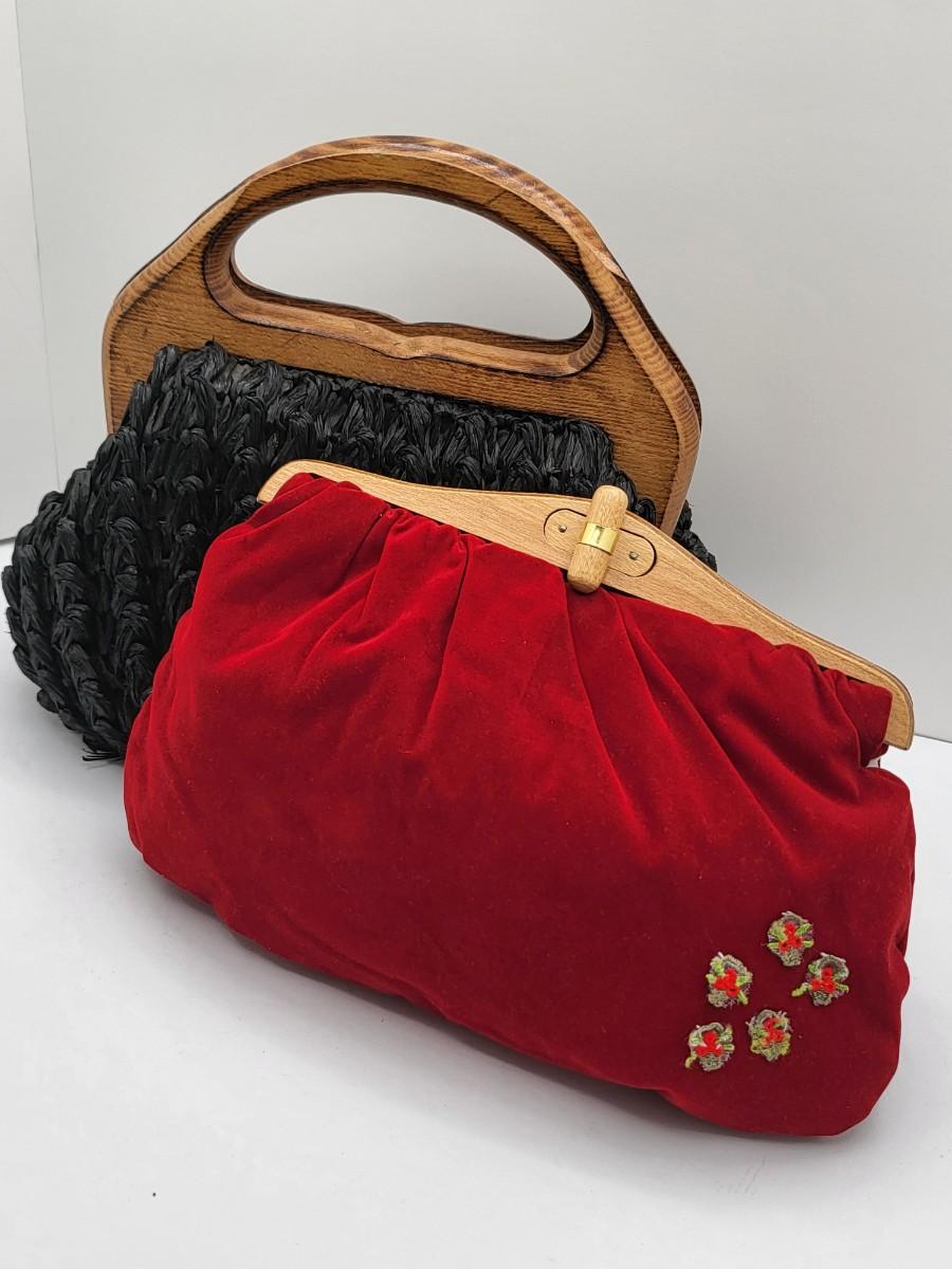 Vintage, black straw/wicker and red felt purses: Black wicker measures 10" x 9" x 4" with wood handle. Made in Japan. Red pouch with wood top is 10" x 7.5".