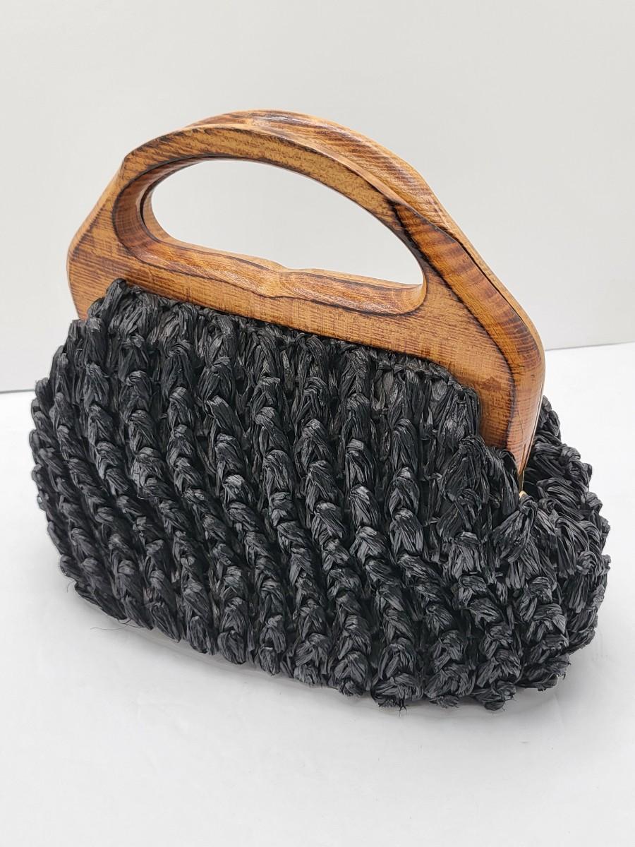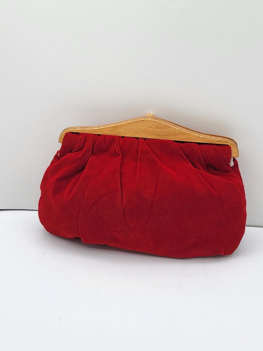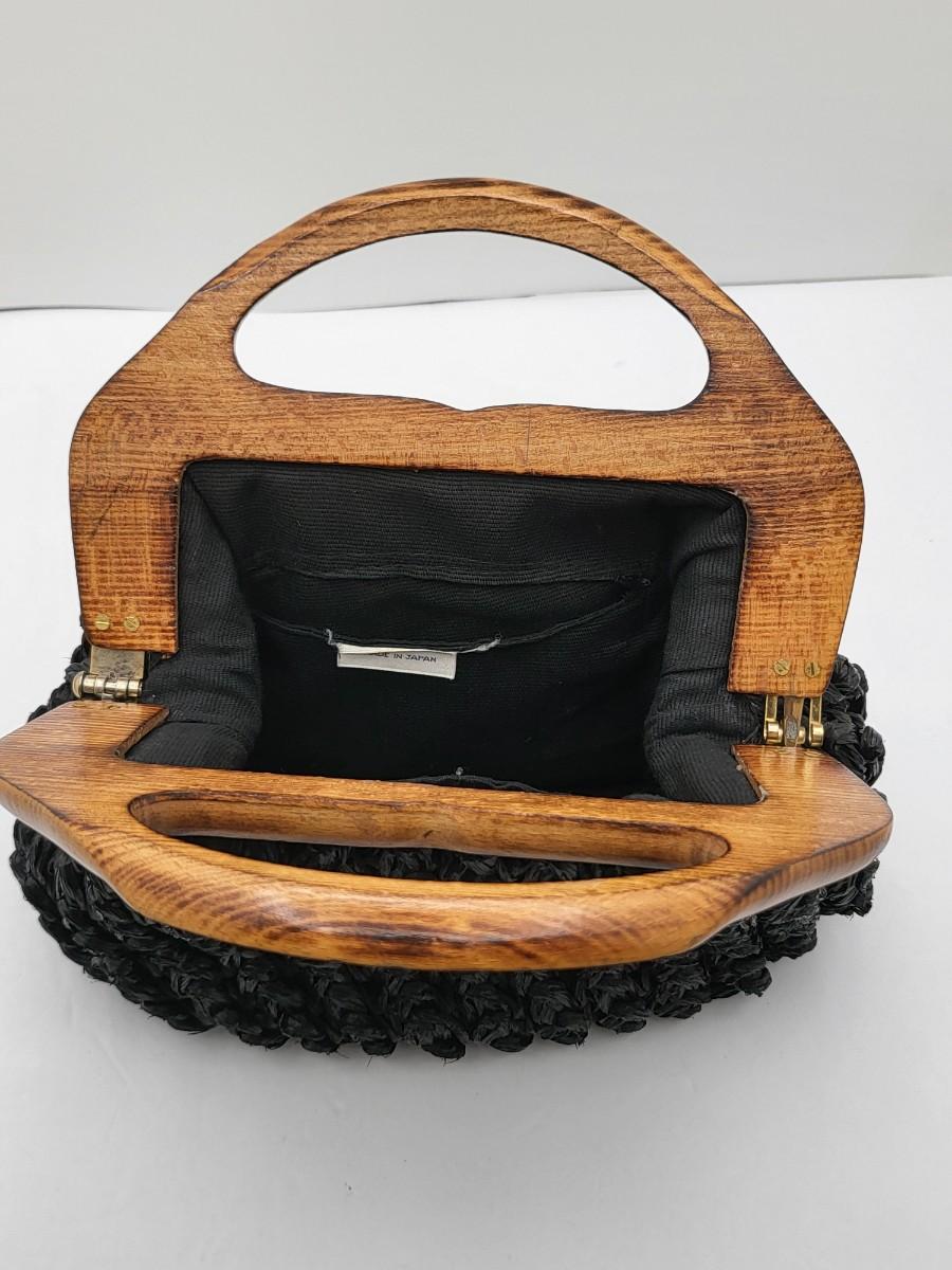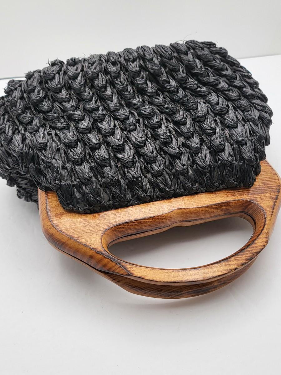 Vintage, black straw/wicker and red felt purses: Black wicker measures 10" x 9" x 4" with wood handle. Made in Japan. Red pouch with wood top is 10" x 7.5".