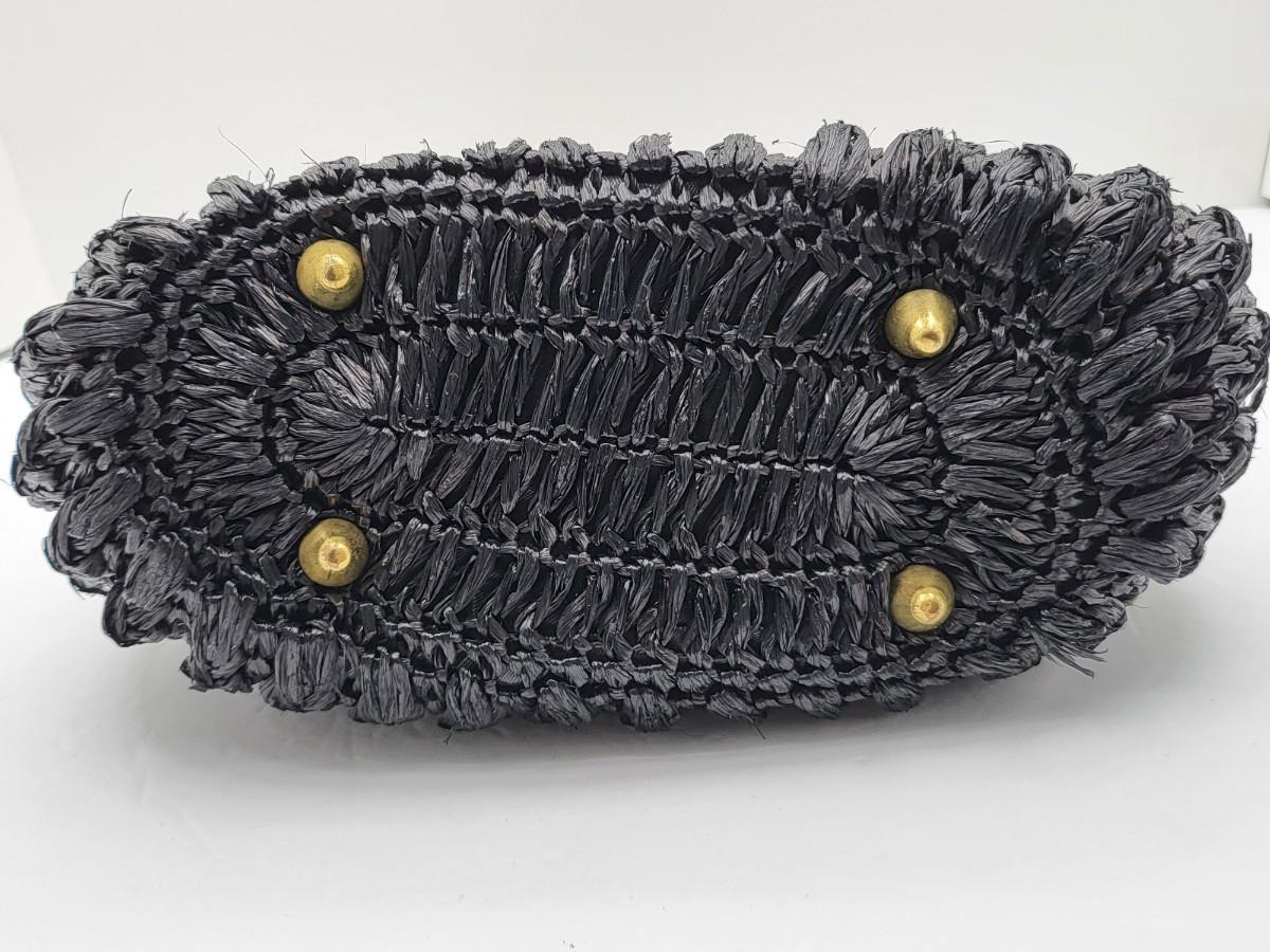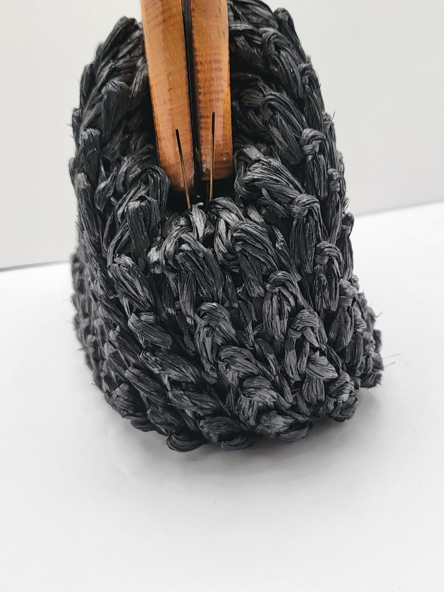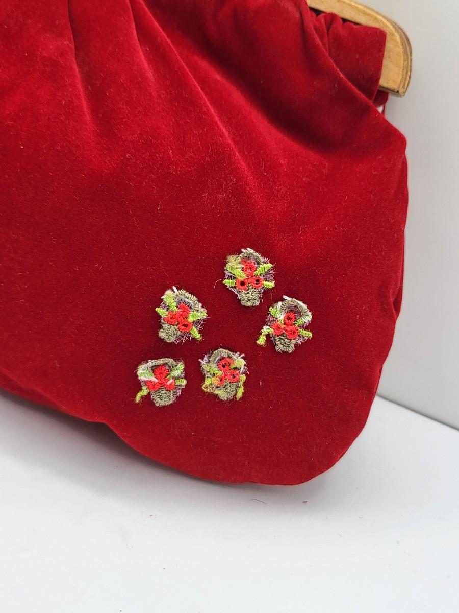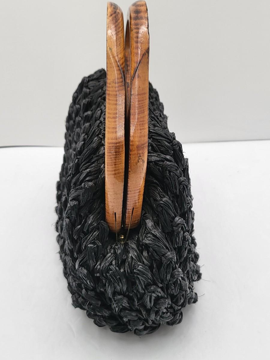 Vintage, black straw/wicker and red felt purses: Black wicker measures 10" x 9" x 4" with wood handle. Made in Japan. Red pouch with wood top is 10" x 7.5".