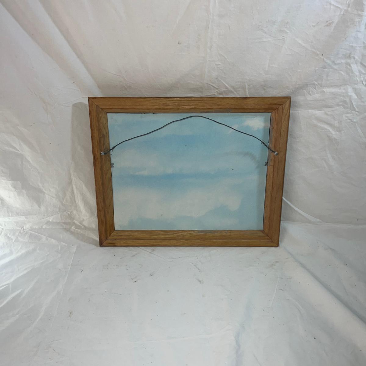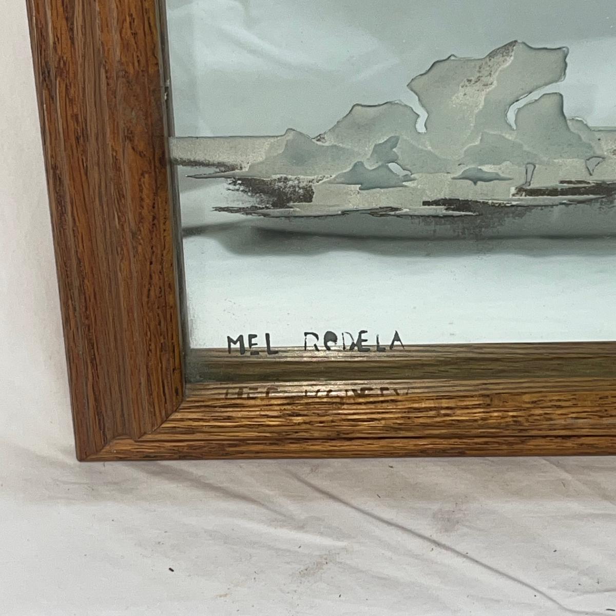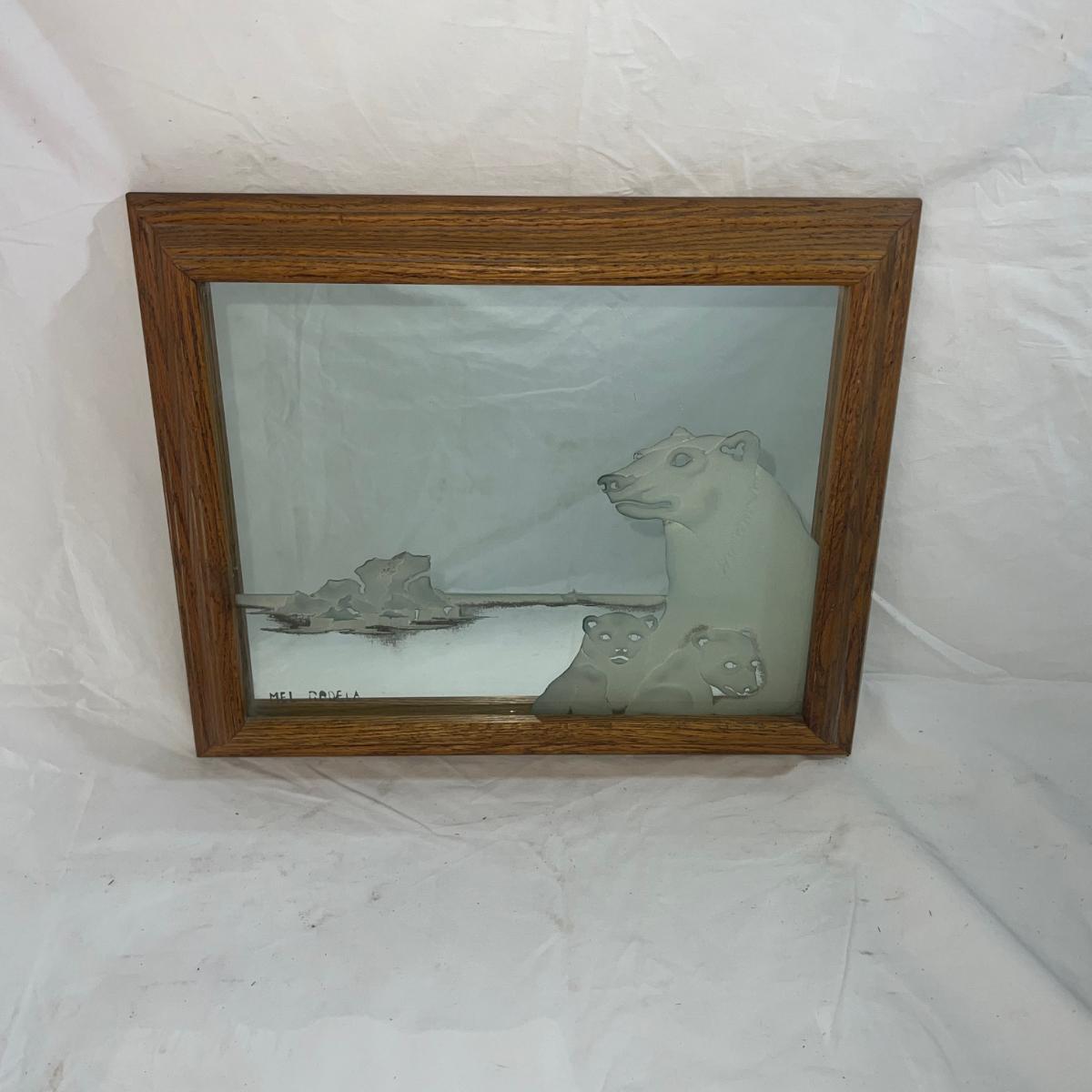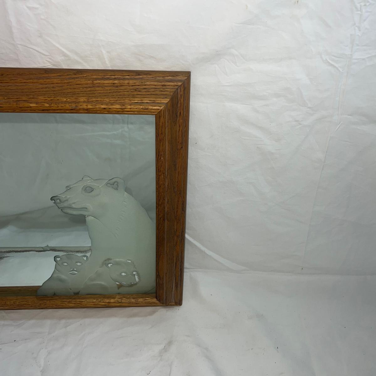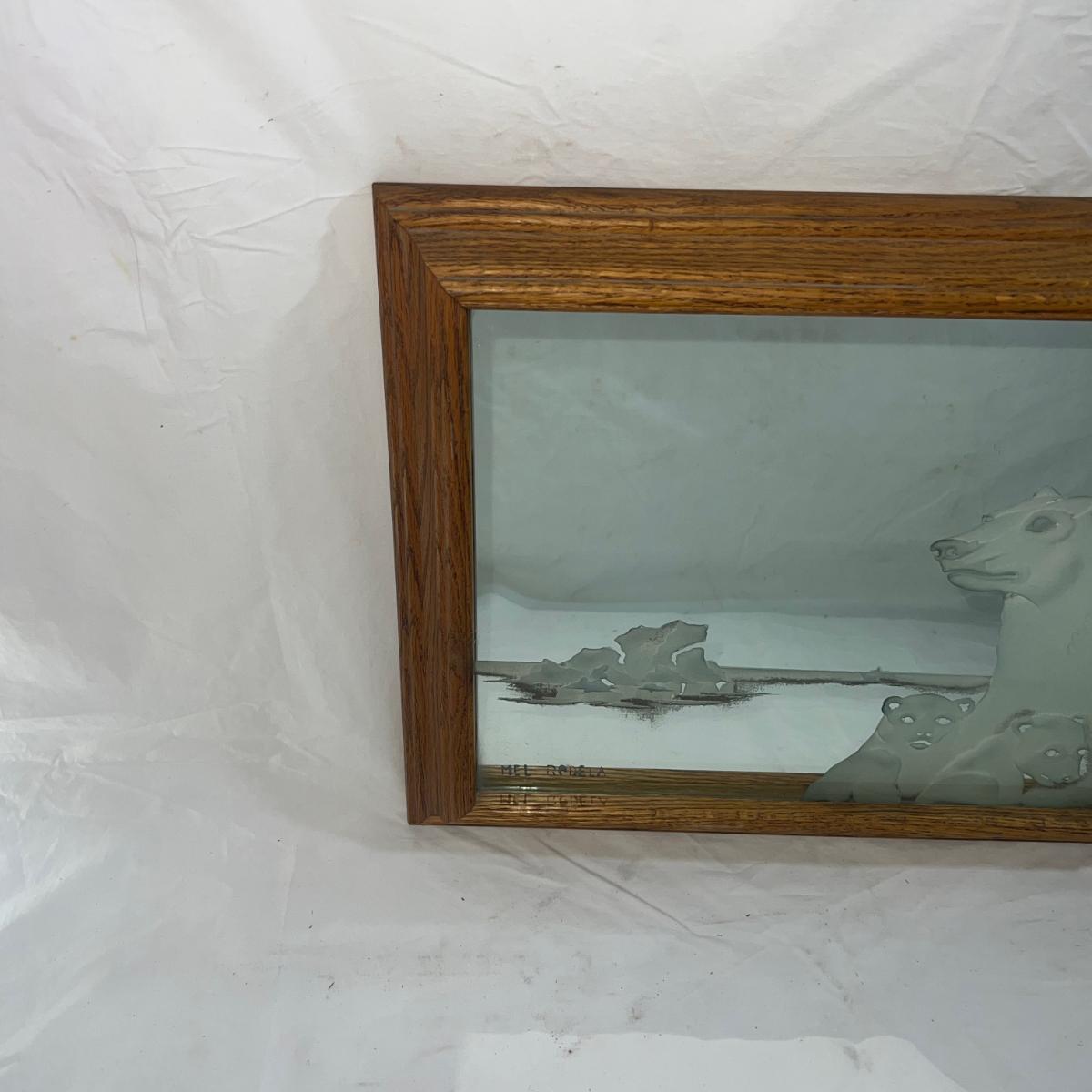 Wood Frame with Sandblasted art onto mirror of Polar Bears. Artist Signed Mel Rodela. Dimensions are 16 3/4" x 13 3/4"