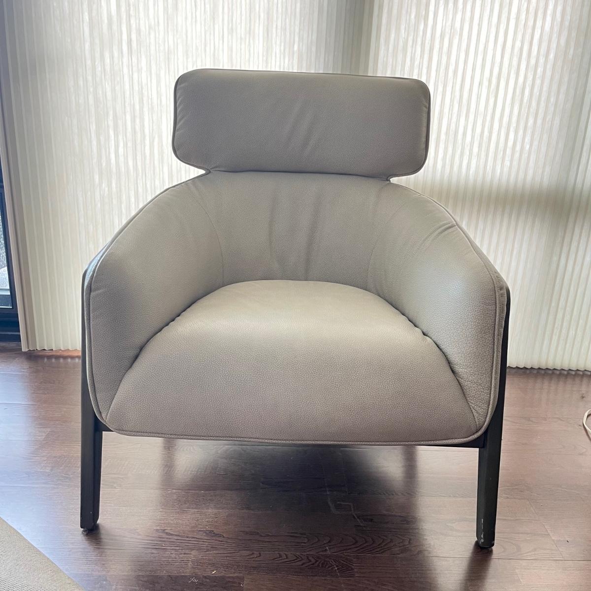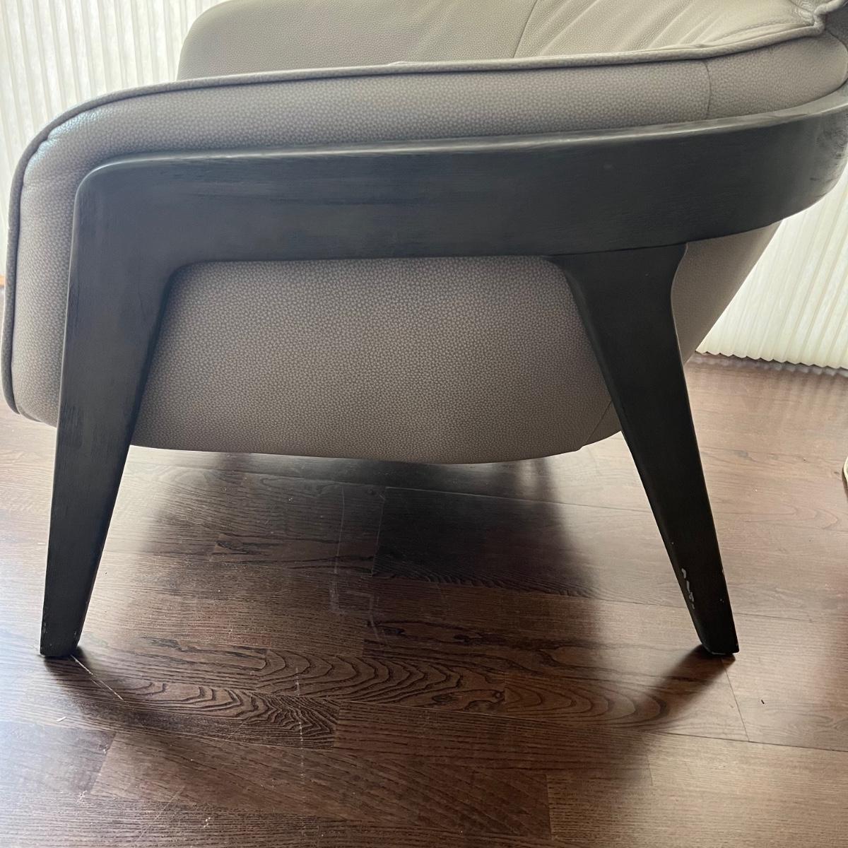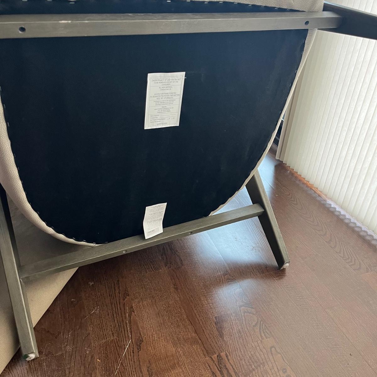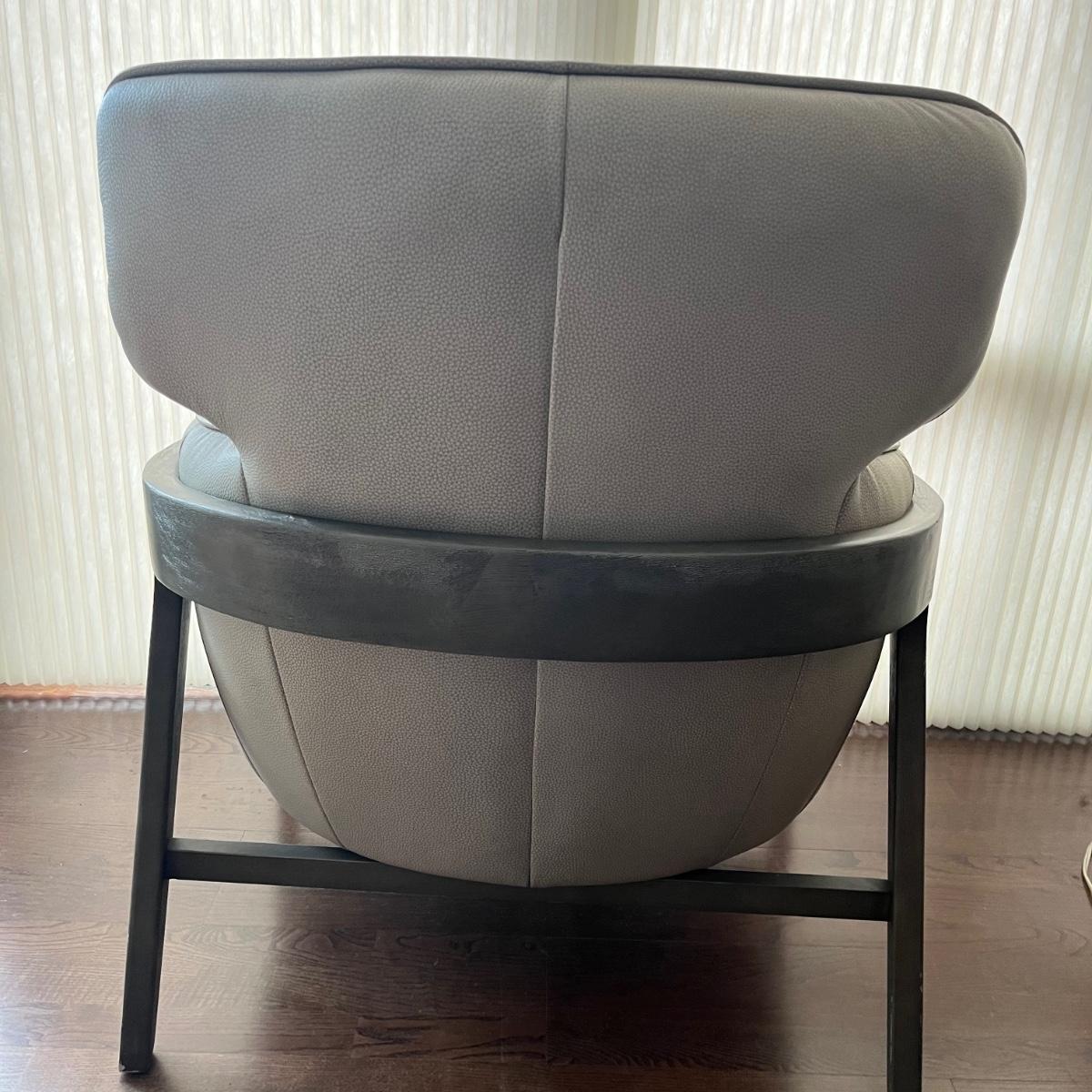Lot includes a wooden framed accent chair with what appears to be leather covering, but it is not labeled leather. Chair is in excellent condition with a few scratches on legs, see pictures. Chair measures 32” x 36” x 36” with a 17” seat height.