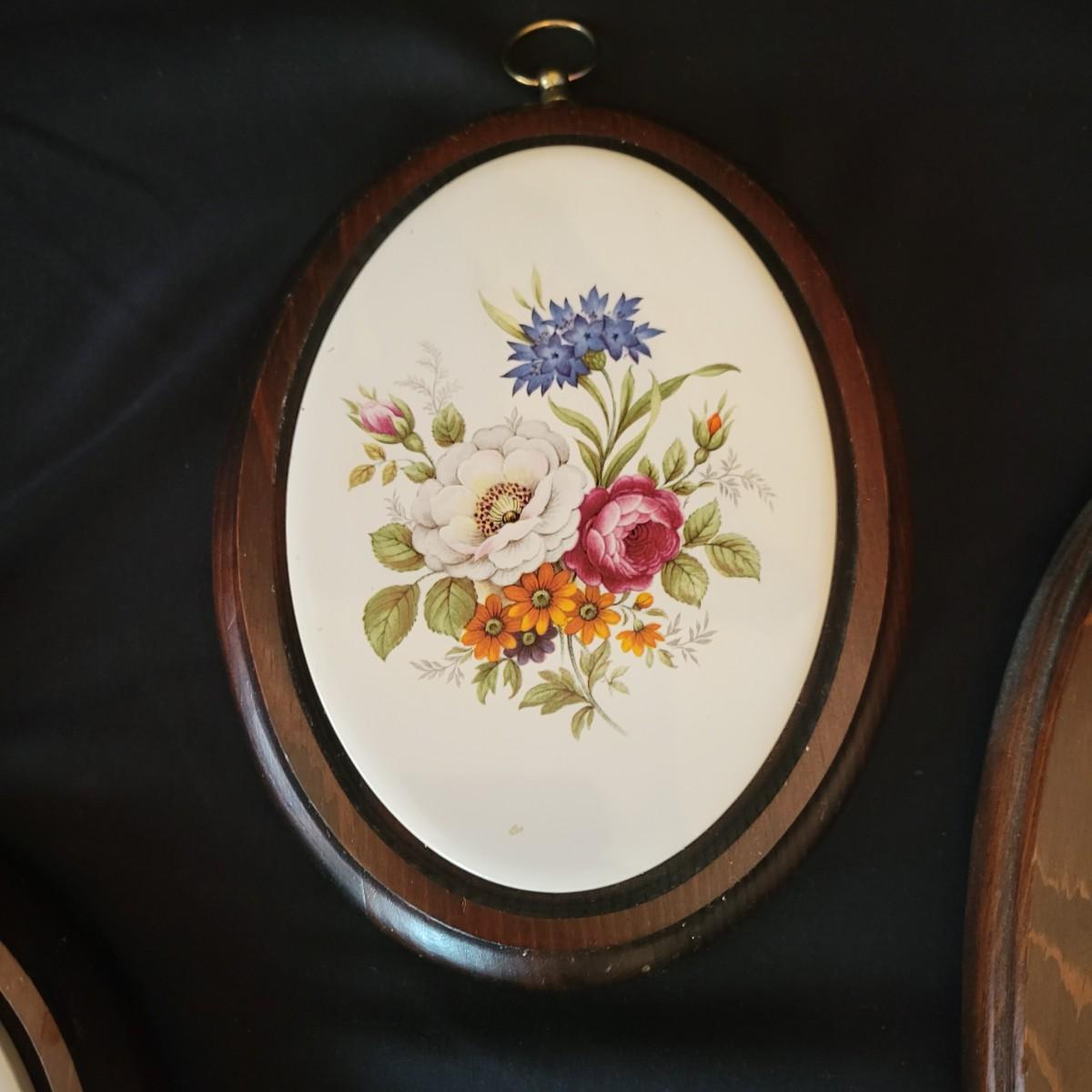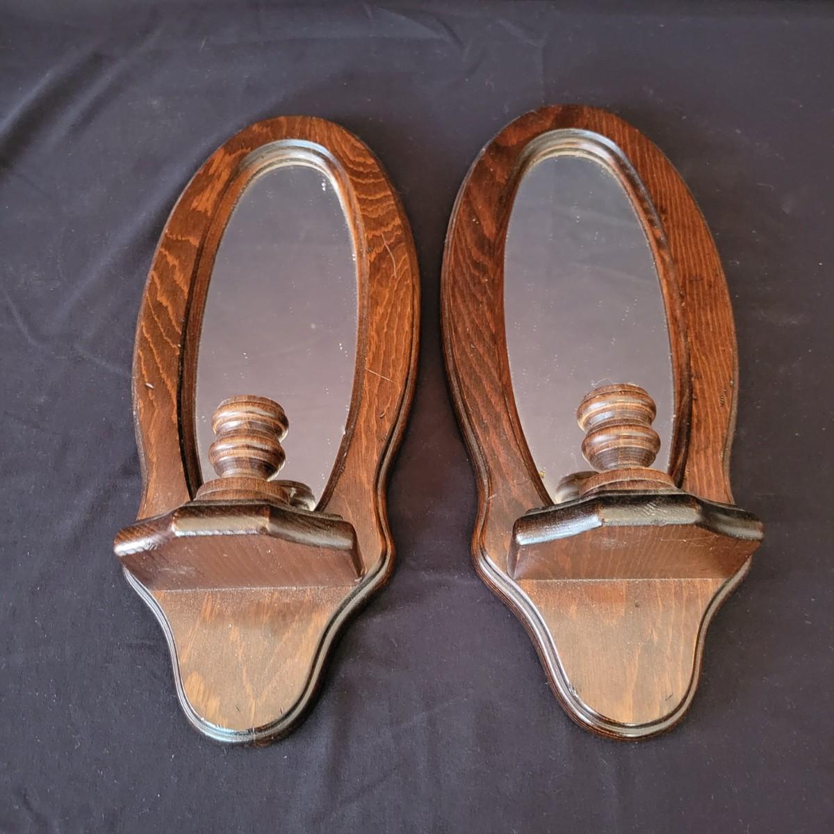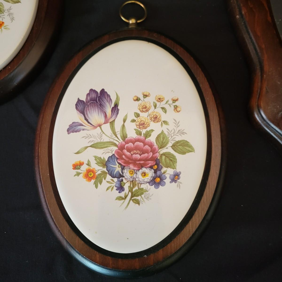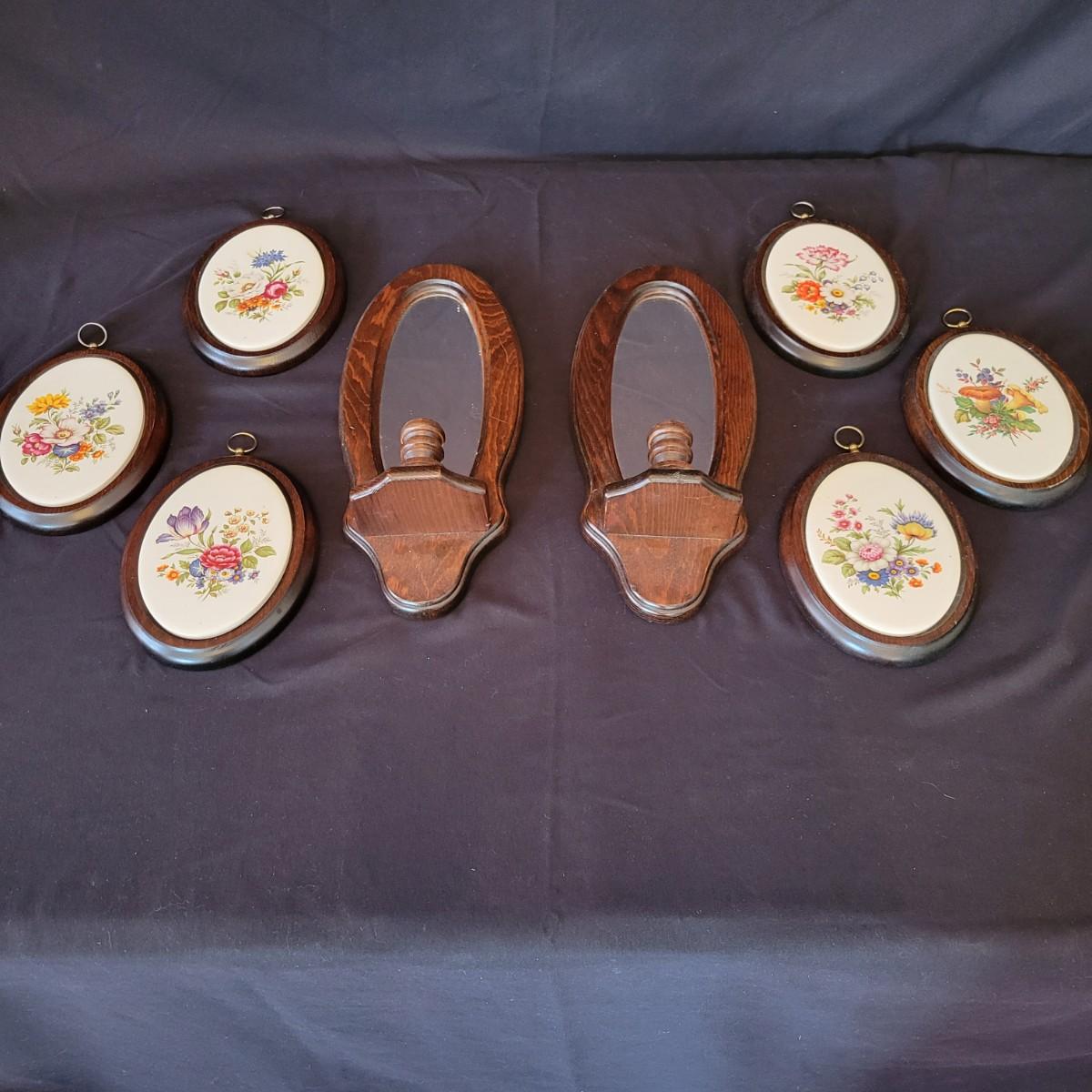 An assortment of framed ceramic art pieces and wall mounted candle holders with some minor scratches. All pieces have wooden, dark brown stained frames. The ceramic art features a botanical motif and the candle holders have oval mirrors. Candle holders measure approximately 6" x 3.5" x 14.5" H. Local pickup only