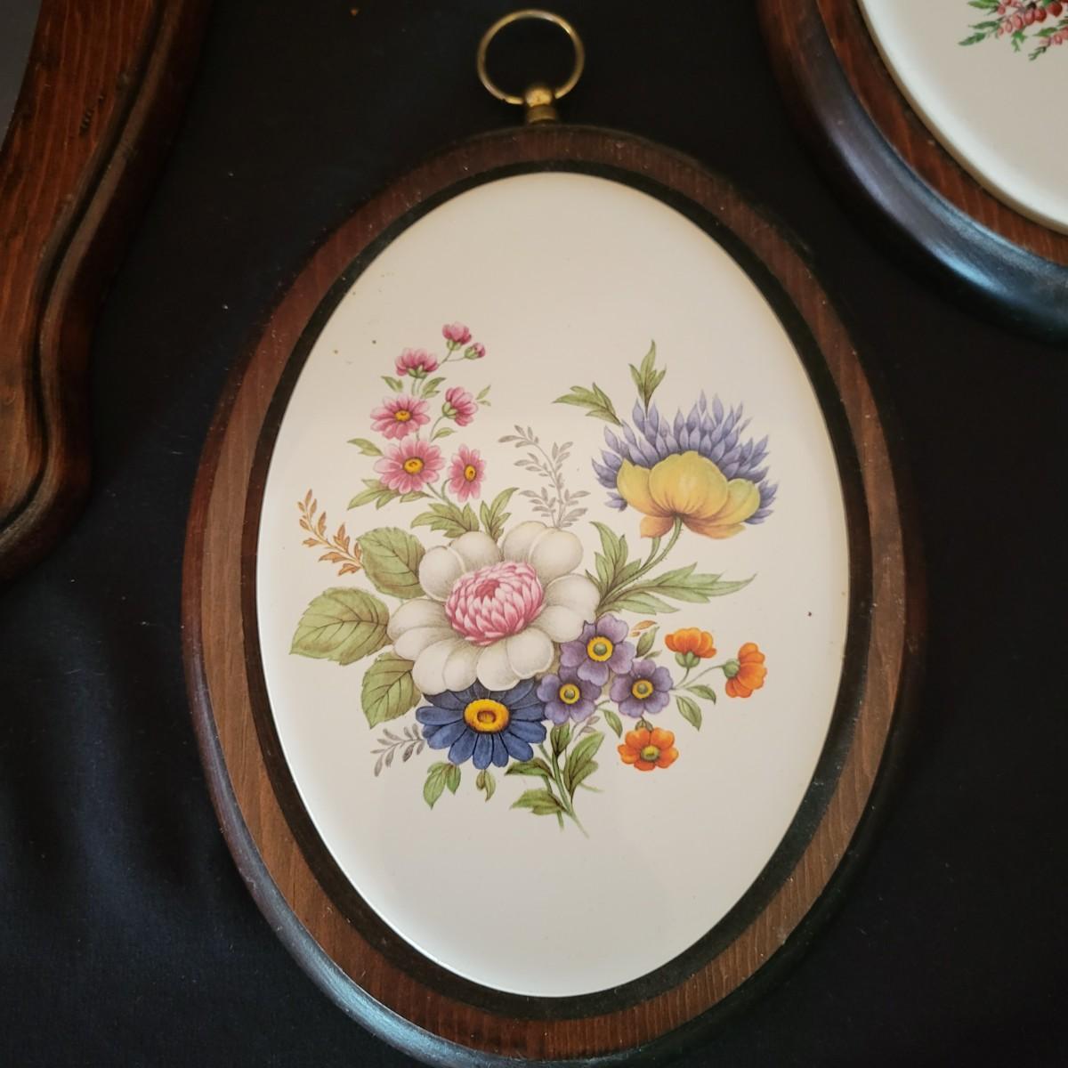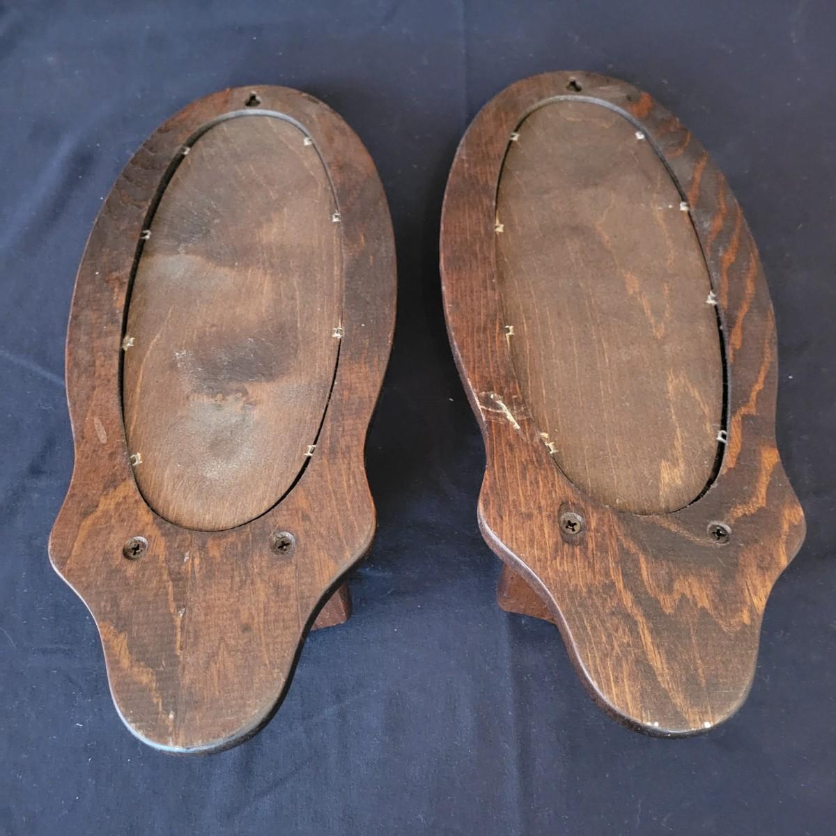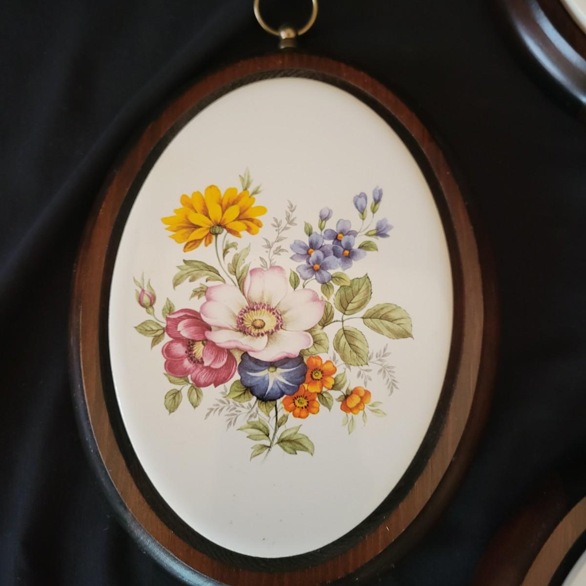 An assortment of framed ceramic art pieces and wall mounted candle holders with some minor scratches. All pieces have wooden, dark brown stained frames. The ceramic art features a botanical motif and the candle holders have oval mirrors. Candle holders measure approximately 6" x 3.5" x 14.5" H. Local pickup only