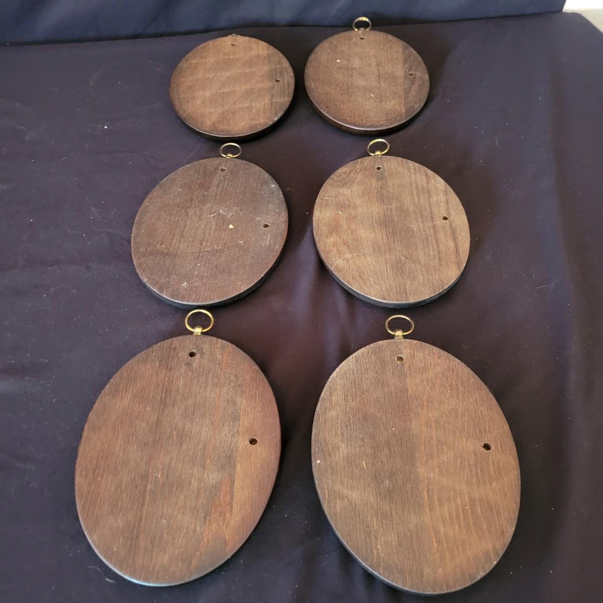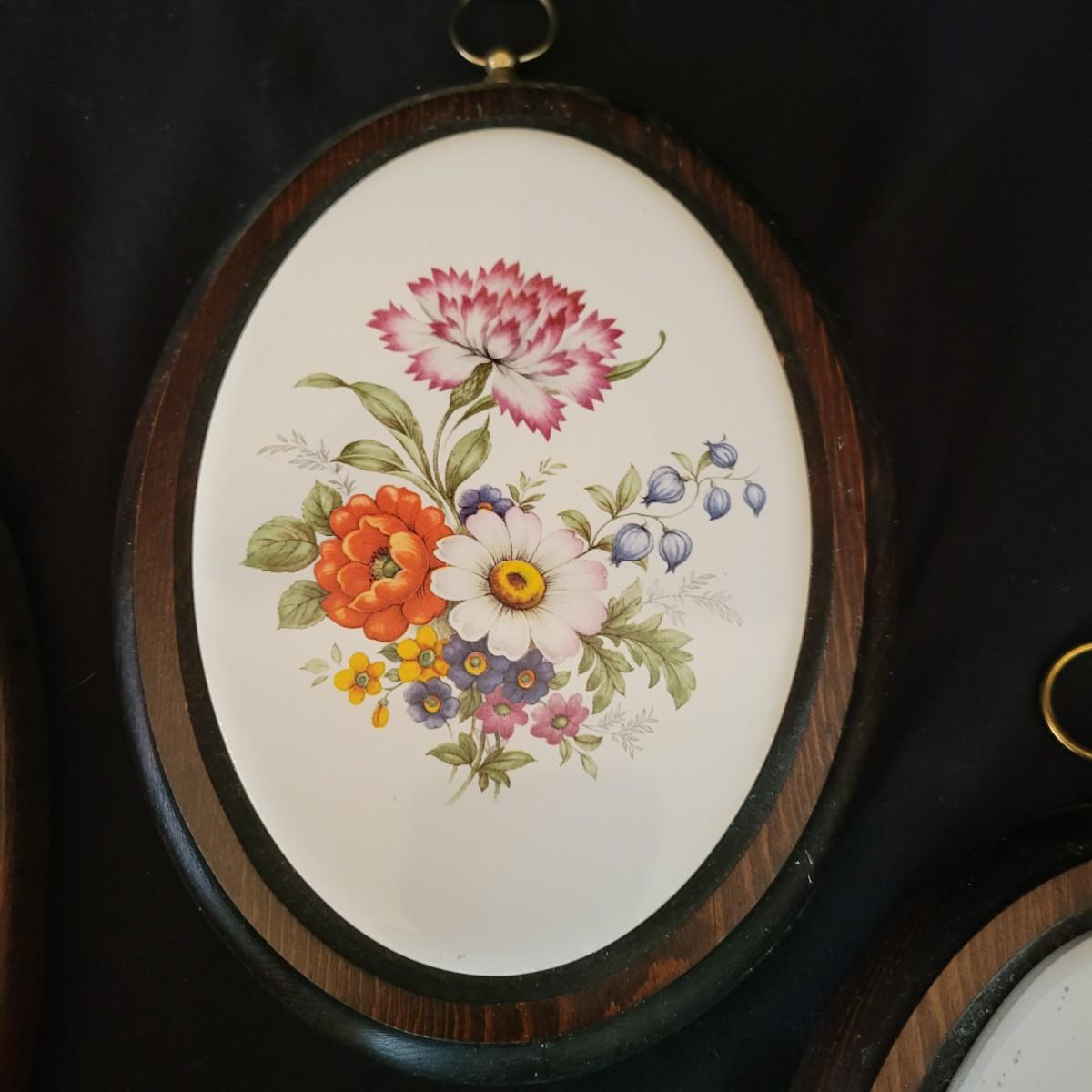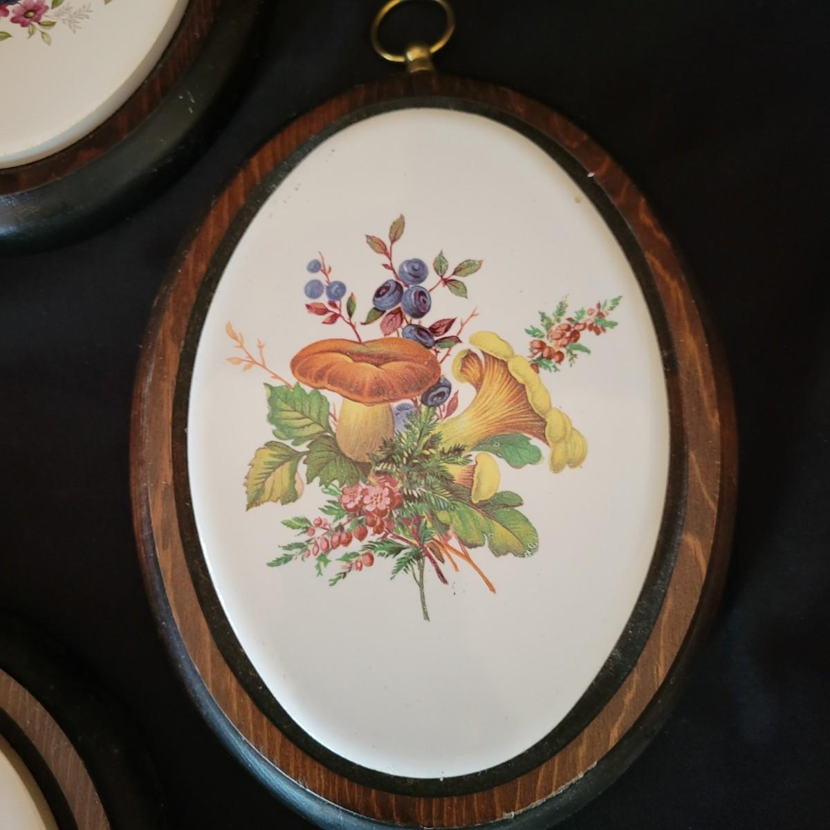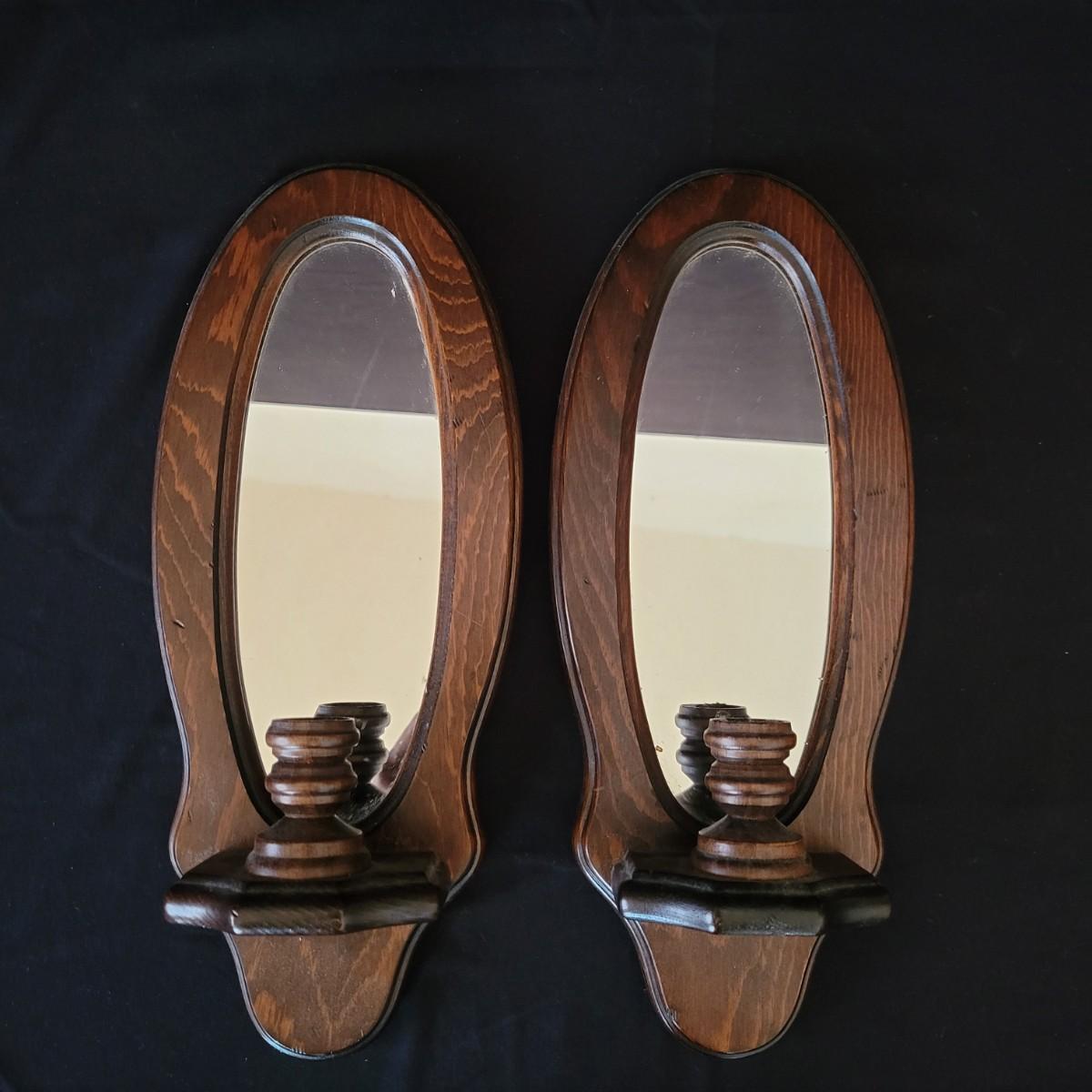 An assortment of framed ceramic art pieces and wall mounted candle holders with some minor scratches. All pieces have wooden, dark brown stained frames. The ceramic art features a botanical motif and the candle holders have oval mirrors. Candle holders measure approximately 6" x 3.5" x 14.5" H. Local pickup only
