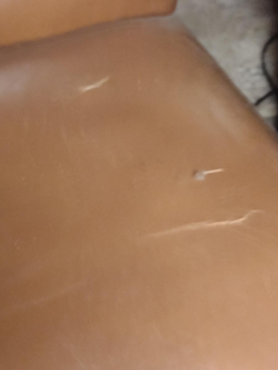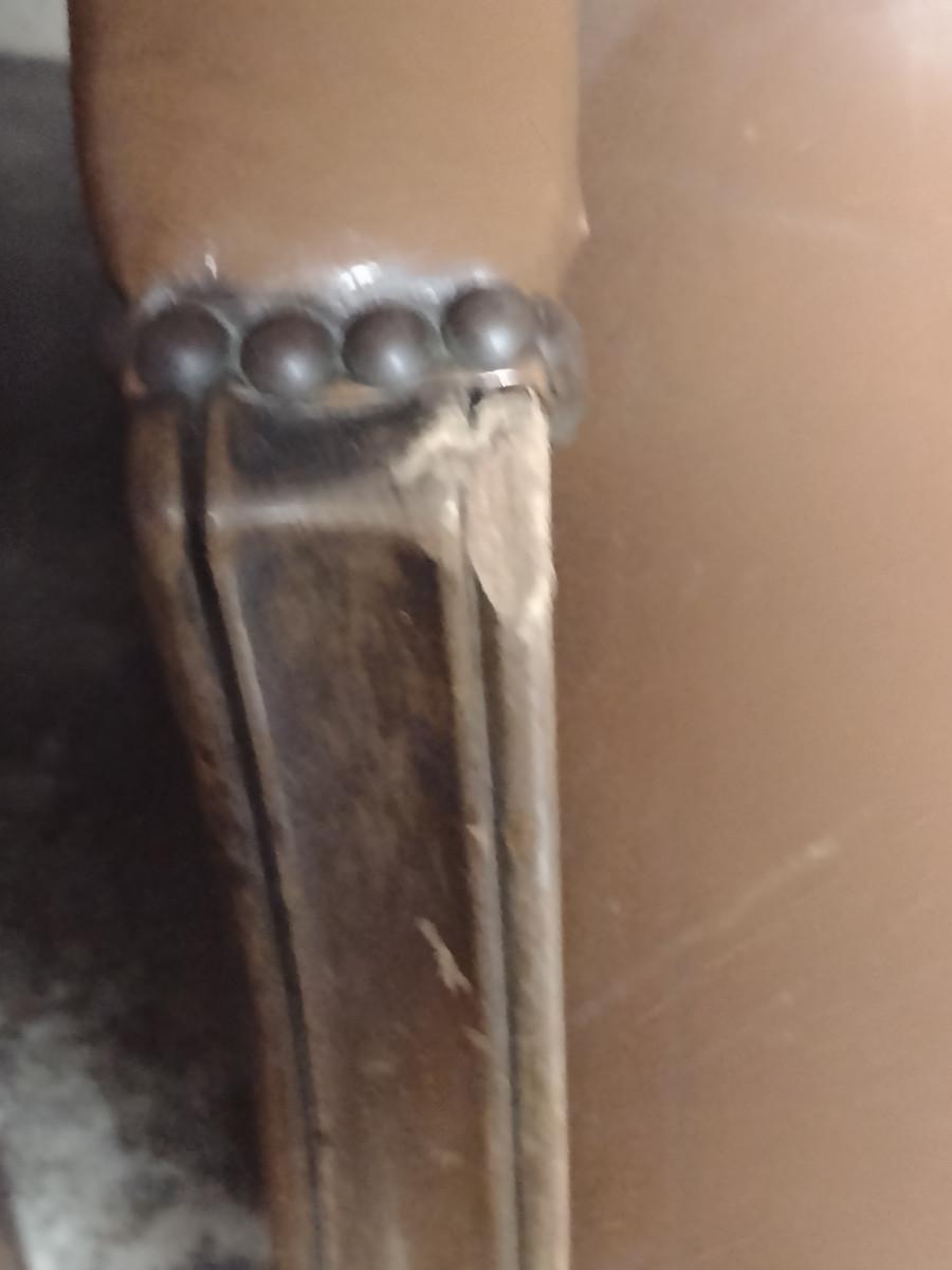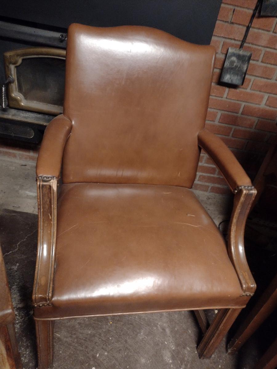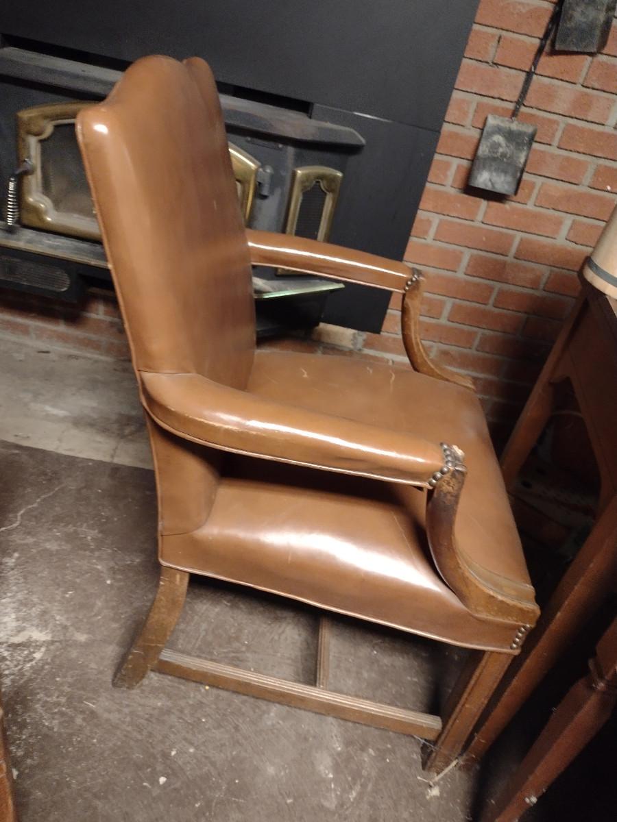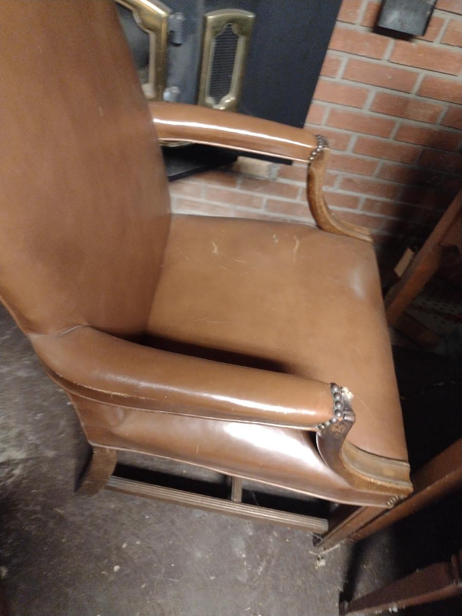 Wood Framed, Faux Leather Covered Chair with Brass Tack Accents. Item has some areas of damage to upholstery and frame- please see all pictures.