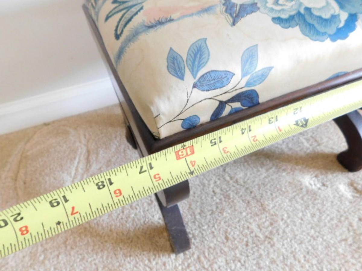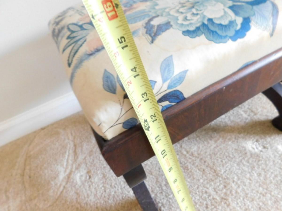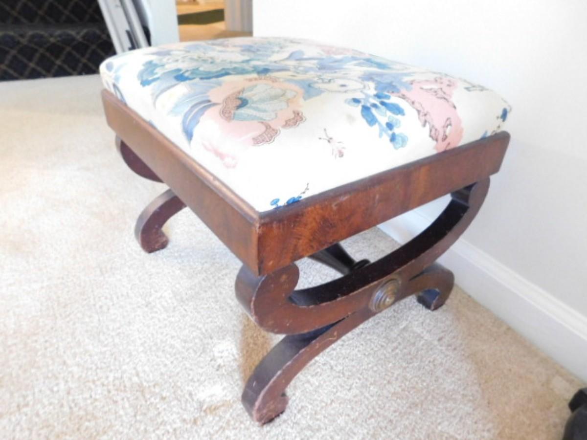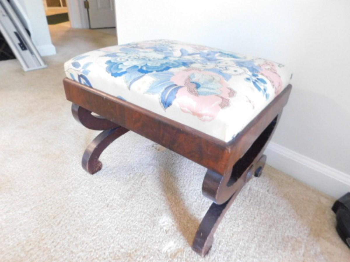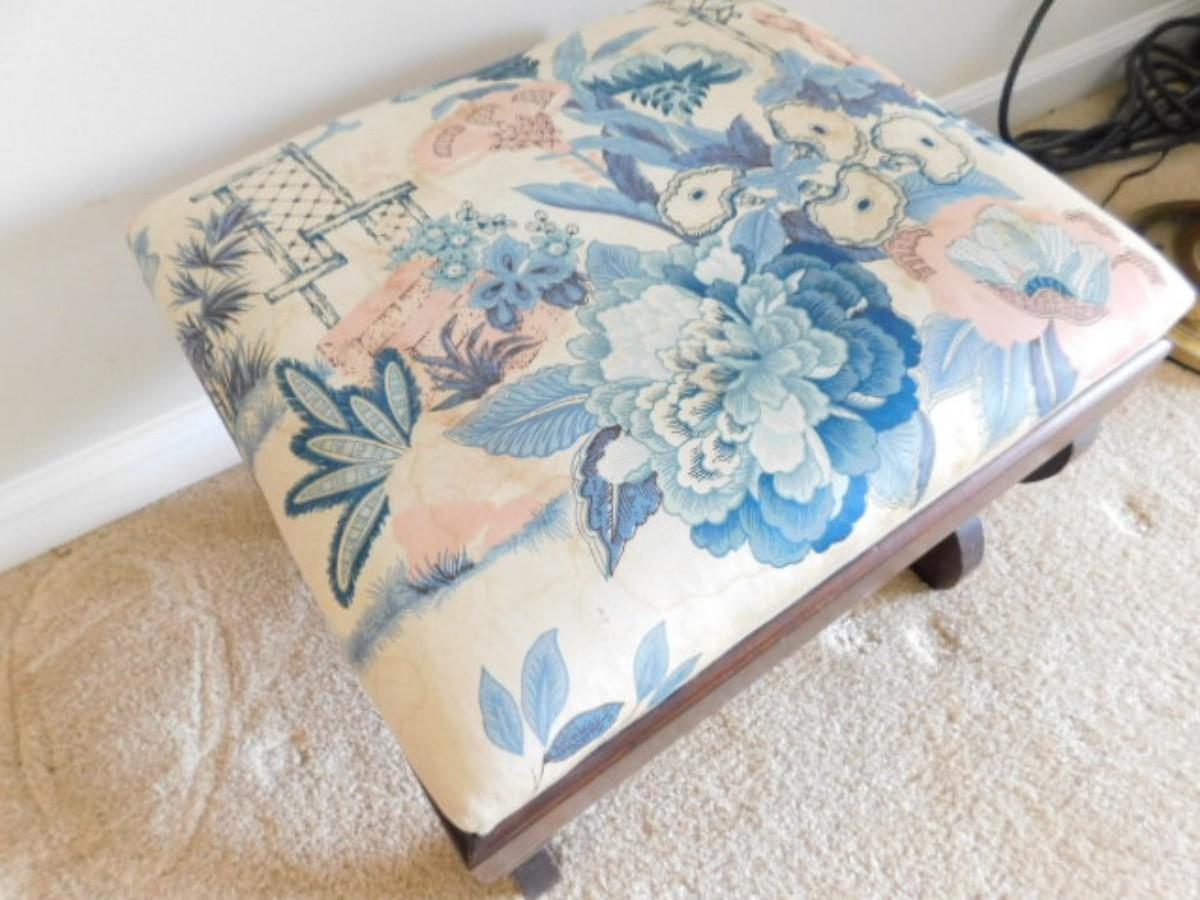 Wood Framed Foot Stool with Cushioned Top upholstery has some staining.