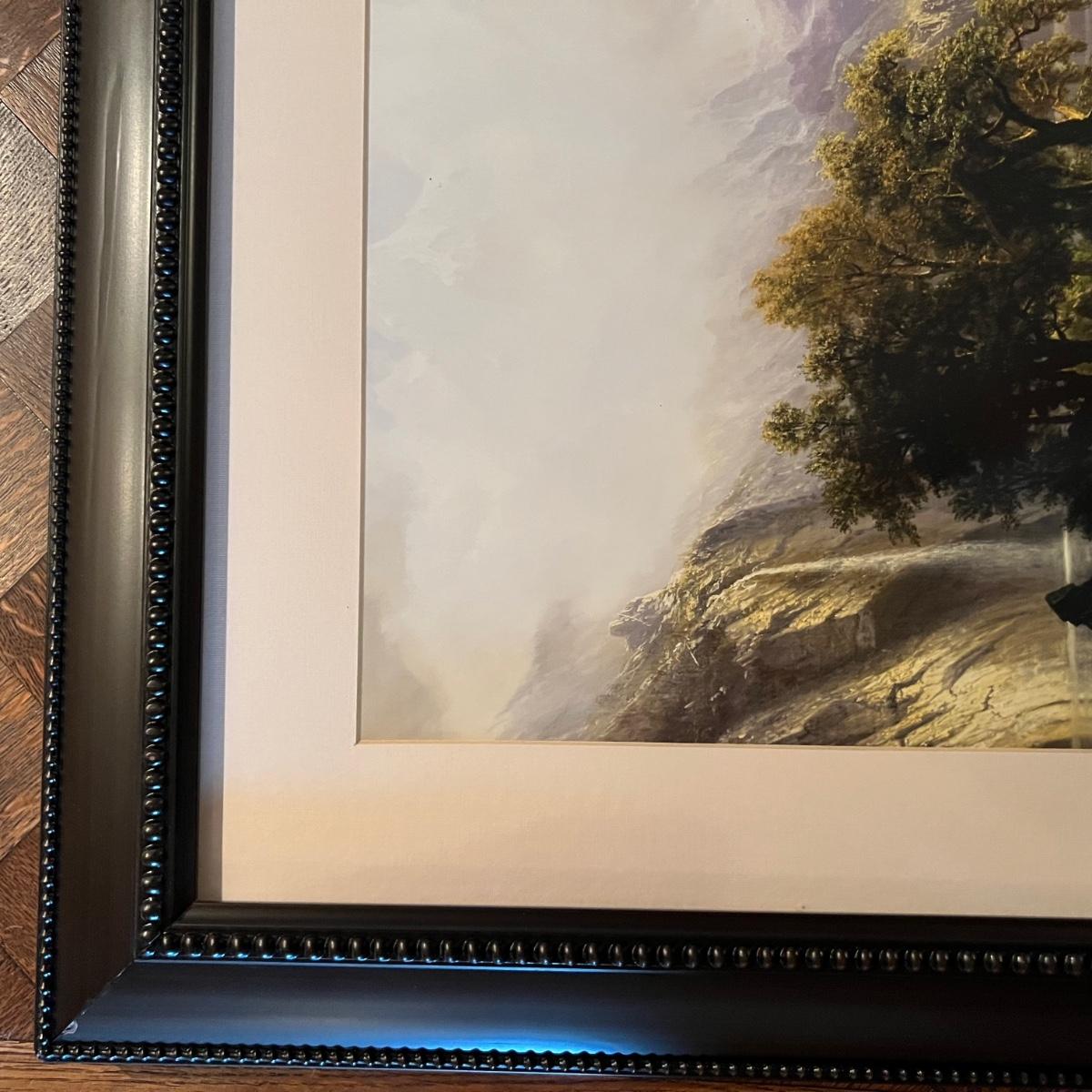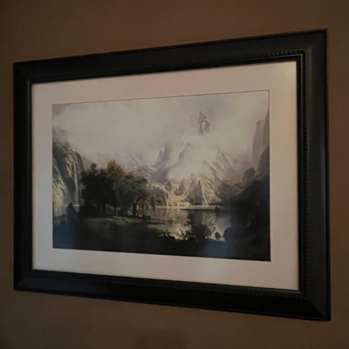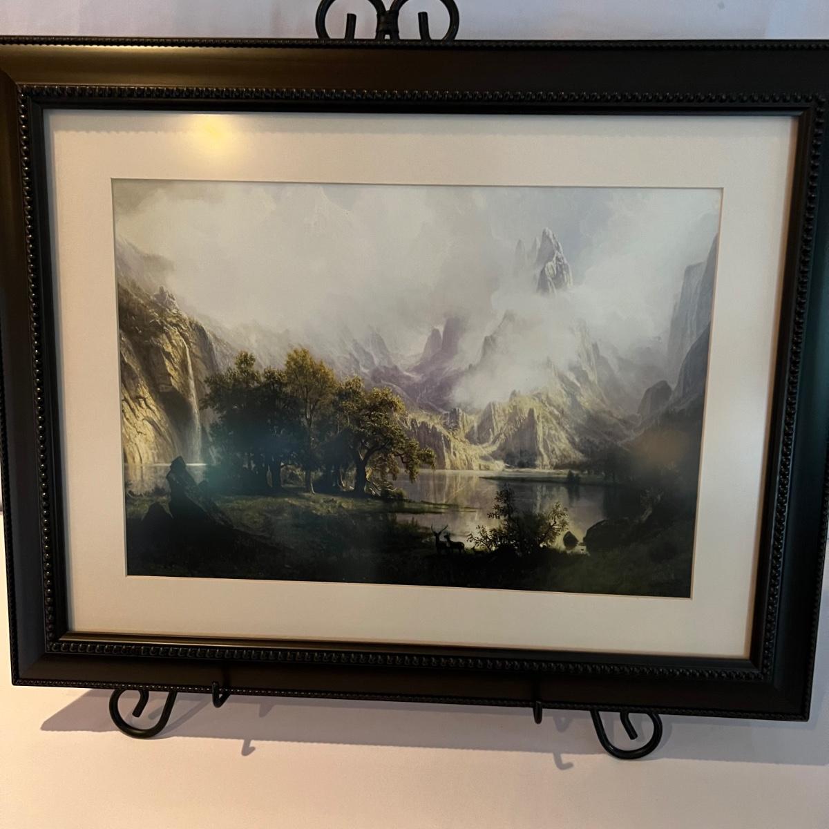 Lake landscape scene by Albert Bierstadt is a print framed in wood with glass and a single mat. Art measures 28” x 22”.